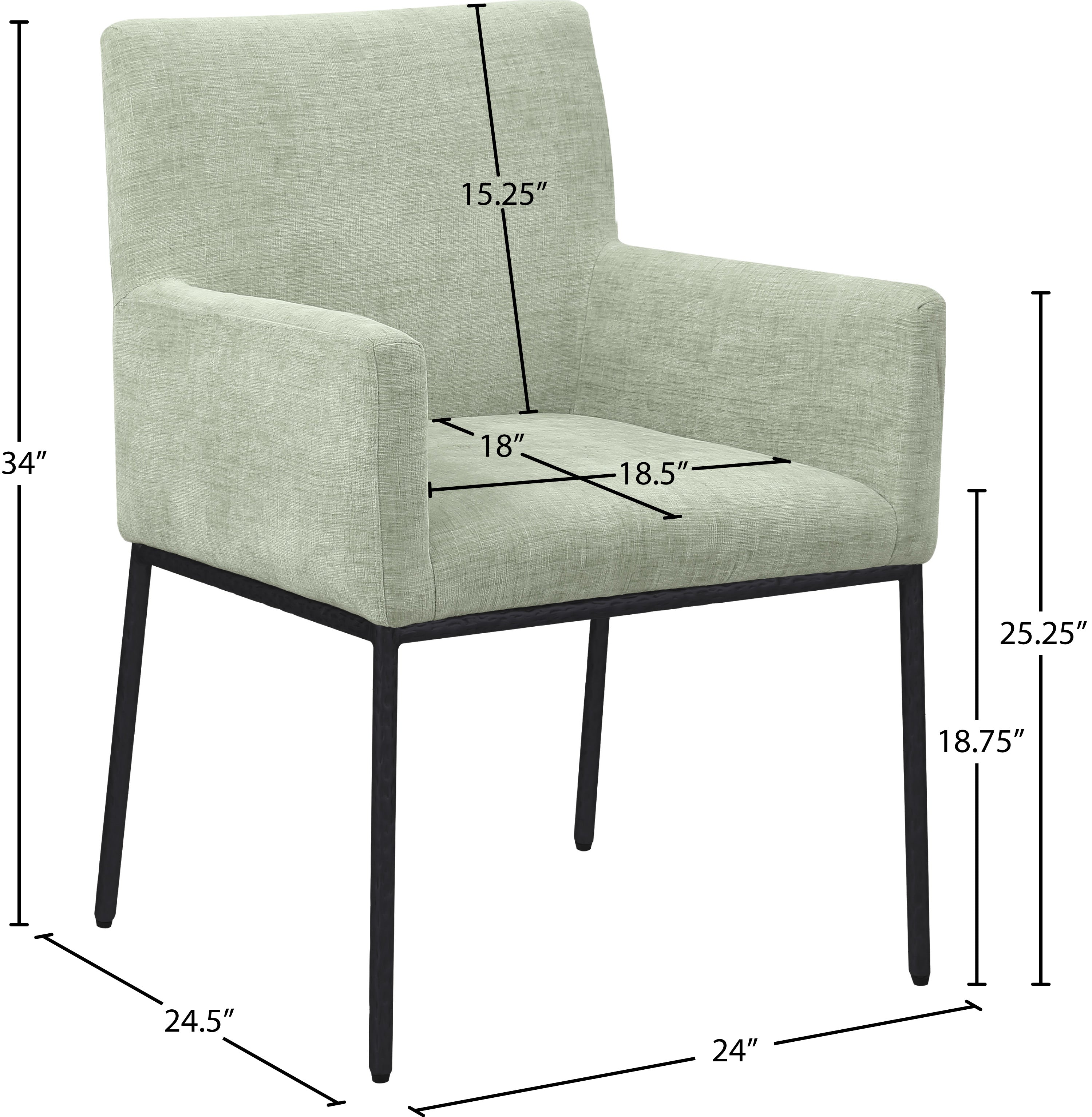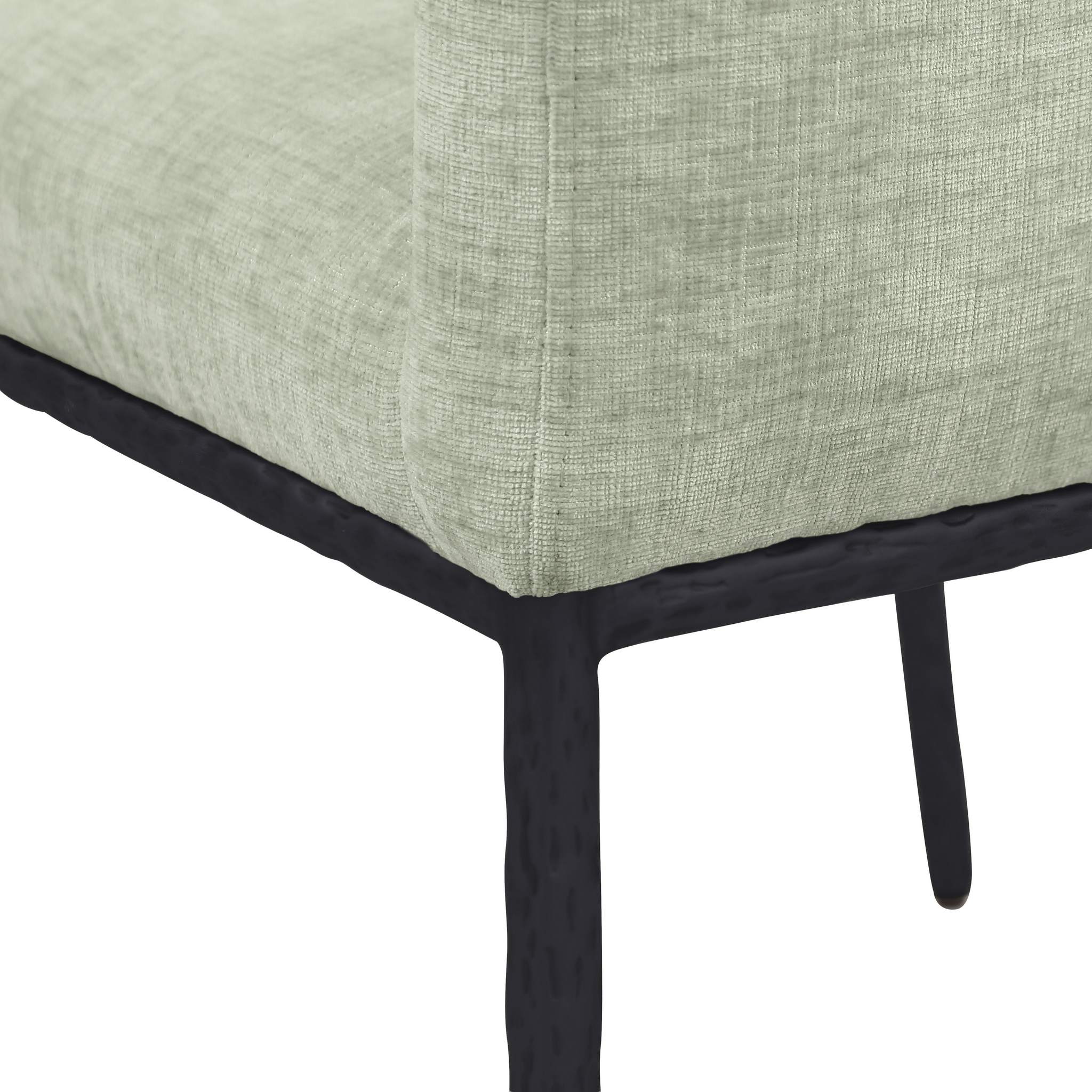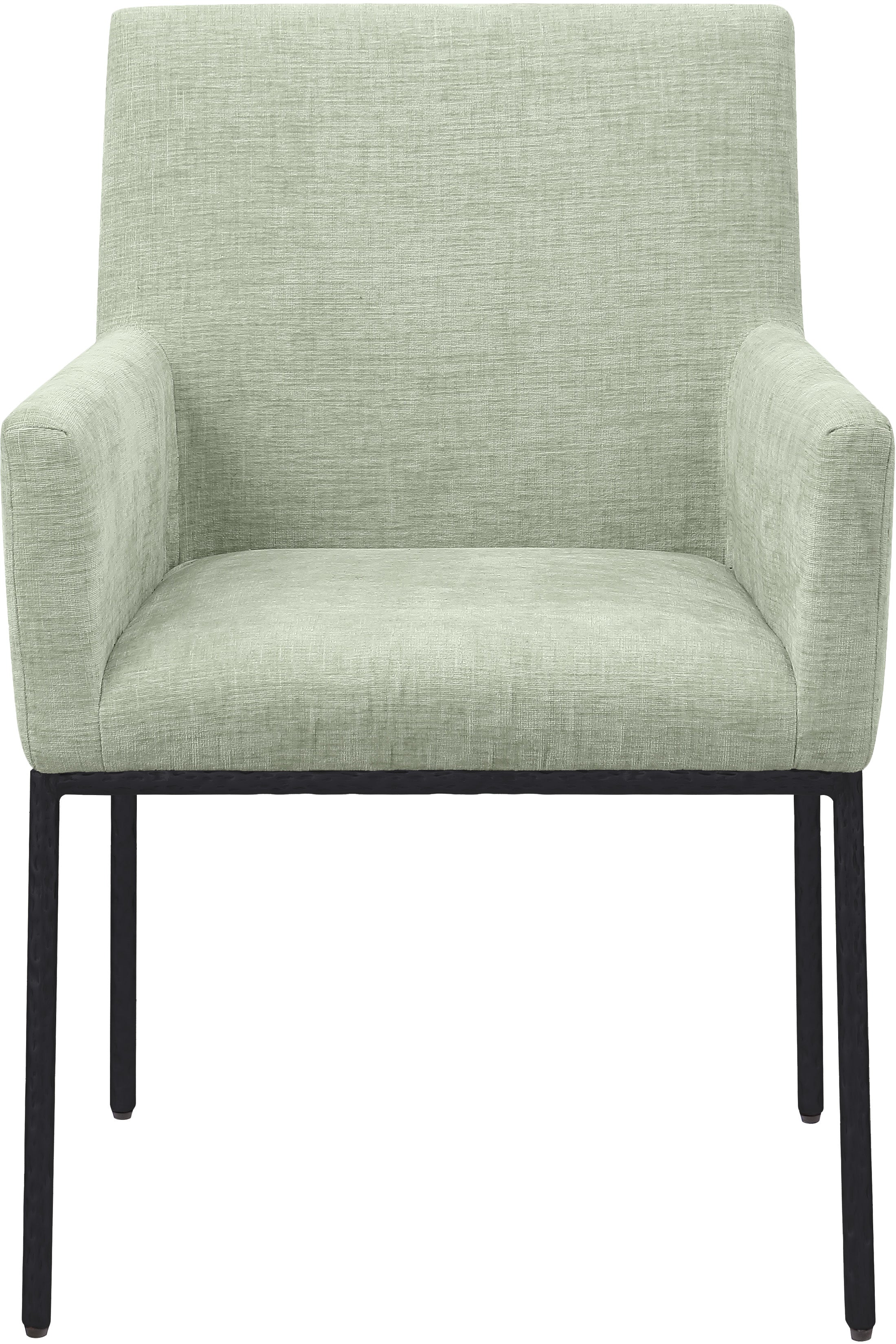 Casual comfort is the order of the day when dinner guests relax from the cozy confines of this Reeves mint chenille fabric dining chair. Sumptuously padded arms, back, and seat ensure total comfort from appetizers through dessert, and the neutral, solid-colored upholstered makes it easy to pair this dining chair with the table of your choice. An all-metal frame matte black and legs lend a contemporary finish and impeccable sturdiness and strength for long-term enjoyment.