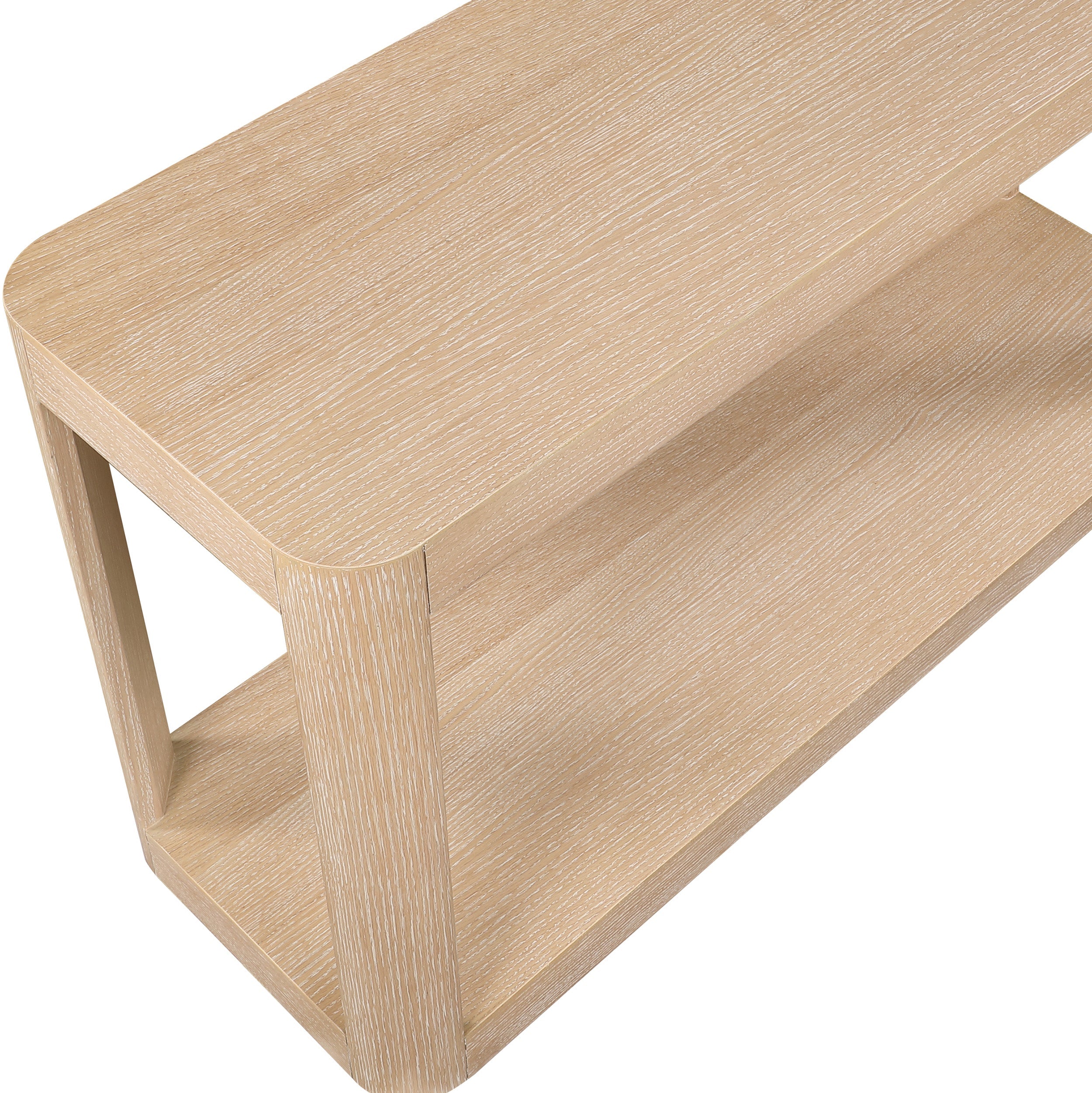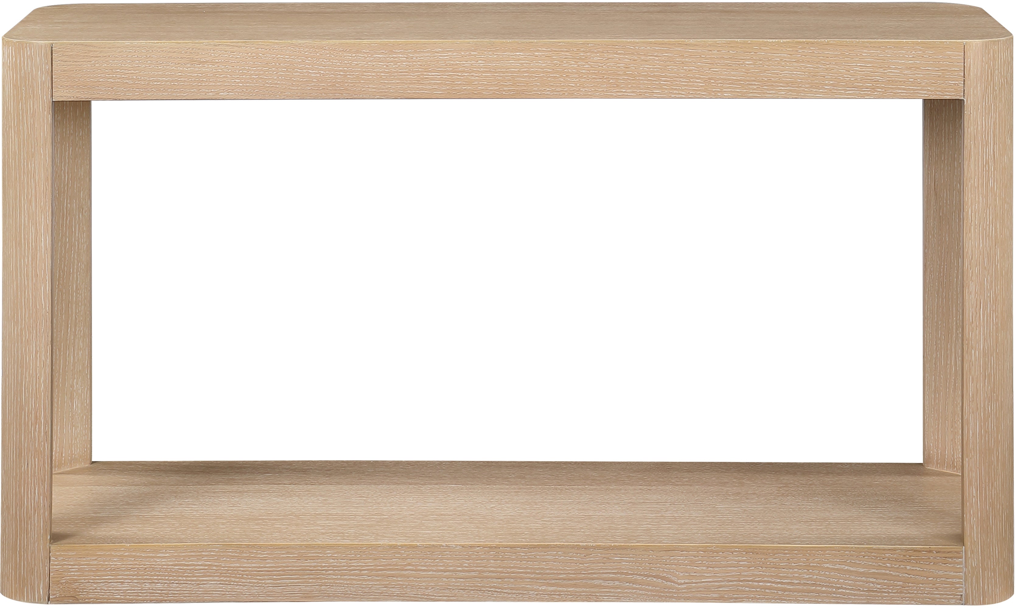 Bring home the Reeves Natural Console Table to give your room a fresh new look. This art deco console table features a sleek design with rounded corners and a bottom shelf ideal for storing items you use most handily nearby. Oak veneer and solid wood with MDF construction give the table a sturdy demeanor, so it holds up to use by your busy family. A chic natural finish and natural wood grain variation ensure this console table blends nicely with existing decor in your modern home.
