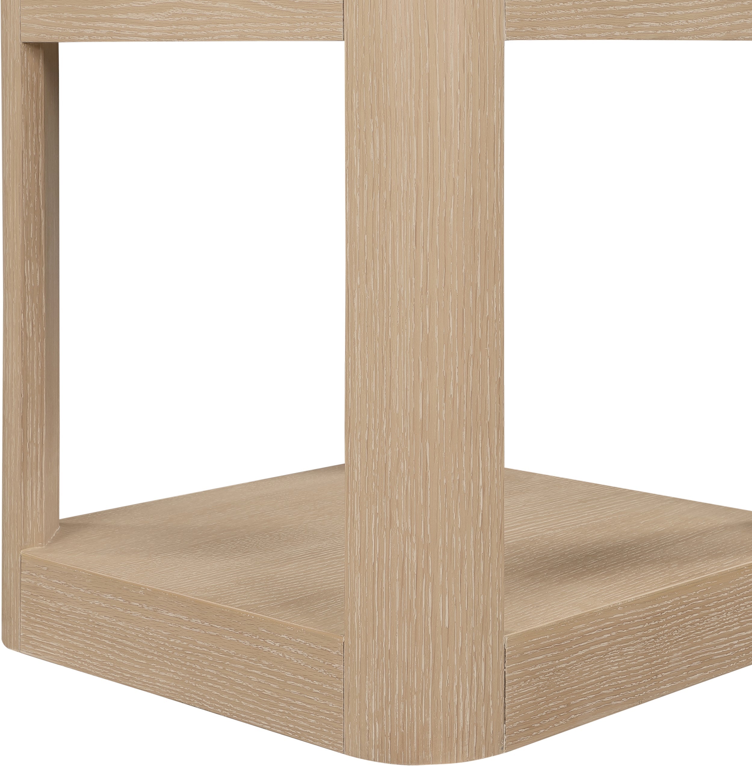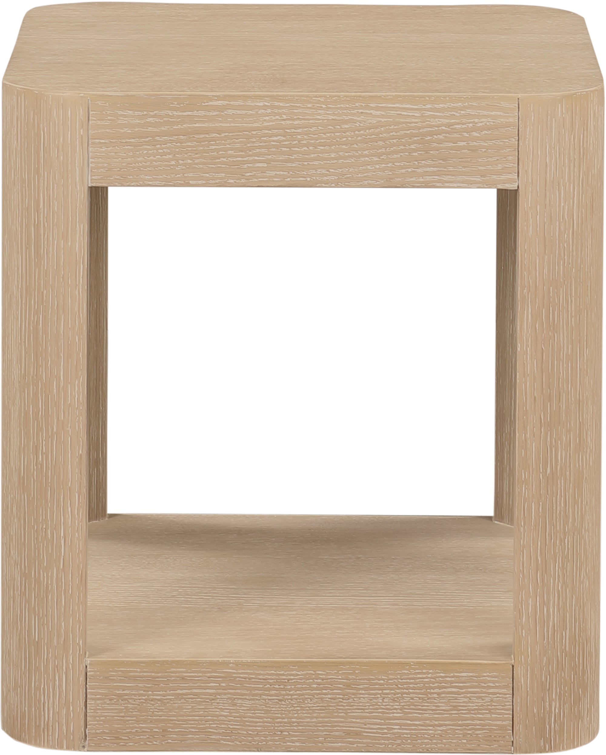 Bring home the Reeves Natural End Table to give your room a fresh new look. This art deco end table features a sleek design with rounded corners and a bottom shelf ideal for storing items you use most handily nearby. Oak veneer and solid wood with MDF construction give the table a sturdy demeanor, so it holds up to use by your busy family. A chic natural finish and natural wood grain variation ensure that this end table blends nicely with existing decor in your modern home.