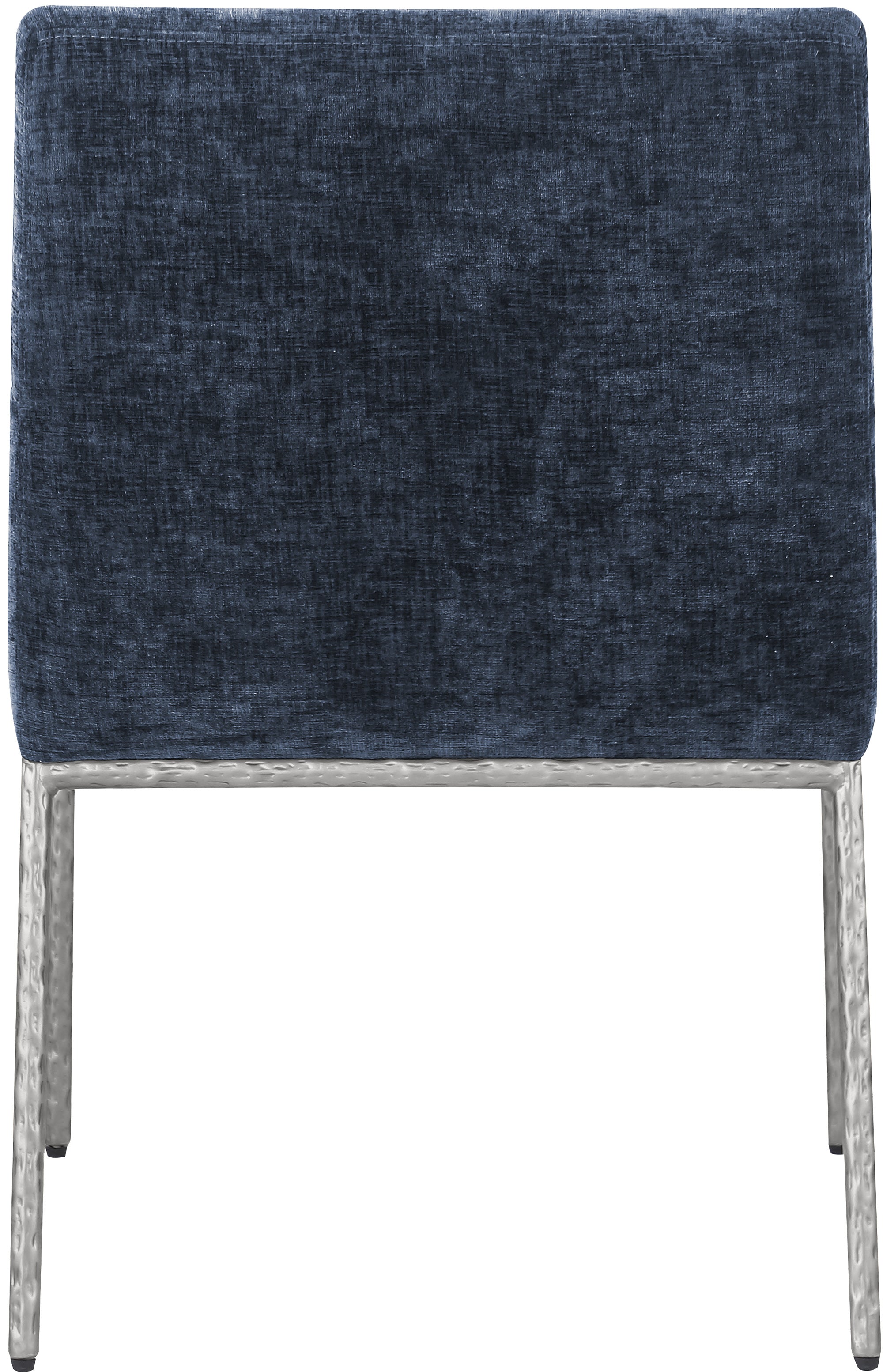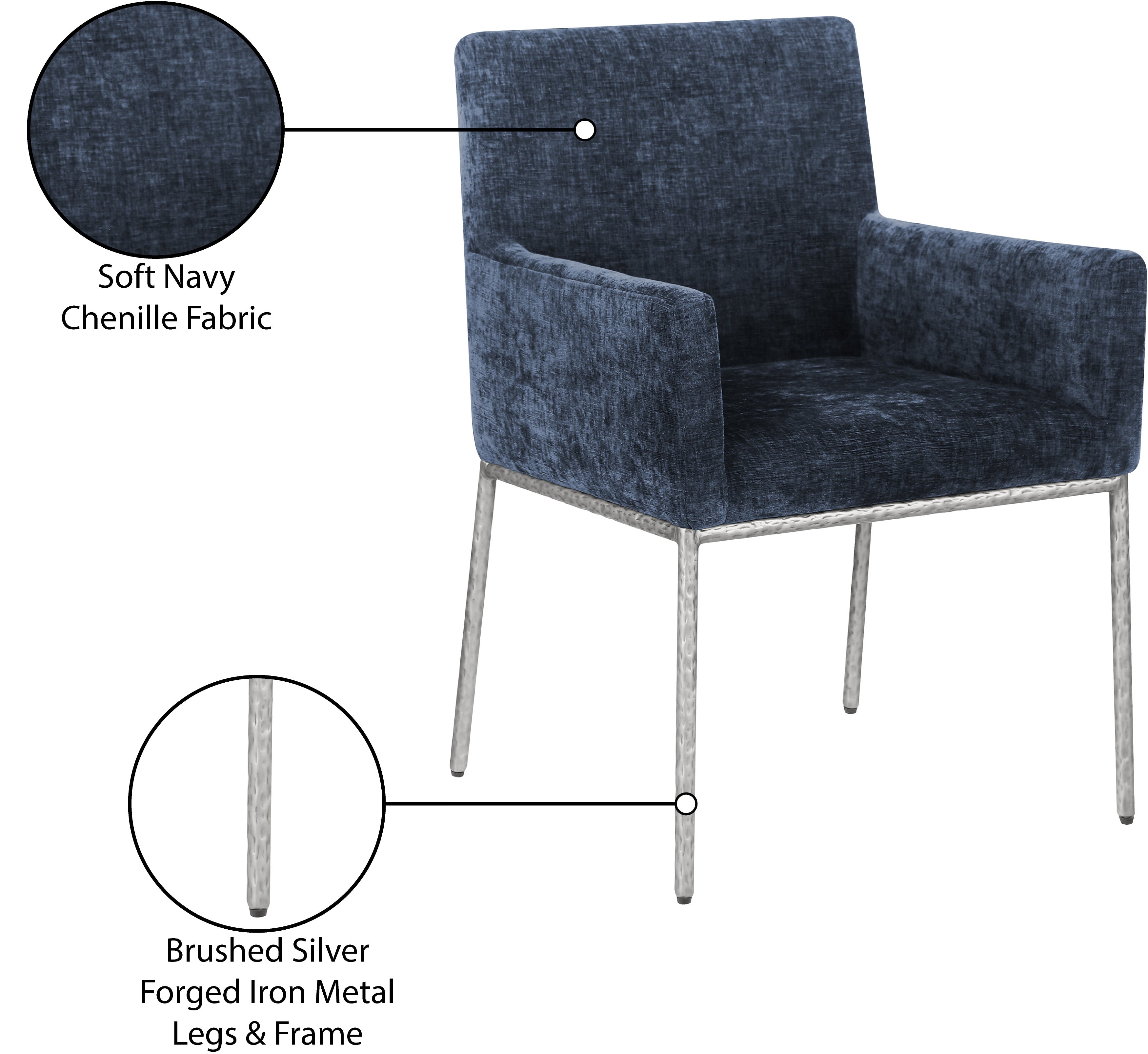 Casual comfort is the order of the day when dinner guests relax from the cozy confines of this Reeves soft navy chenille fabric dining chair. Sumptuously padded arms, back, and seat ensure total comfort from appetizers through dessert, and the neutral, solid-colored upholstered makes it easy to pair this dining chair with the table of your choice. An all-metal brushed silver frame and legs lend a contemporary finish and impeccable sturdiness and strength for long-term enjoyment.