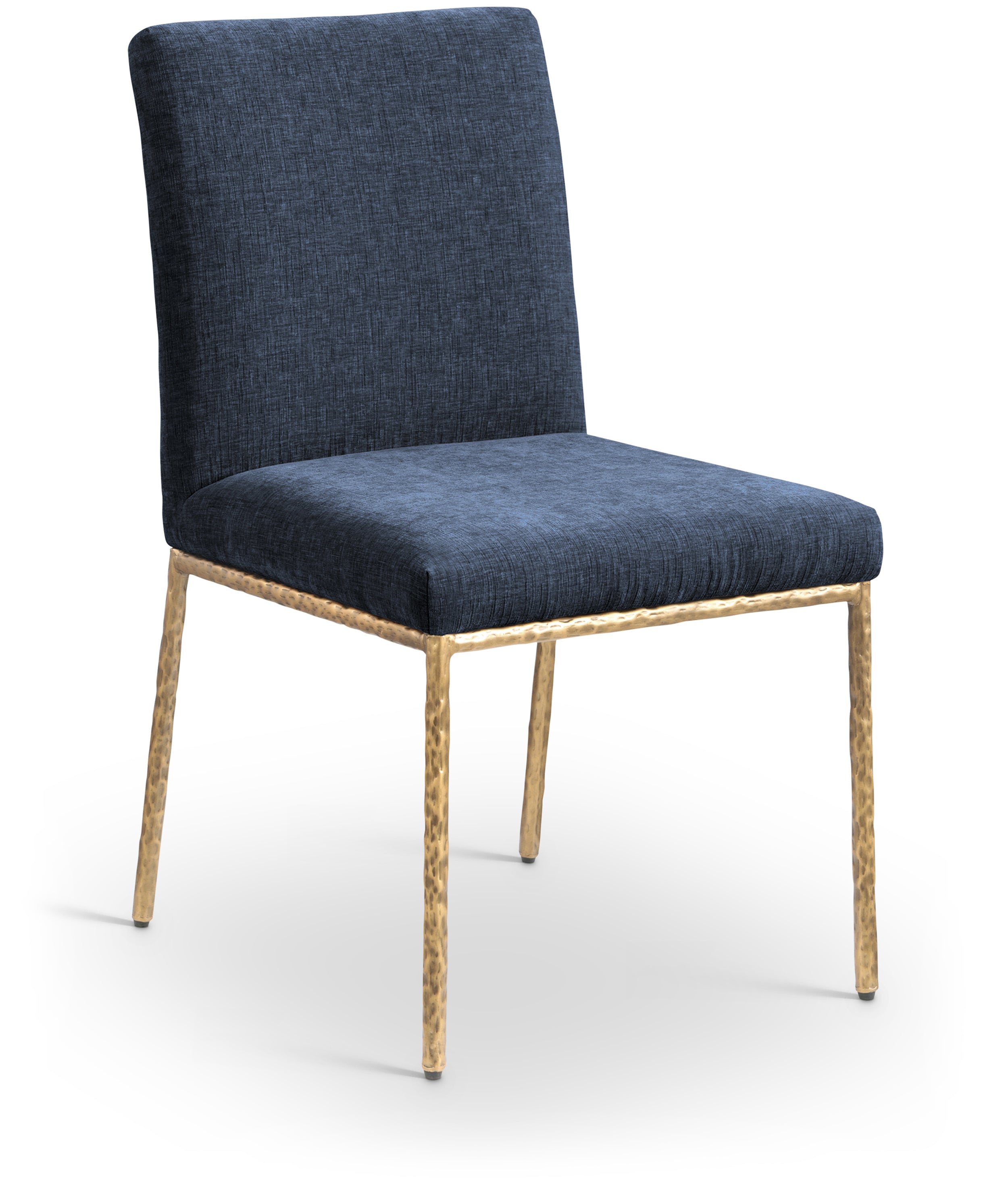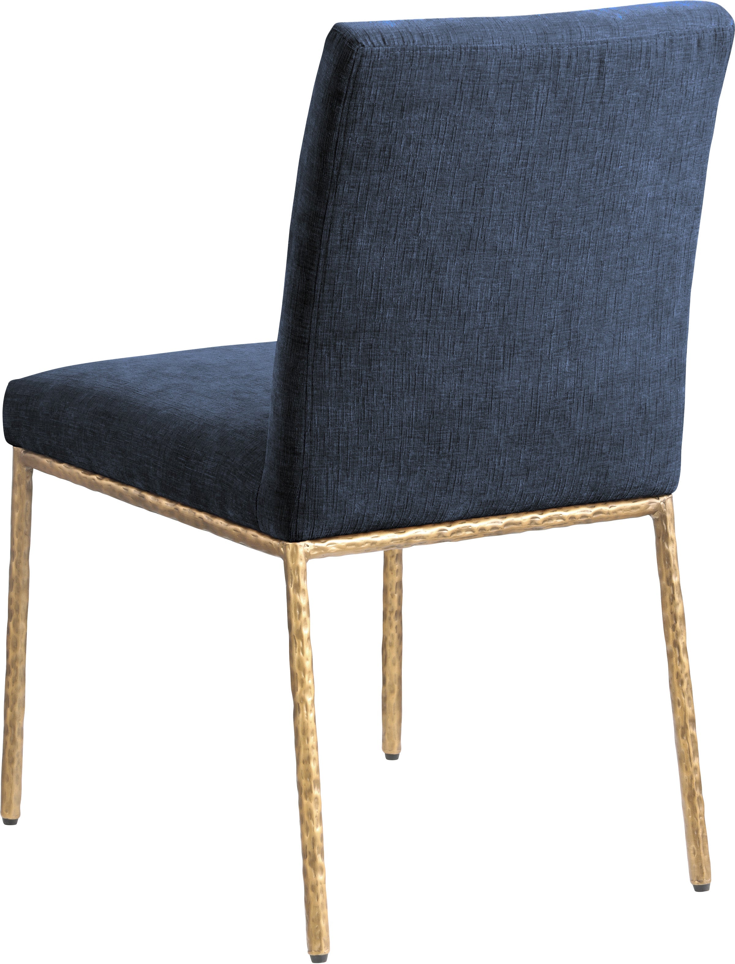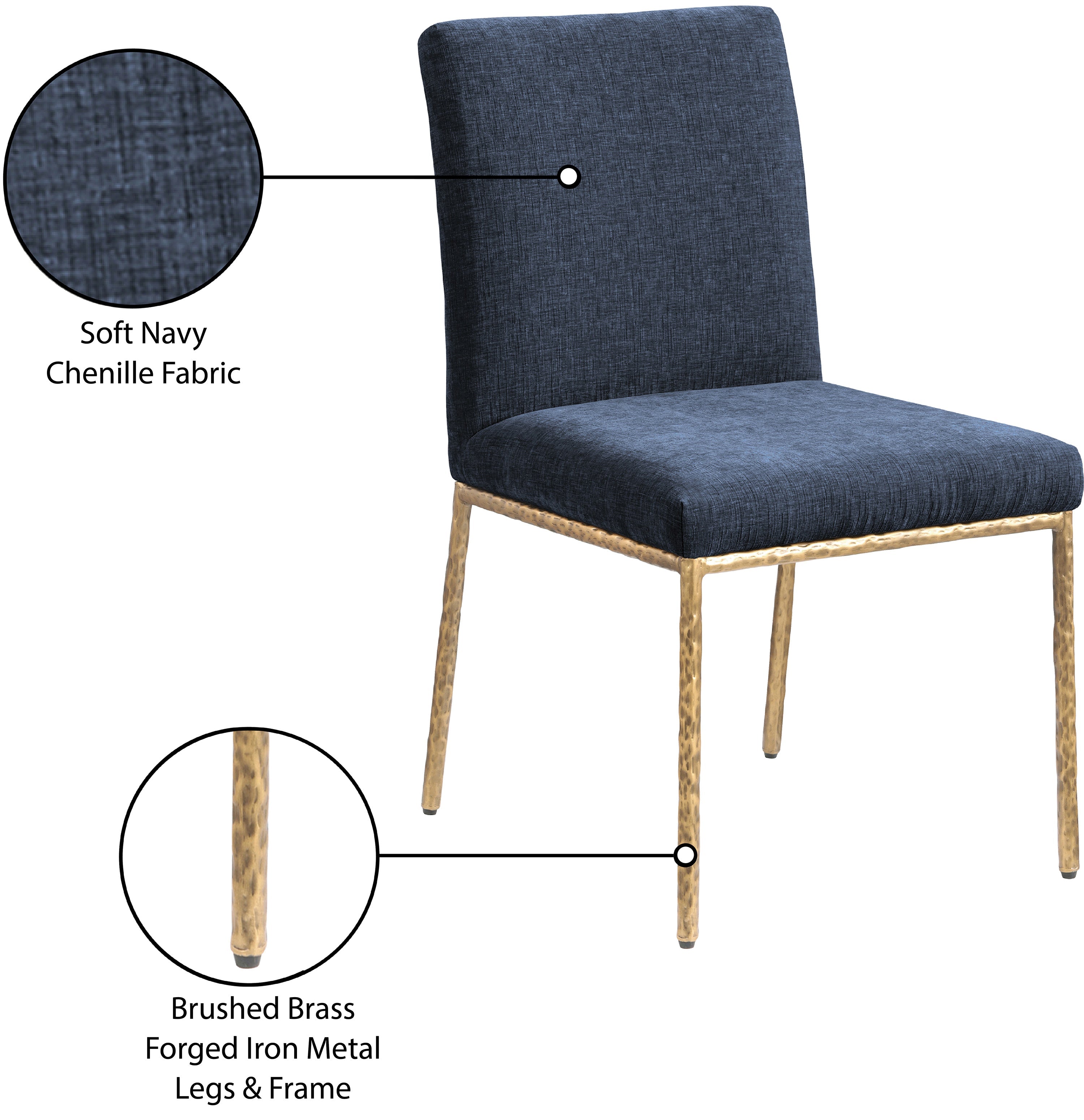 With an effortless sophistication, the Reeves navy chenille fabric upholstered dining side chair elevates your dining space with its soft fabric and elegantly textured design. Supported by sturdy, hand-forged brushed brass metal legs, this chair blends refined comfort with artisanal craftsmanship. Its clean silhouette and plush upholstery make it a perfect addition to modern and transitional interiors, offering both style and everyday functionality.