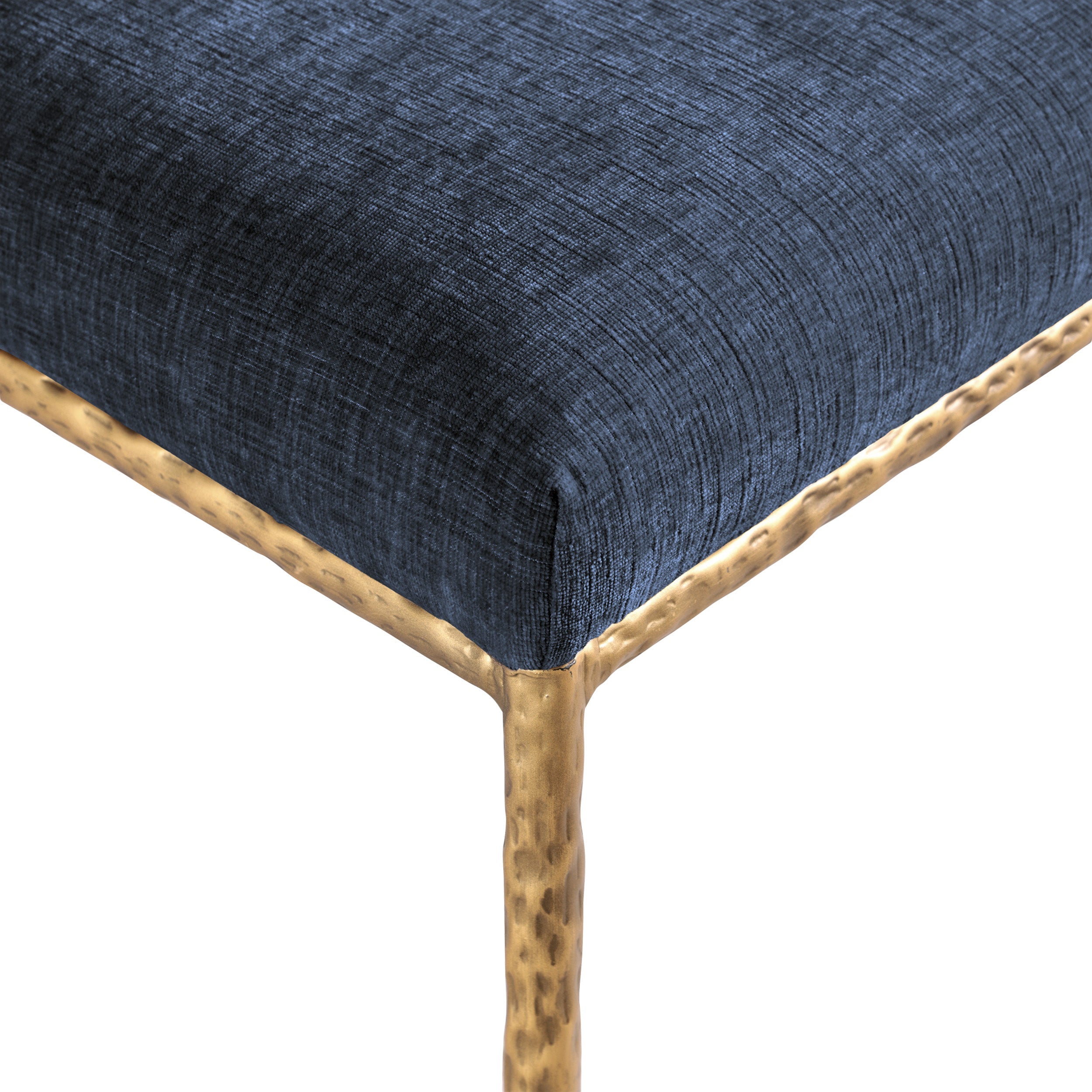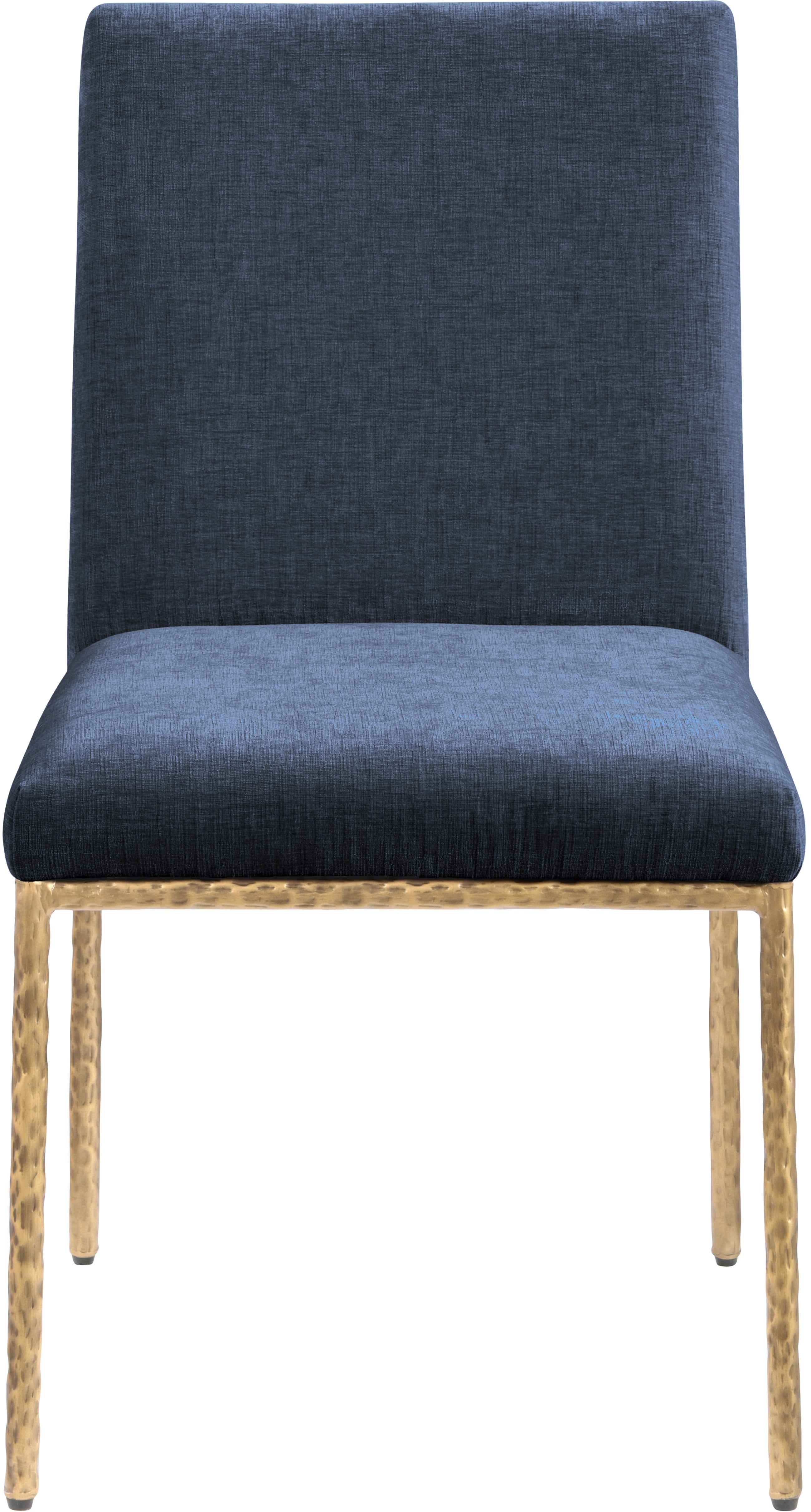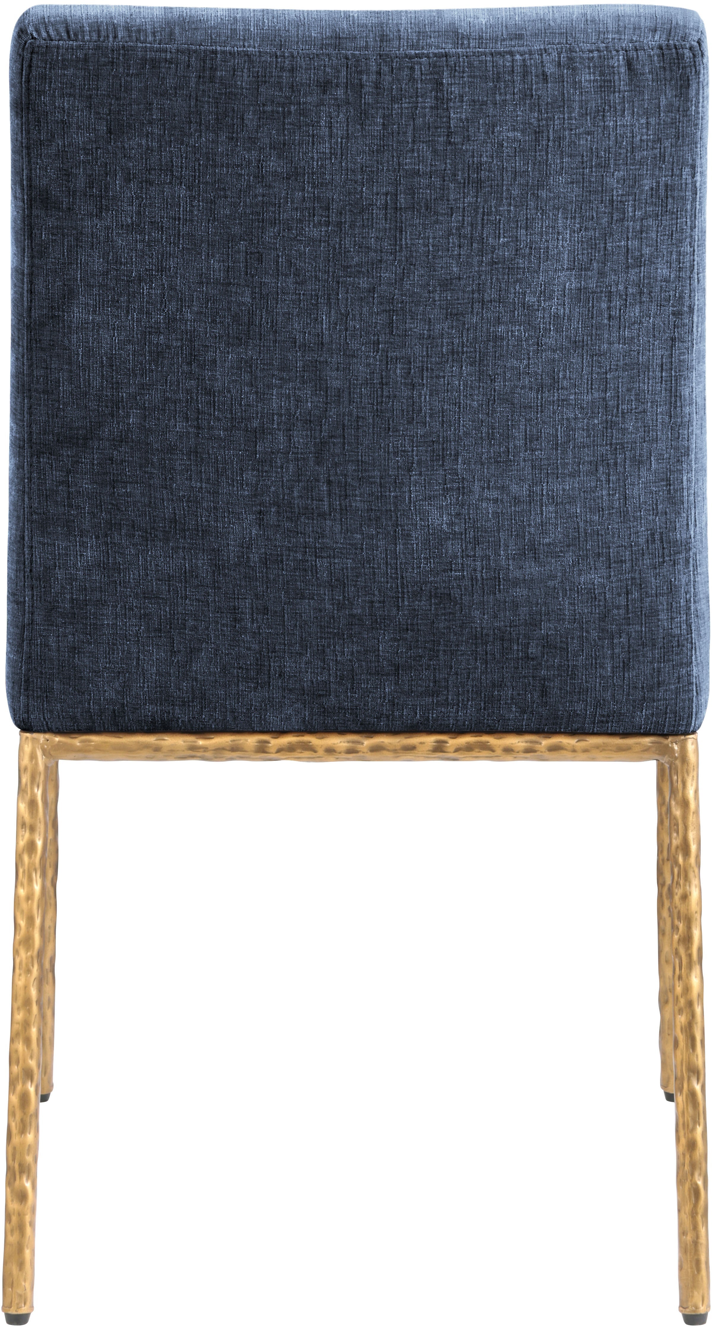 With an effortless sophistication, the Reeves navy chenille fabric upholstered dining side chair elevates your dining space with its soft fabric and elegantly textured design. Supported by sturdy, hand-forged brushed brass metal legs, this chair blends refined comfort with artisanal craftsmanship. Its clean silhouette and plush upholstery make it a perfect addition to modern and transitional interiors, offering both style and everyday functionality.