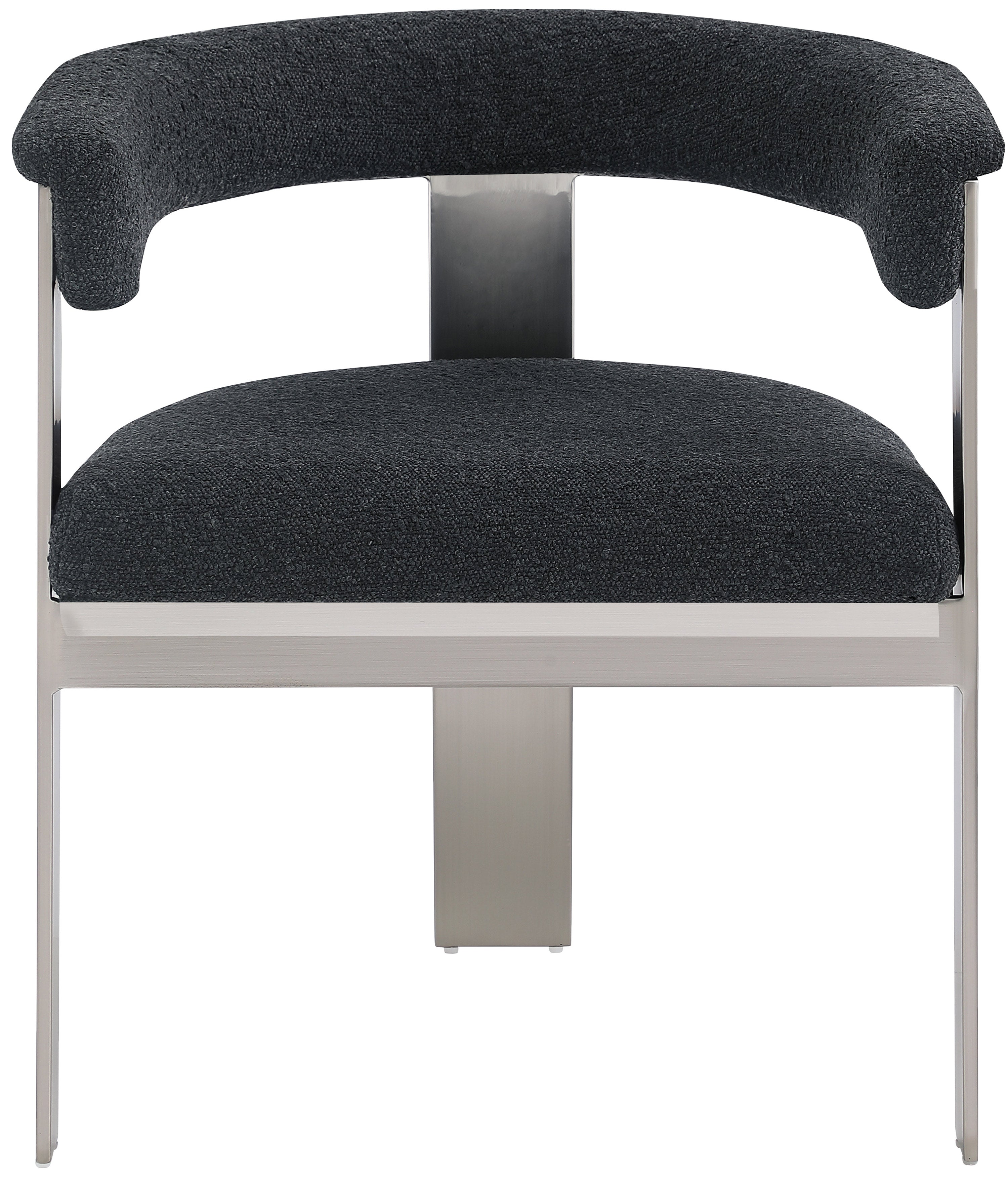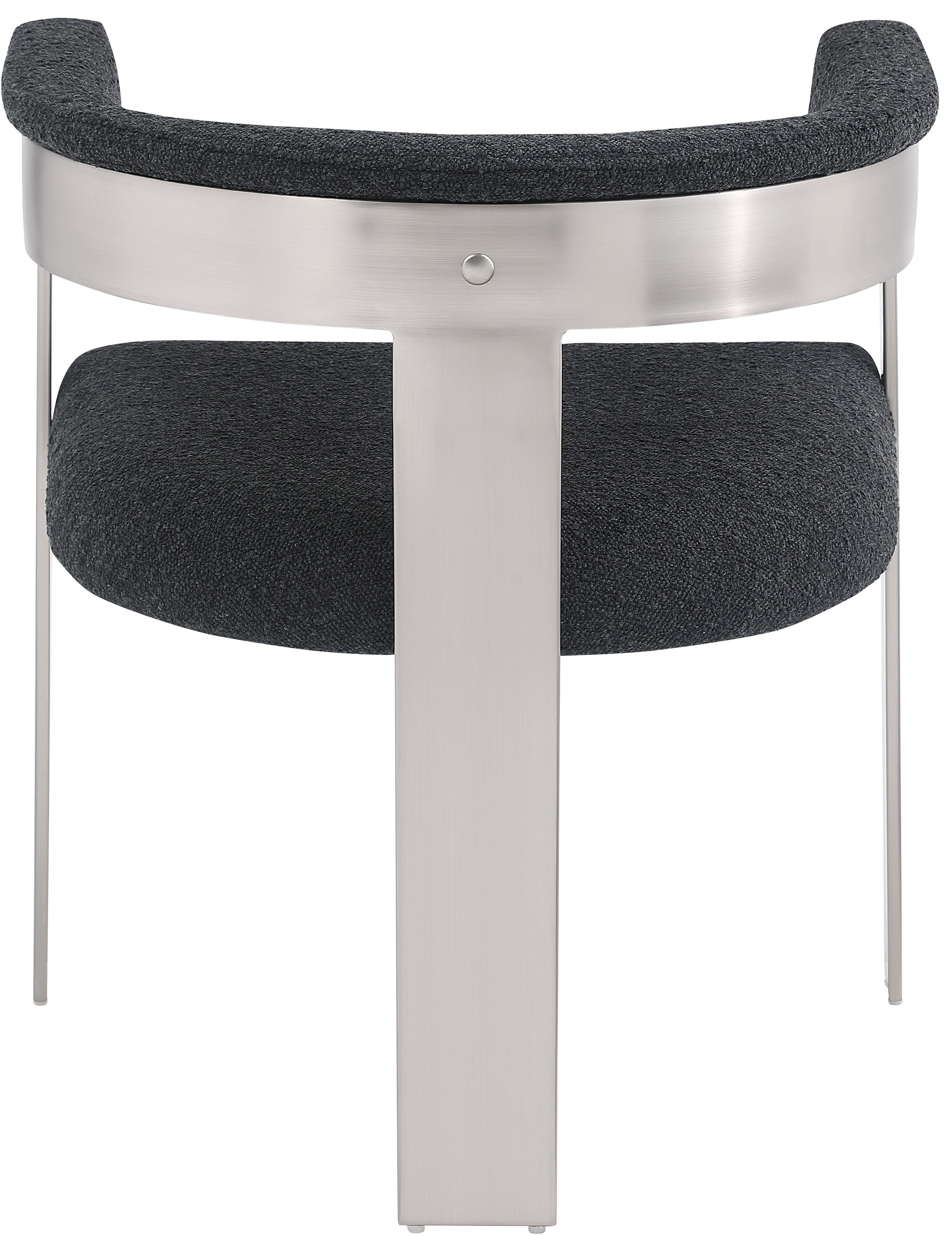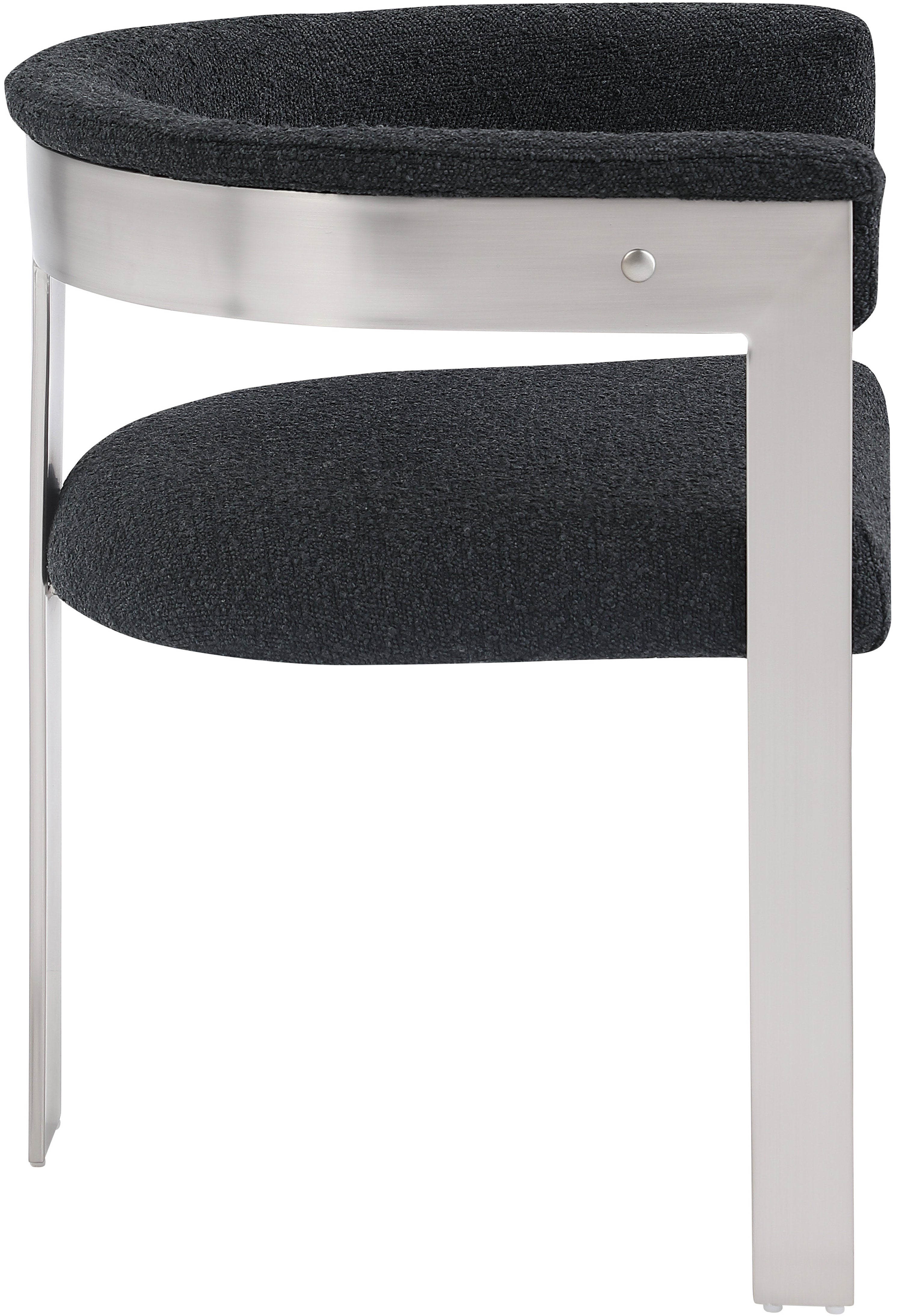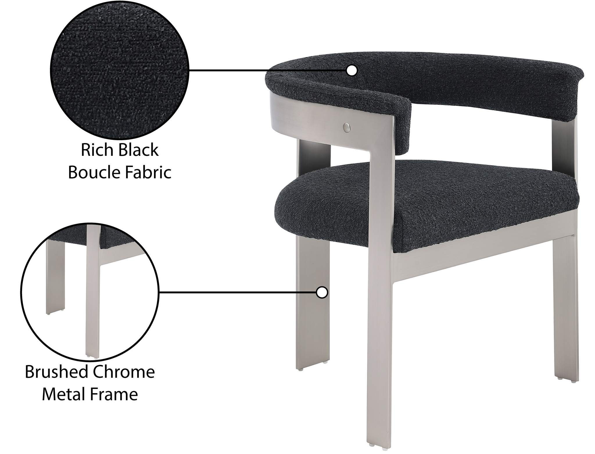 Enjoy an elevated dining experience when you bring home these black Romeo boucle dining chairs, sold as a set of two. Featuring seats and backs upholstered in soft black boucle fabric, these chairs offer both style and comfort. The brushed chrome metal frames add a contemporary touch, making this pair of dining chairs a chic addition to your dining area. The curved backs provide not only a sleek look but also optimal support for the body, ensuring diners are relaxed from appetizers through dessert.