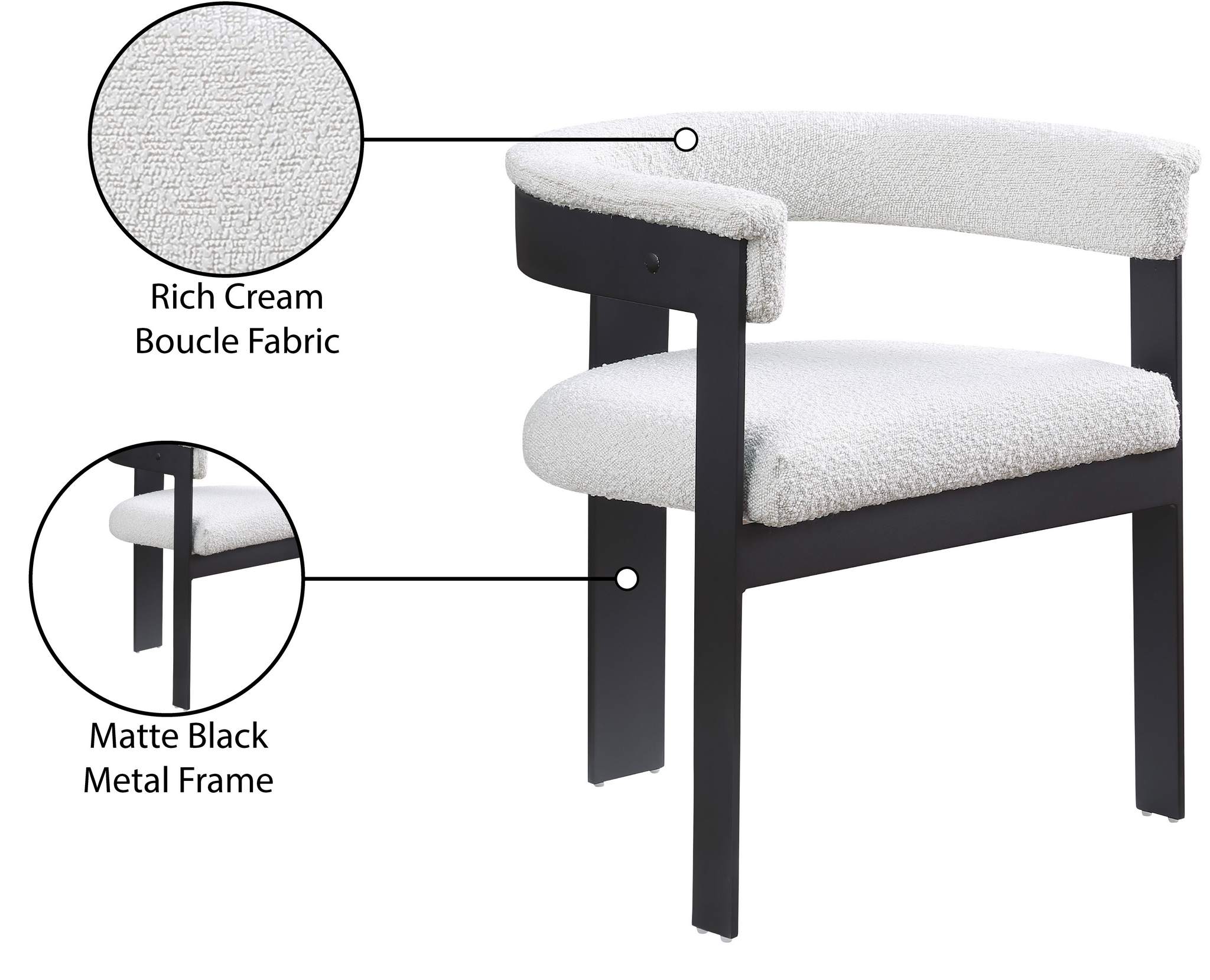 Rehab your dining area with these cream Romeo boucle dining chairs, sold as a set of two. These chairs offer both style and comfort, with soft cream boucle seats and backs providing a sleek and inviting look that meshes well with an array of dining tables. The matte black metal frame ensures durability and modern aesthetic appeal, while the chairs' curved backs deliver lumbar support for a relaxed dining experience.