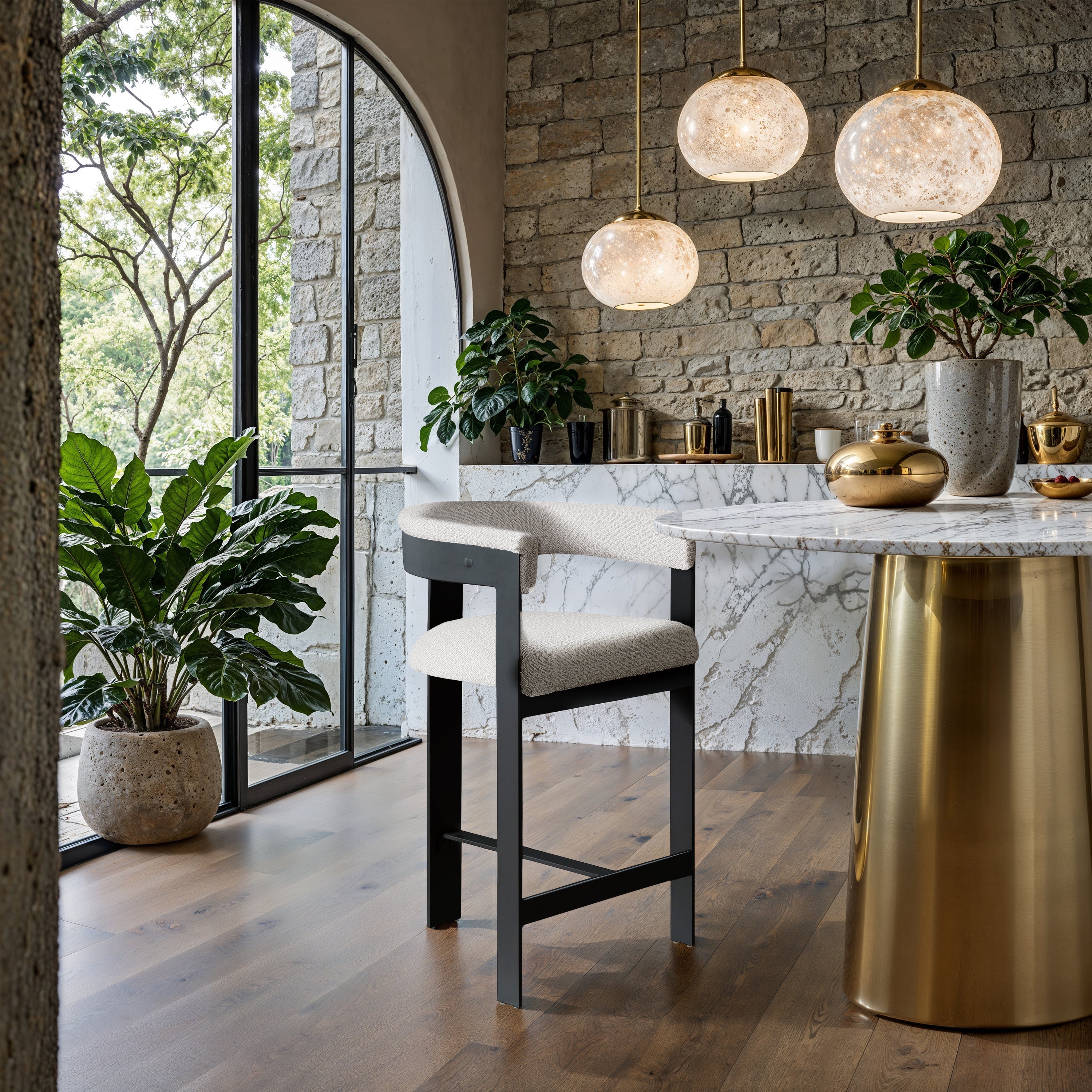 Update your kitchen counter or home bar with this cream Romeo boucle stool. It boasts a soft cream boucle seat and a curved back for comfortable and contemporary seating. The matte black metal frame ensures sturdiness and a sleek aesthetic, impressing family and guests alike. With its modern design, this stool effortlessly complements your space, making it a superb addition to your space.