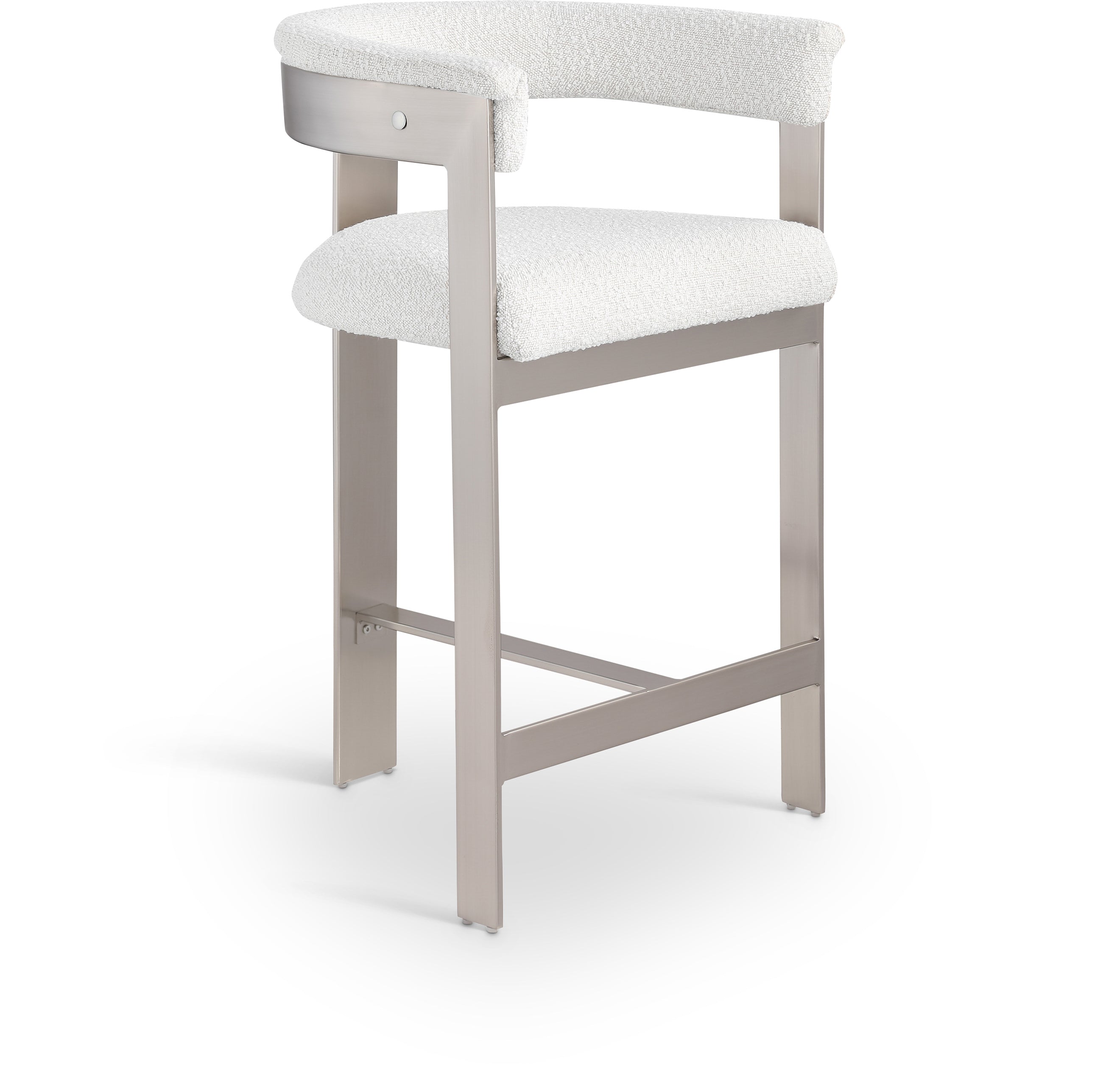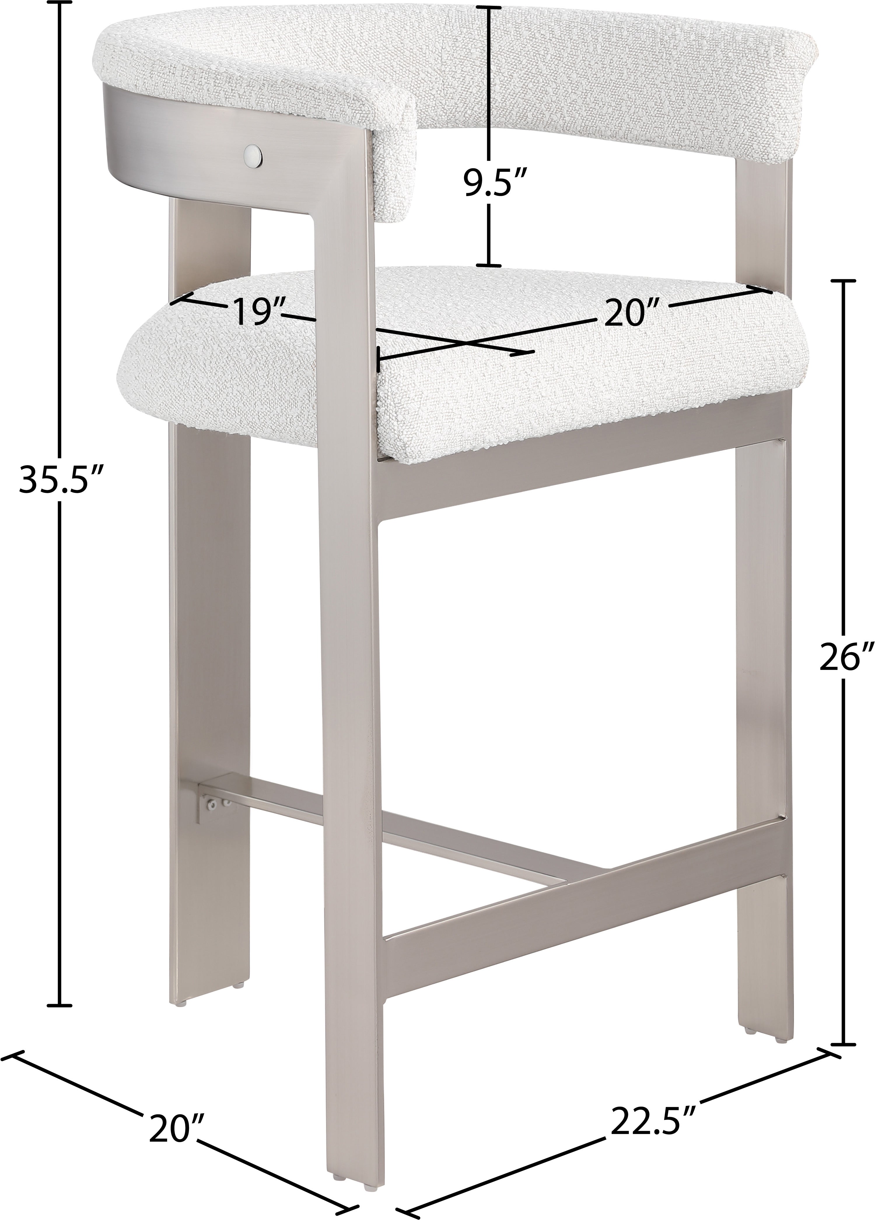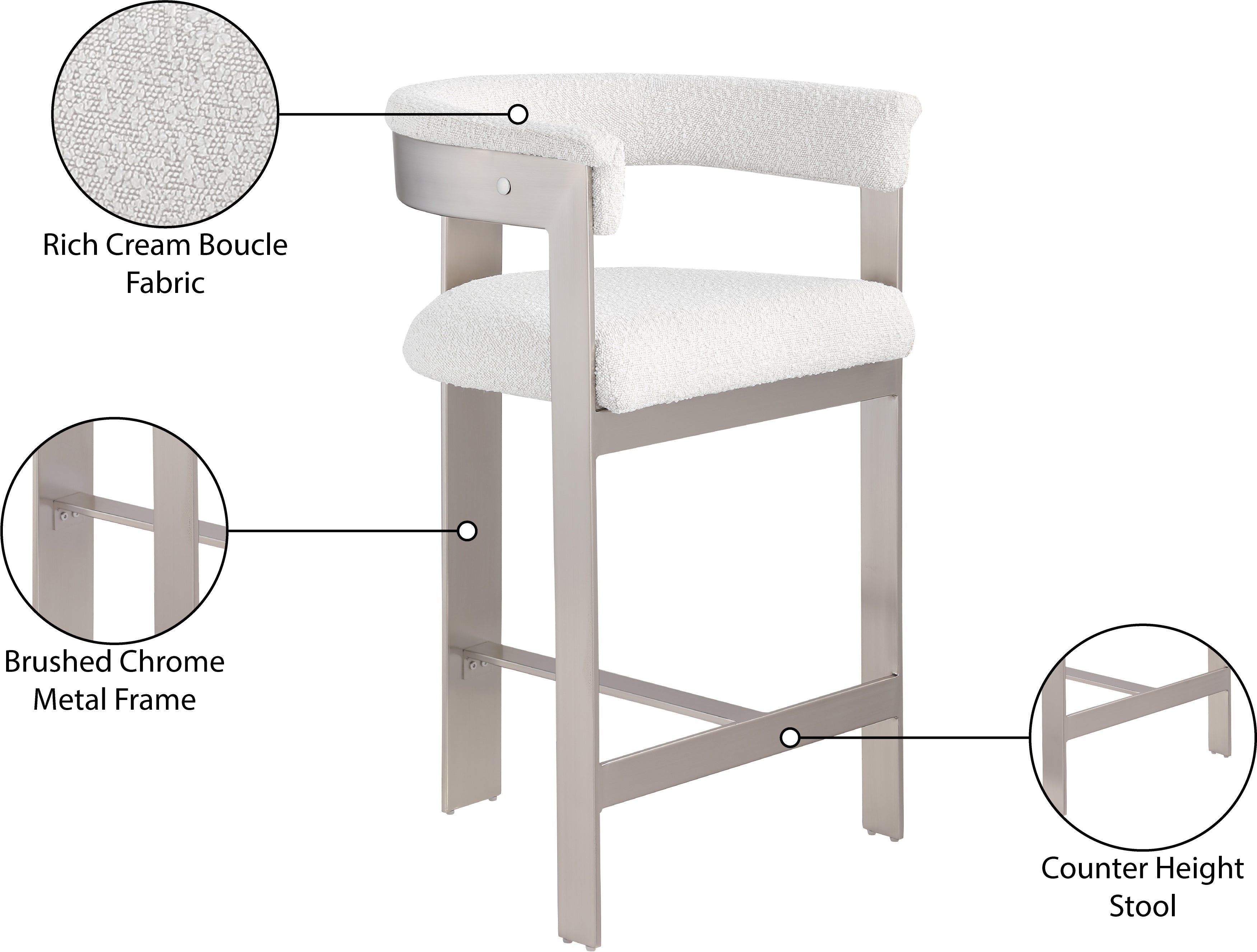 Enjoy an elevated dining experience when you bring home this cream Romeo boucle counter stool. Featuring seats and backs upholstered in soft cream boucle fabric, this stool offers both style and comfort. The brushed chrome metal frames add a contemporary touch, making this stool a chic addition to your dining area. The curved backs provide not only a sleek look but also optimal support for the body, ensuring diners are relaxed from appetizers through dessert.