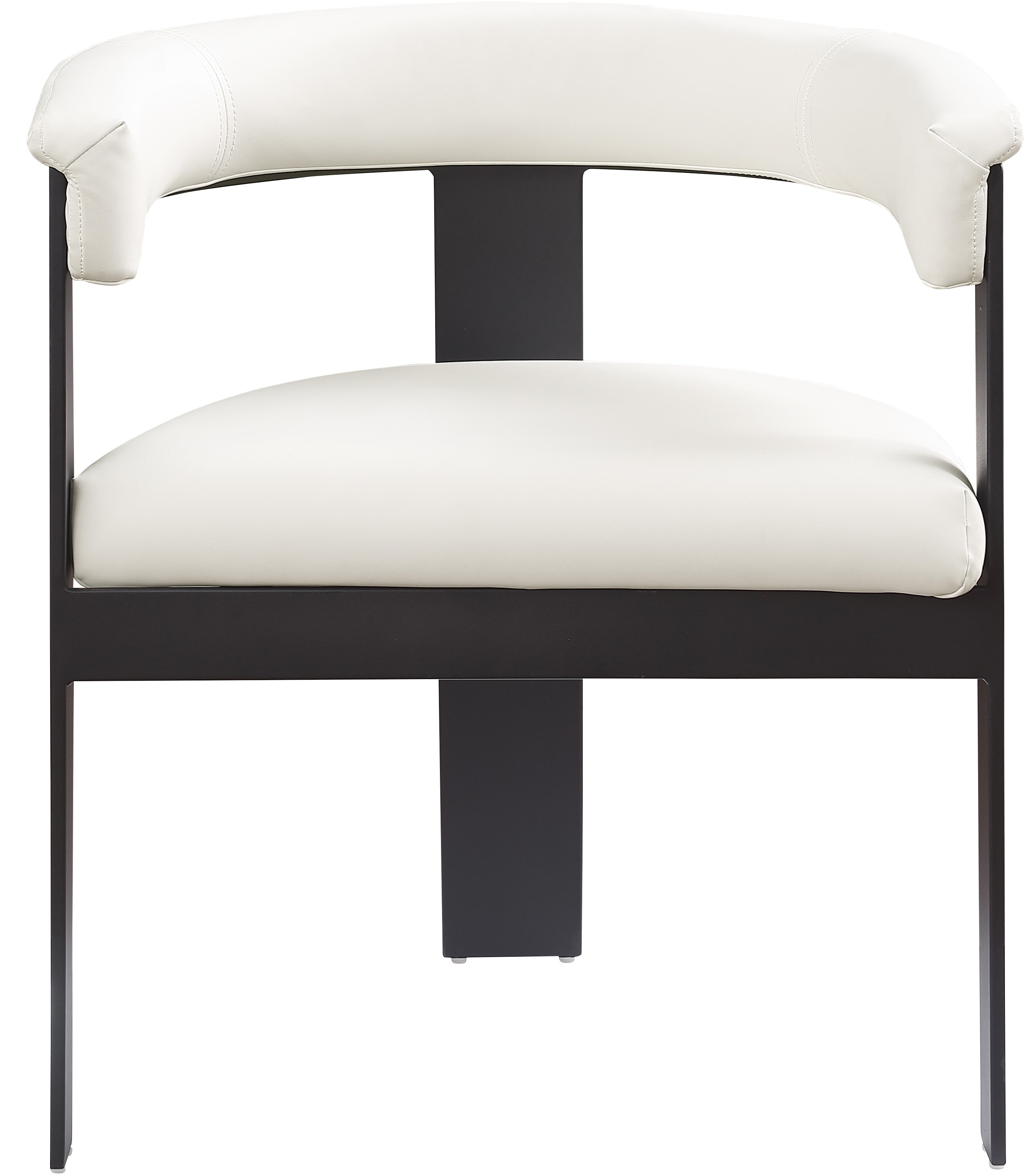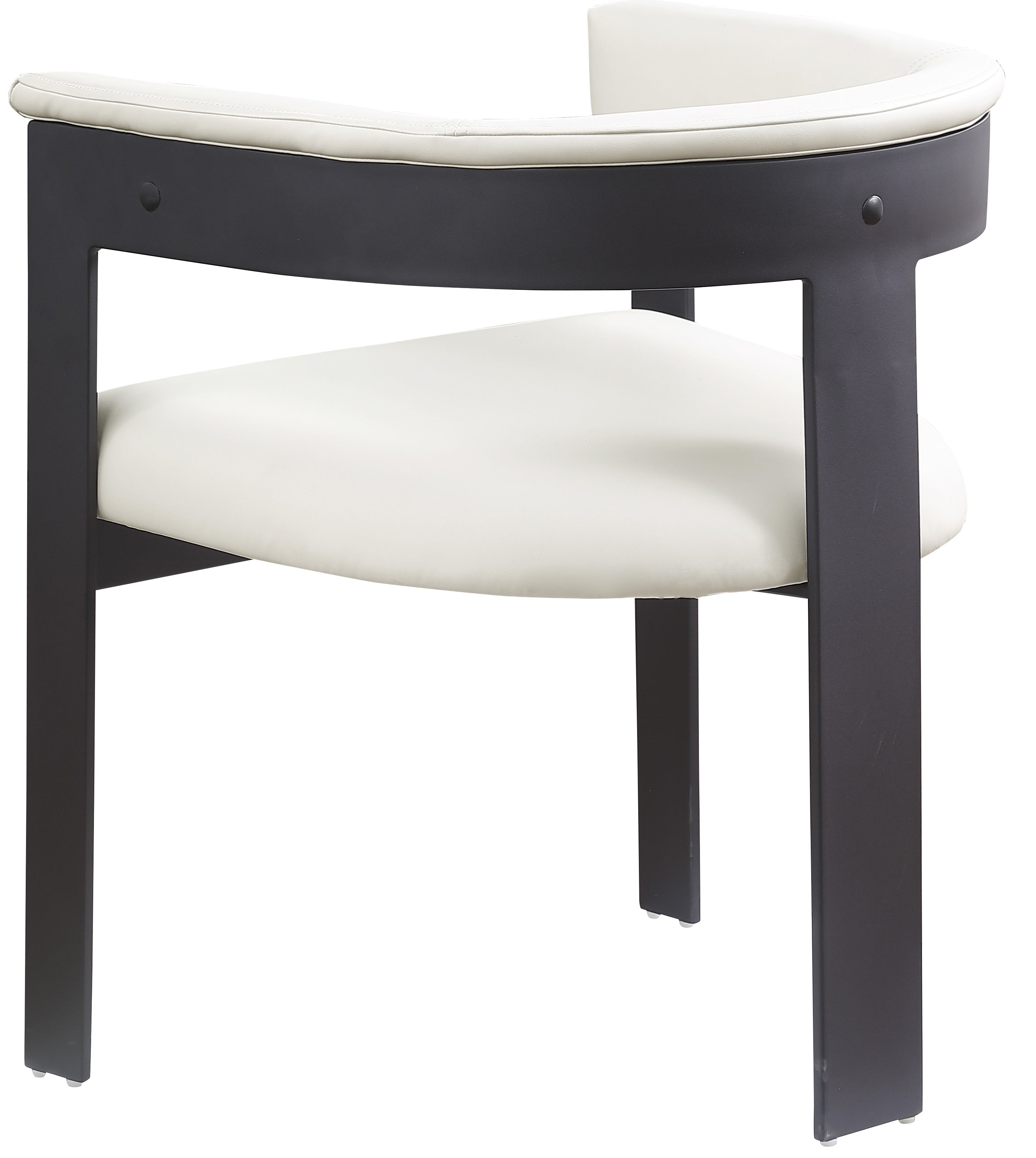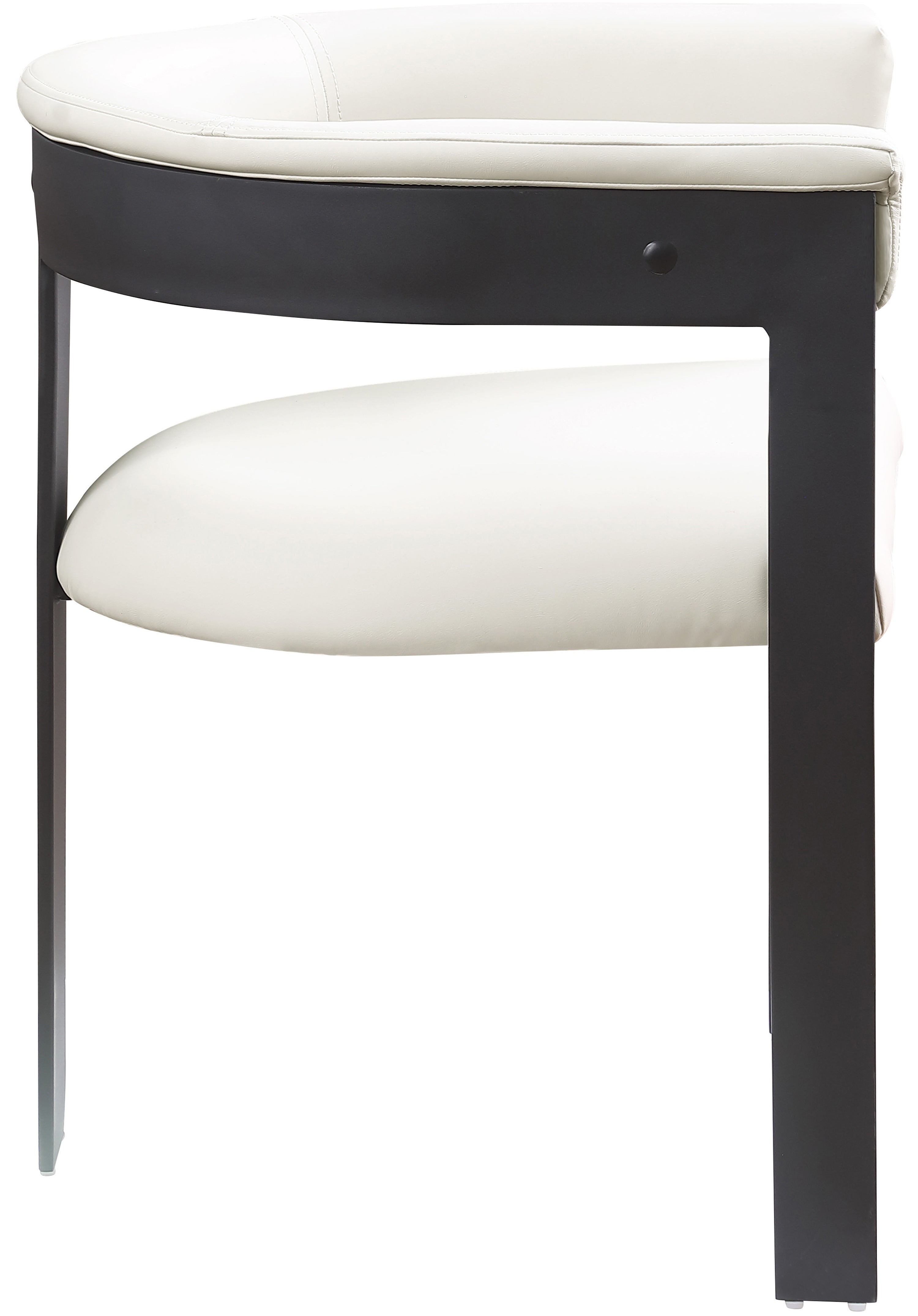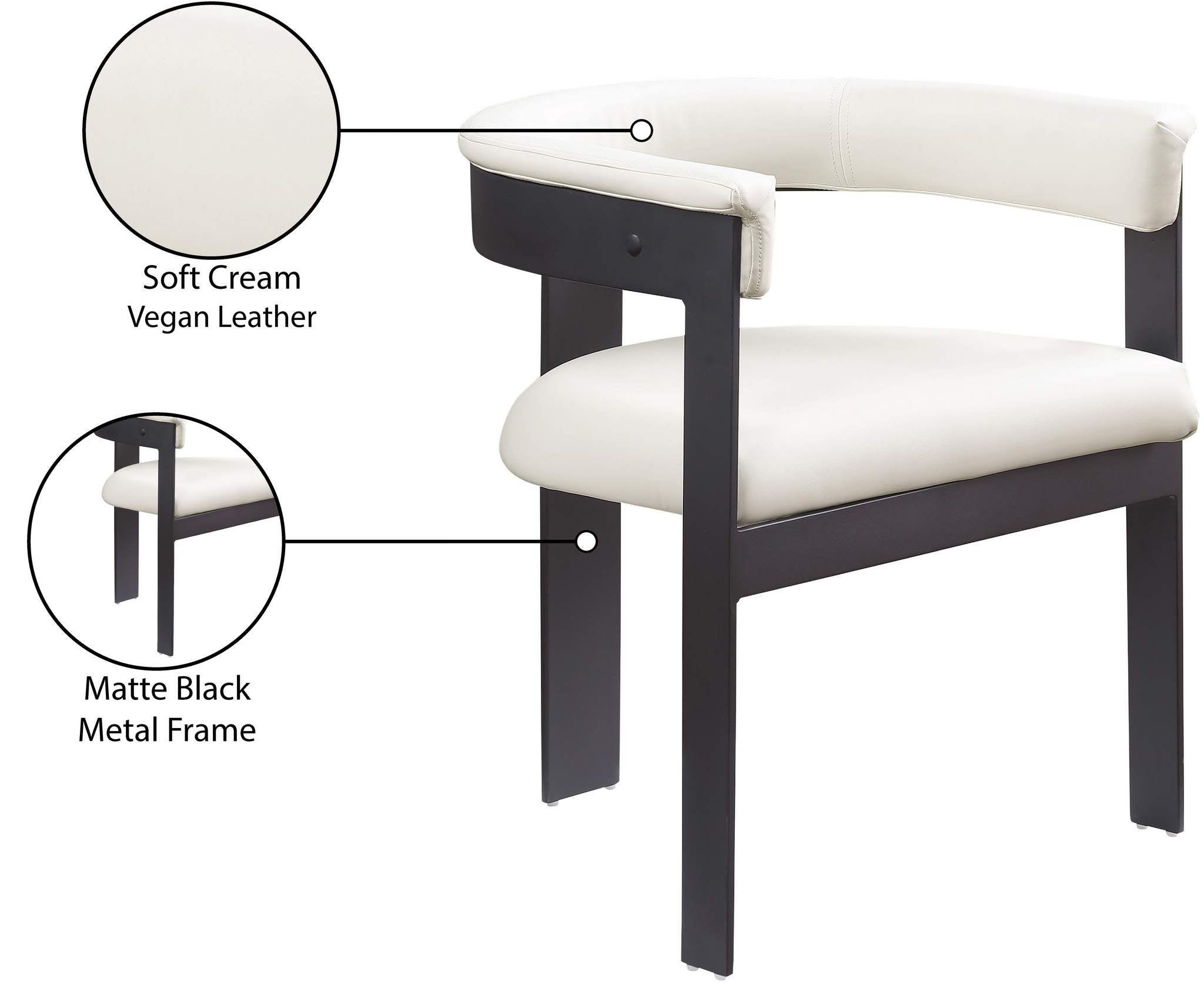 Rehab your dining area with these cream Romeo vegan leather dining chairs, sold as a set of two. These chairs offer both style and comfort, with soft cream vegan leather seats and backs providing a sleek and inviting look that meshes well with an array of dining tables. The matte black metal frame ensures durability and modern aesthetic appeal, while the chairs' curved backs deliver lumbar support for a relaxed dining experience.