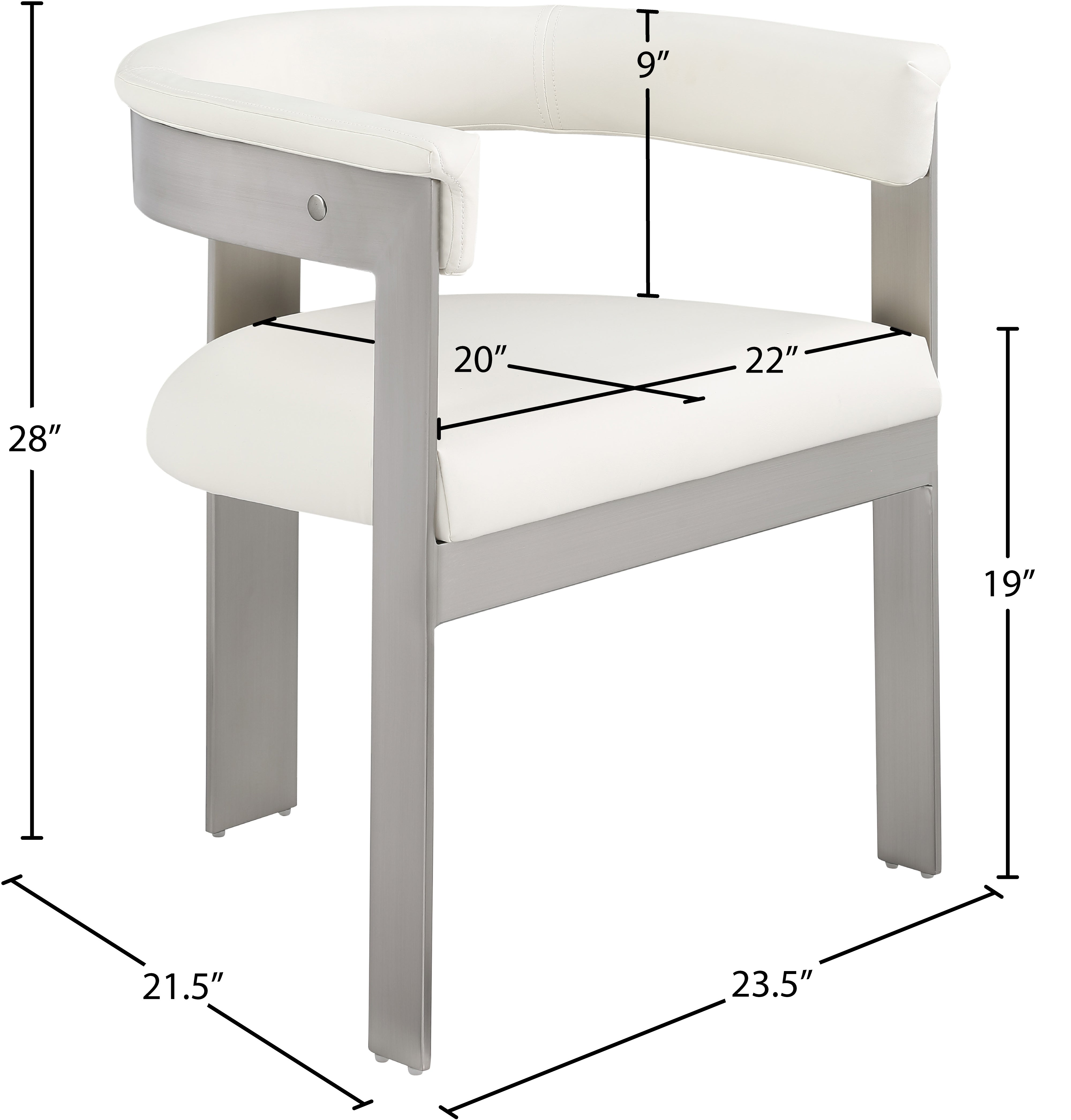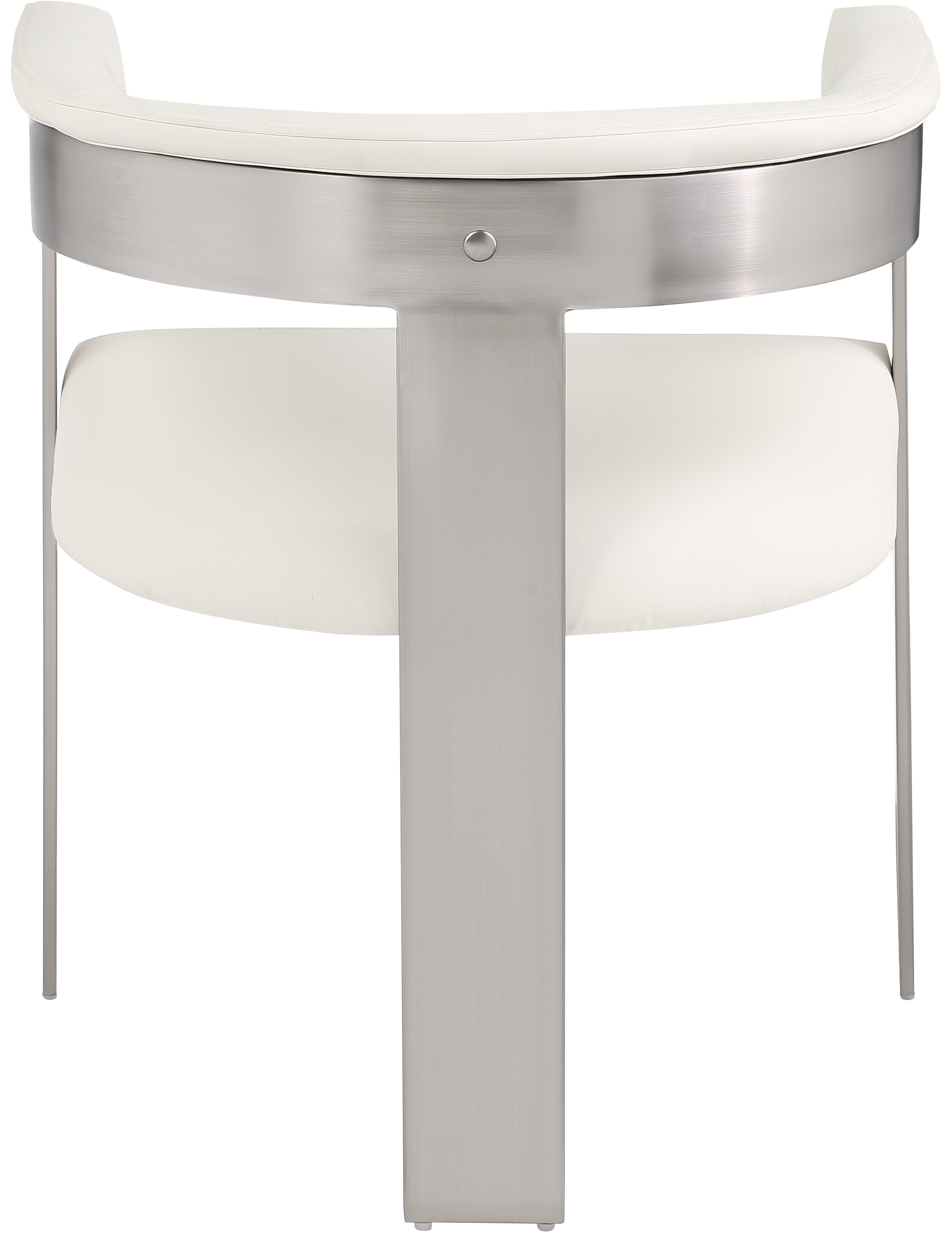 Enjoy an elevated dining experience when you bring home these cream Romeo vegan leather dining chairs, sold as a set of two. Featuring seats and backs upholstered in soft cream vegan leather, these chairs offer both style and comfort. The brushed chrome metal frames add a contemporary touch, making this pair of dining chairs a chic addition to your dining area. The curved backs provide not only a sleek look but also optimal support for the body, ensuring diners are relaxed from appetizers through dessert.