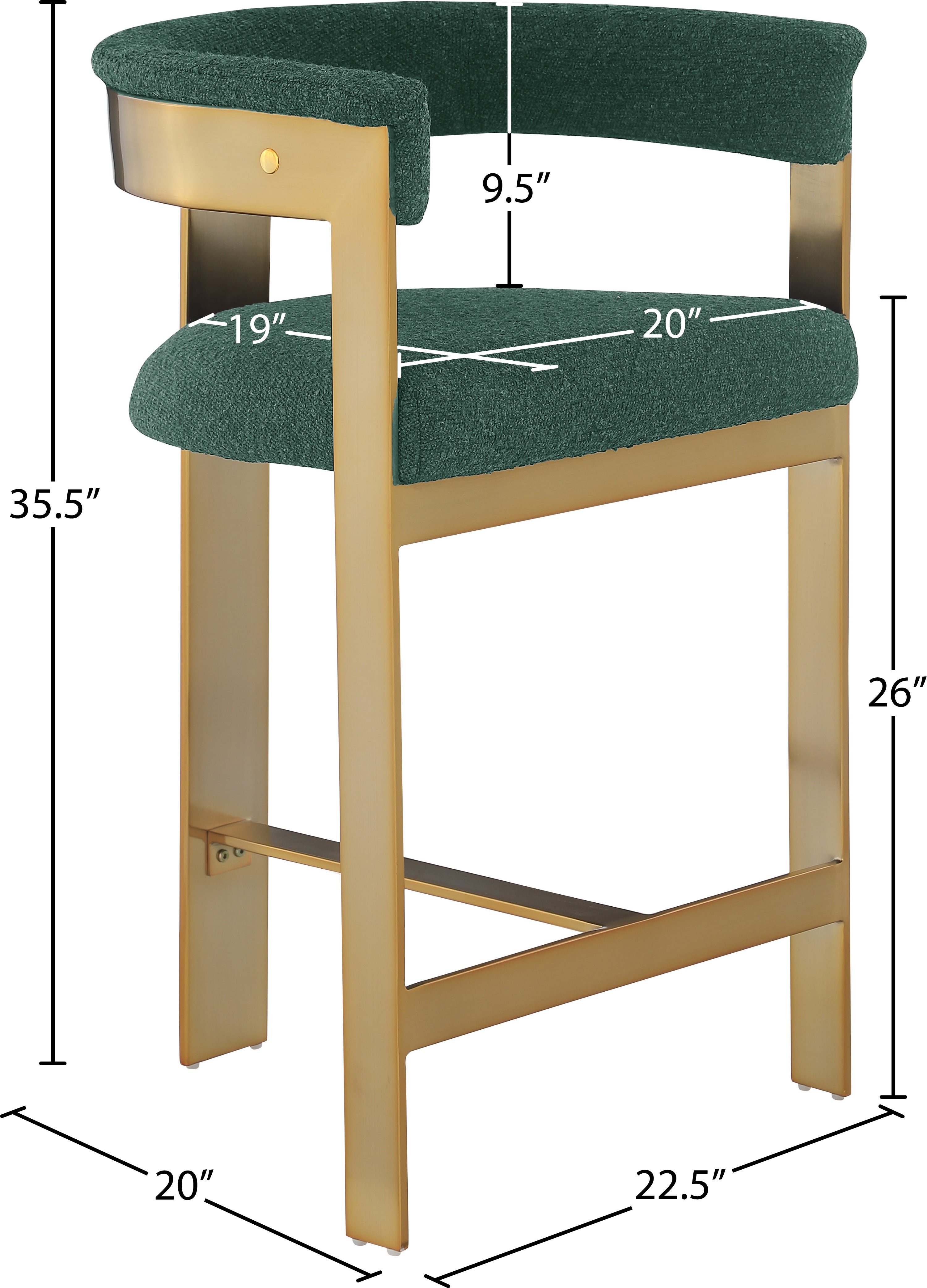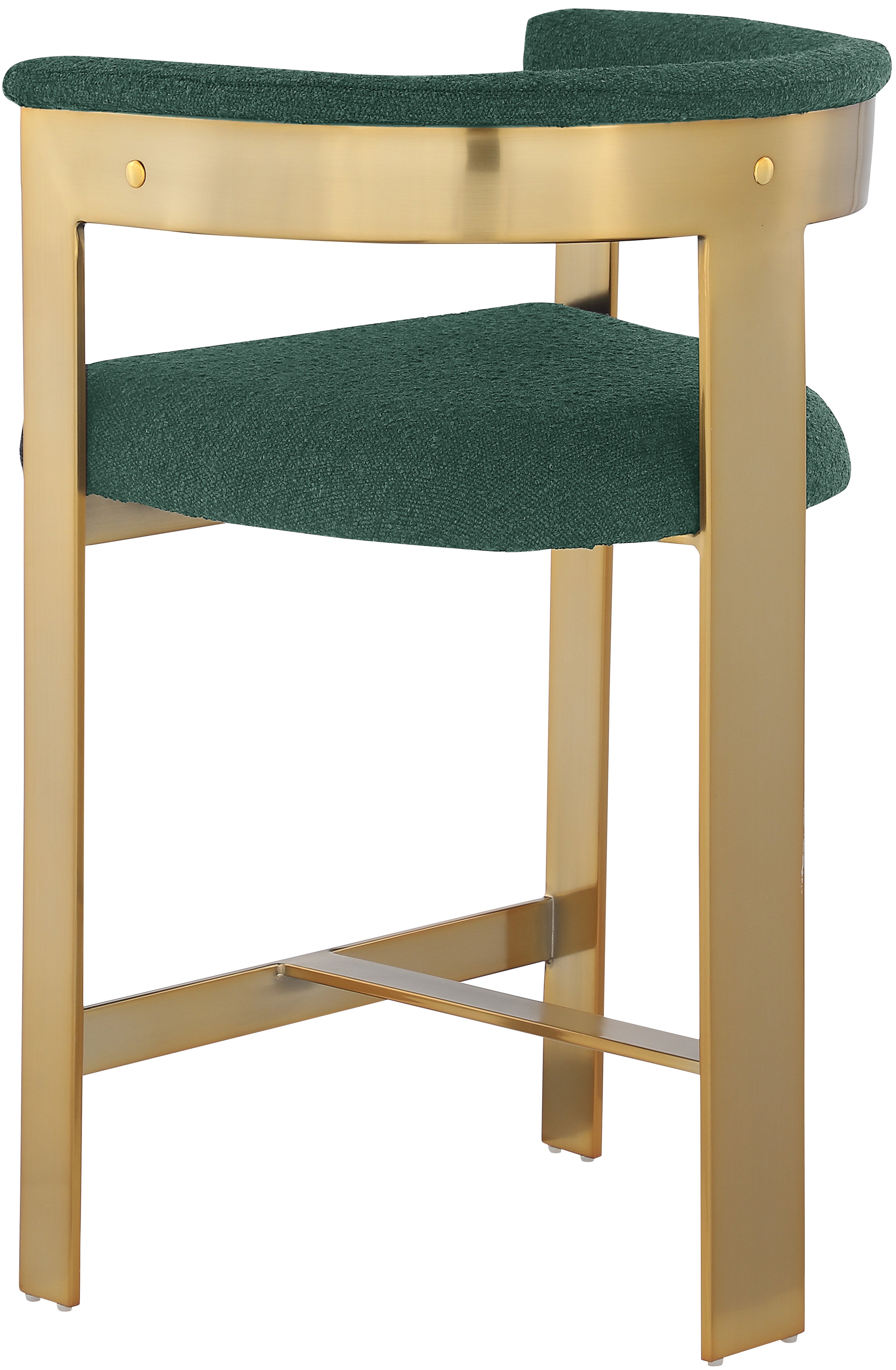 Choose these green Romeo boucle stool to give your dining room an instant refresh. These stools feature green boucle upholstered seats and backs, adding a modern touch to your space. The brushed gold metal frames offer an elegant contrast while ensuring durability. With sleek curved backs, these stools ensure comfort while enjoying a refreshing drink or meal. A cozy, chic seating solution for you and your guests, this stool will elevate any room's look.