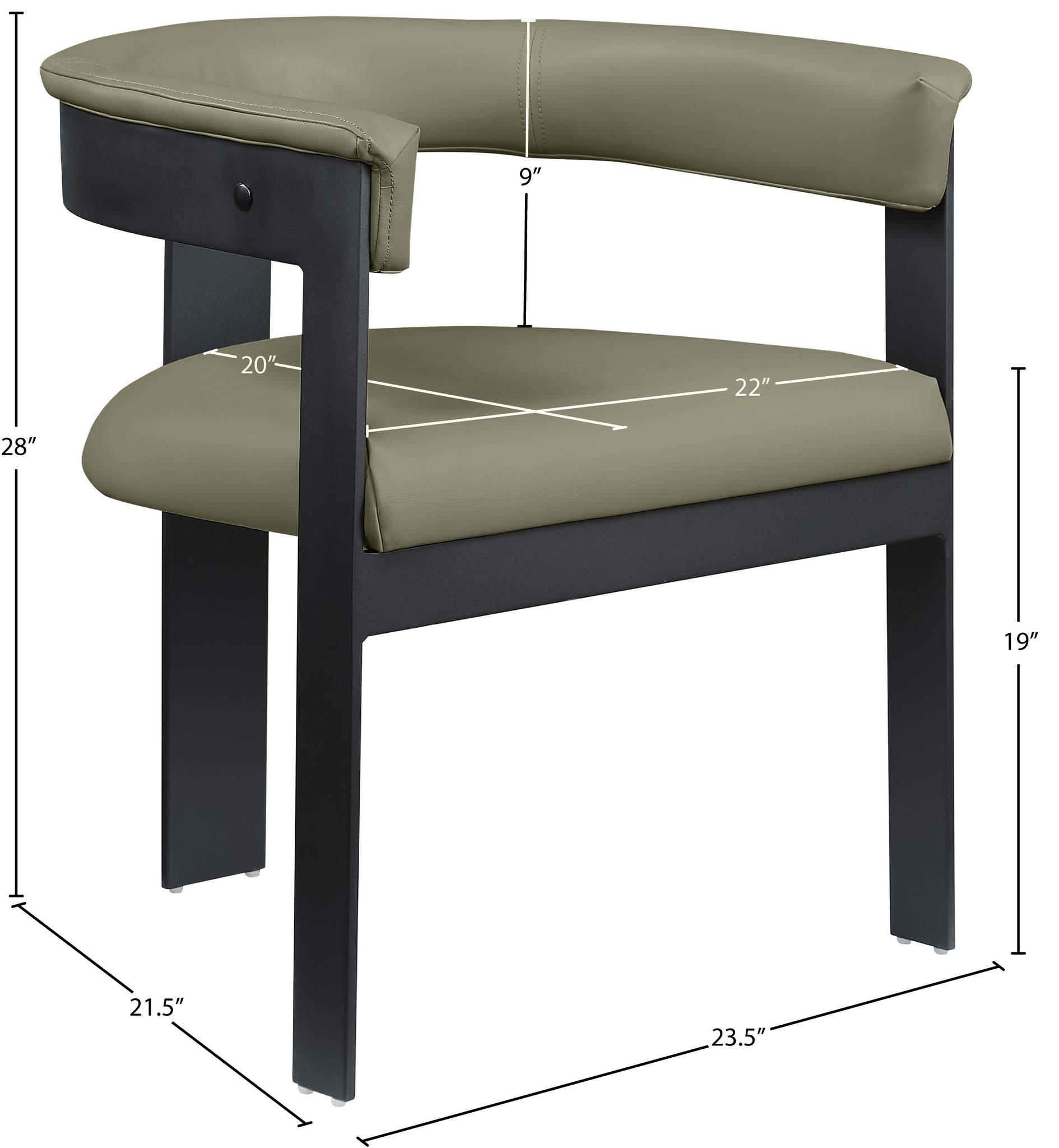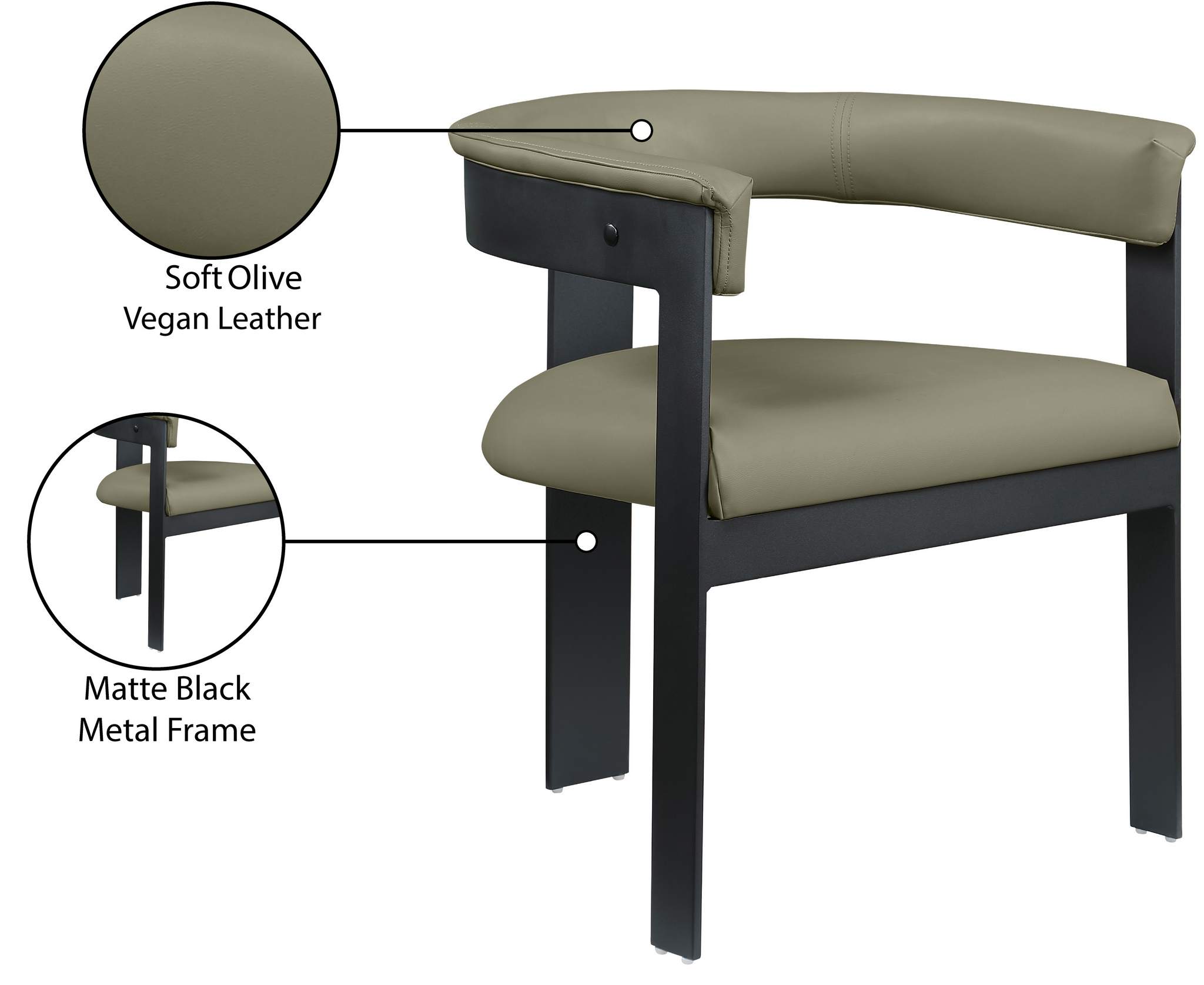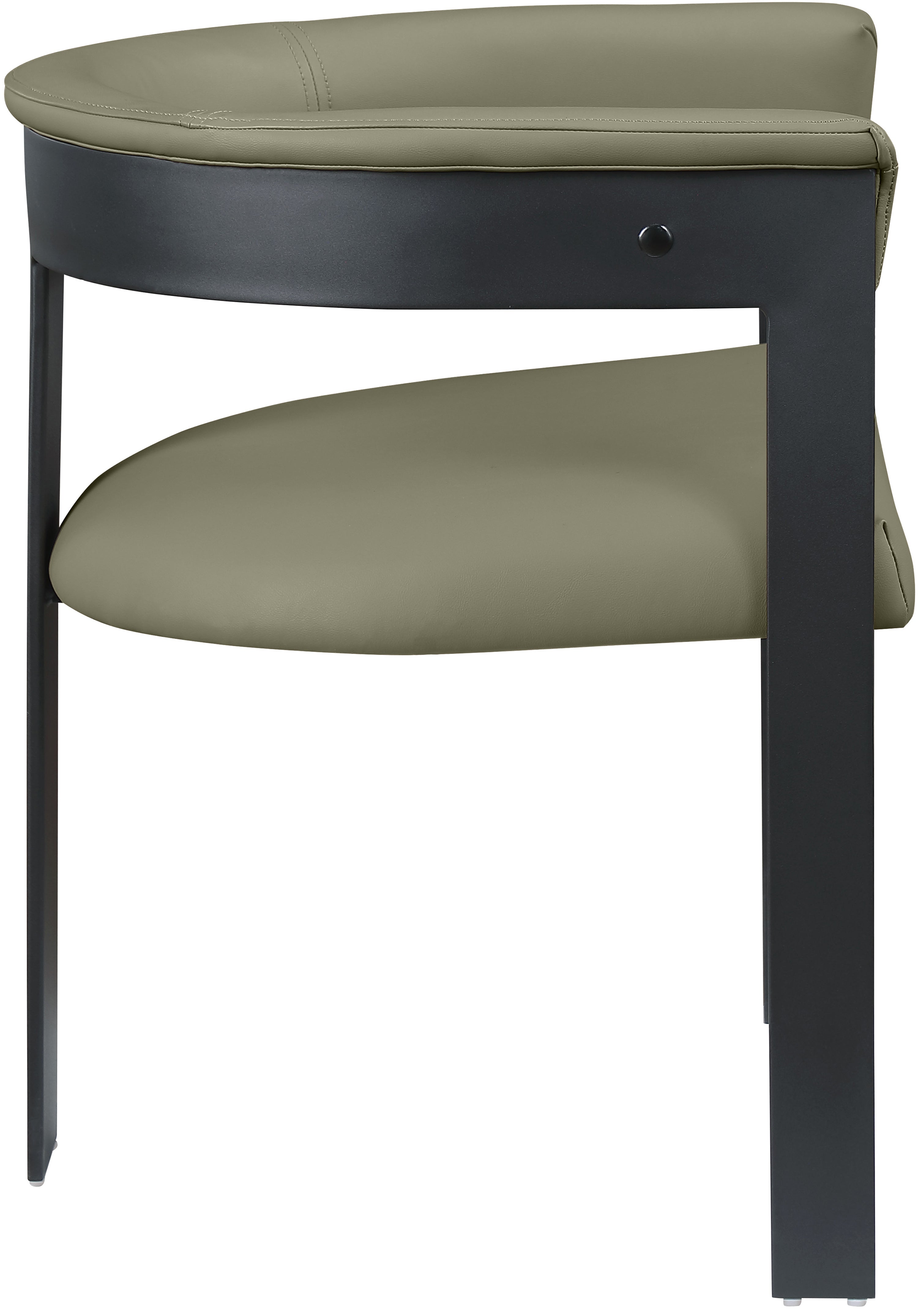 Rehab your dining area with these Olive green Romeo vegan leather dining chairs, sold as a set of two. These chairs offer both style and comfort, with soft Olive green vegan leather seats and backs providing a sleek and inviting look that meshes well with an array of dining tables. The matte black metal frame ensures durability and modern aesthetic appeal, while the chairs' curved backs deliver lumbar support for a relaxed dining experience.