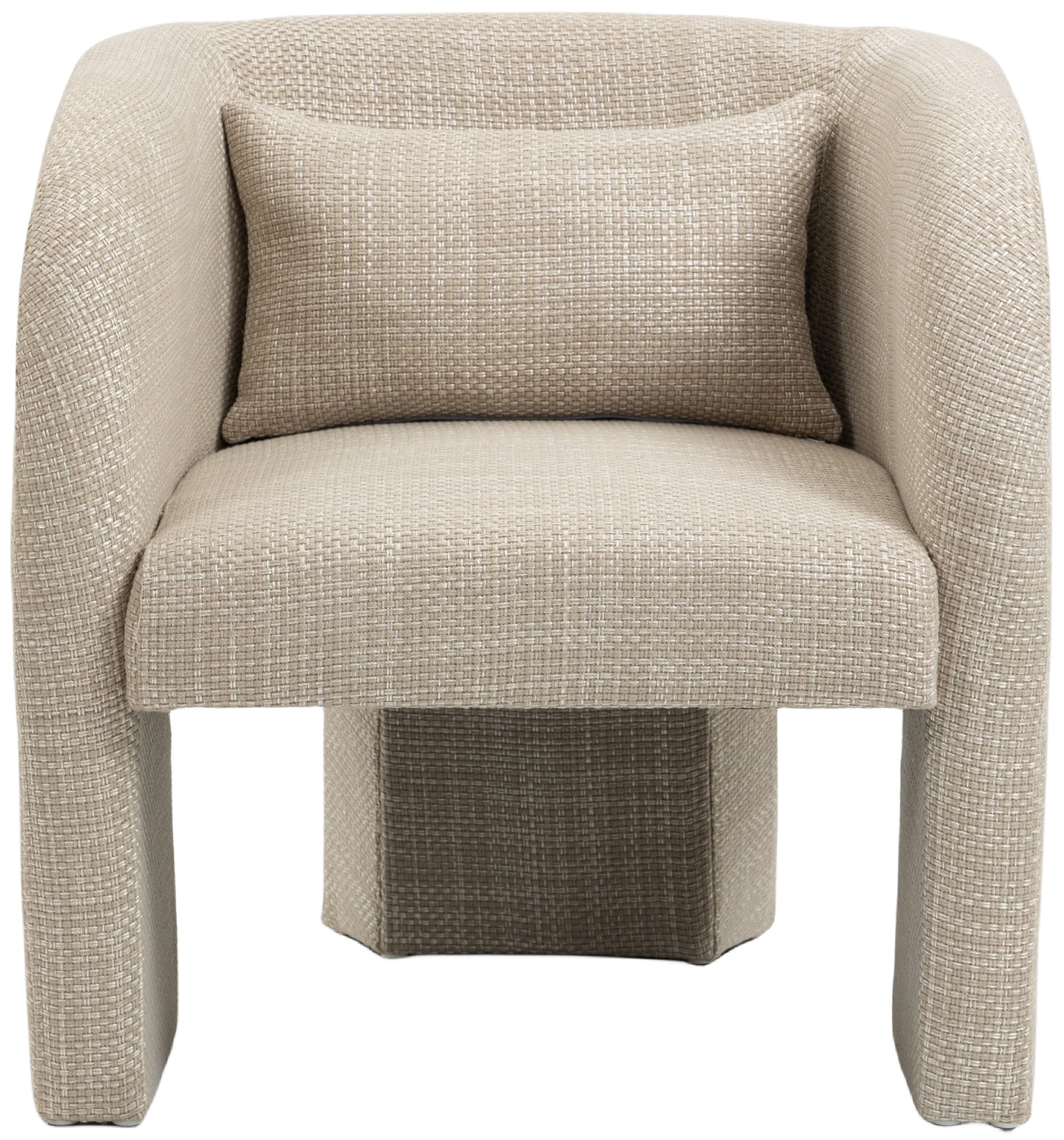 Give guests the best seat in the house when you seat them in this Sawyer weaved fabric accent chair. The boxy look of this chair is an instant attention-getter and makes it an ideal addition to your modern or contemporary decorative setting. The rich beige polyester fabric features a woven design for added textural appeal and beauty, and the chair comes with an additional pillow to help support your back and lumbar region.