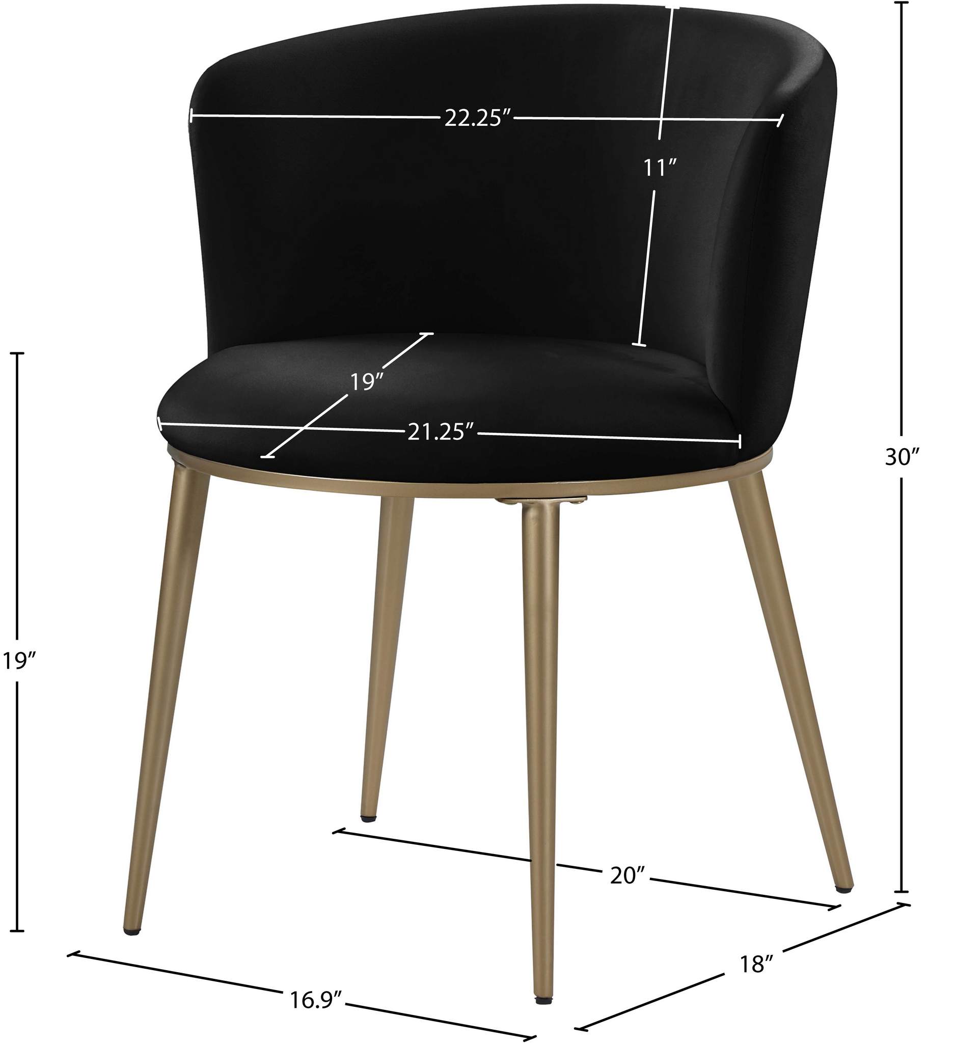 Enhance your decor with the Skylar black velvet dining chair, due to its petite silhouette and artistic style. A soft round cushion and gently curving cushioned back give this chair an ageless quality that belies its contemporary design. A brushed gold base is supported by four tapering gold legs, and it weighs only 11 pounds overall. Easily paired with any of several available tables, this chair is equally well-suited to use in a conversation grouping.
