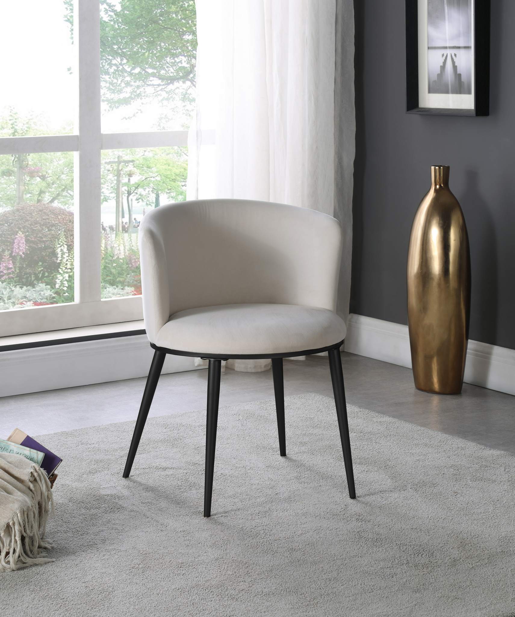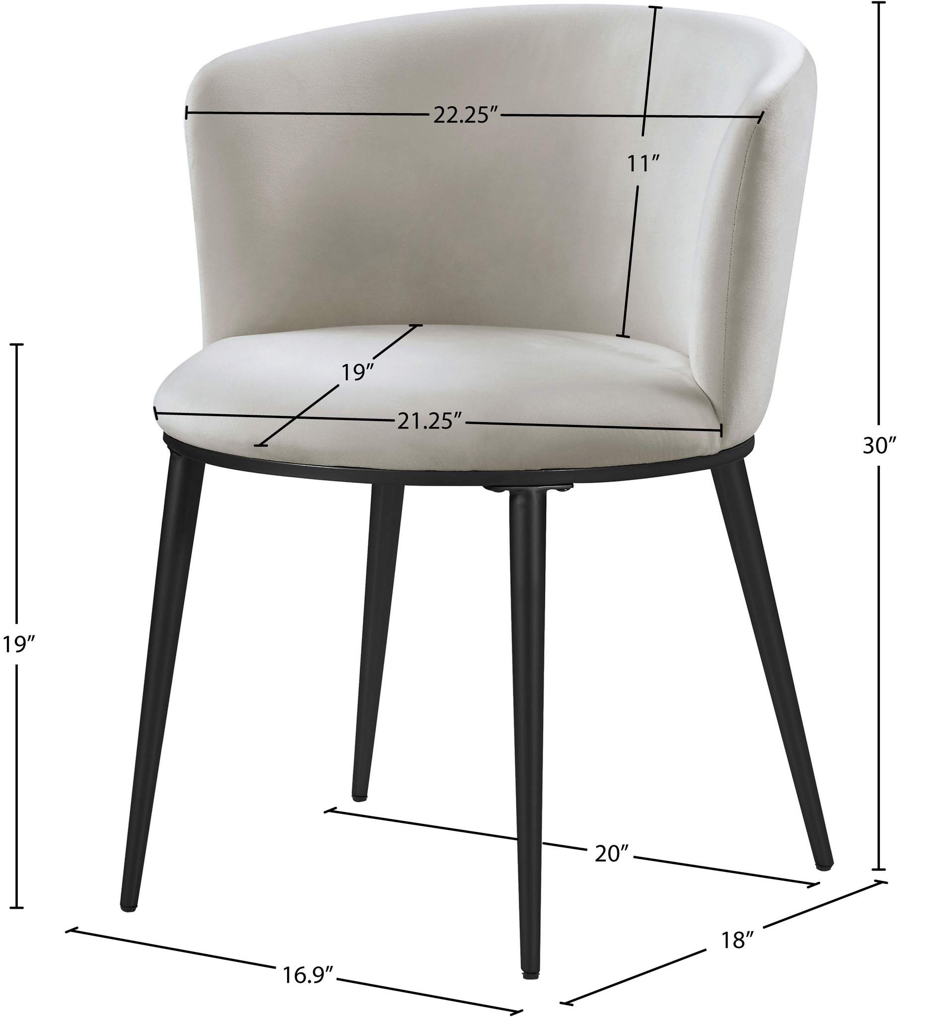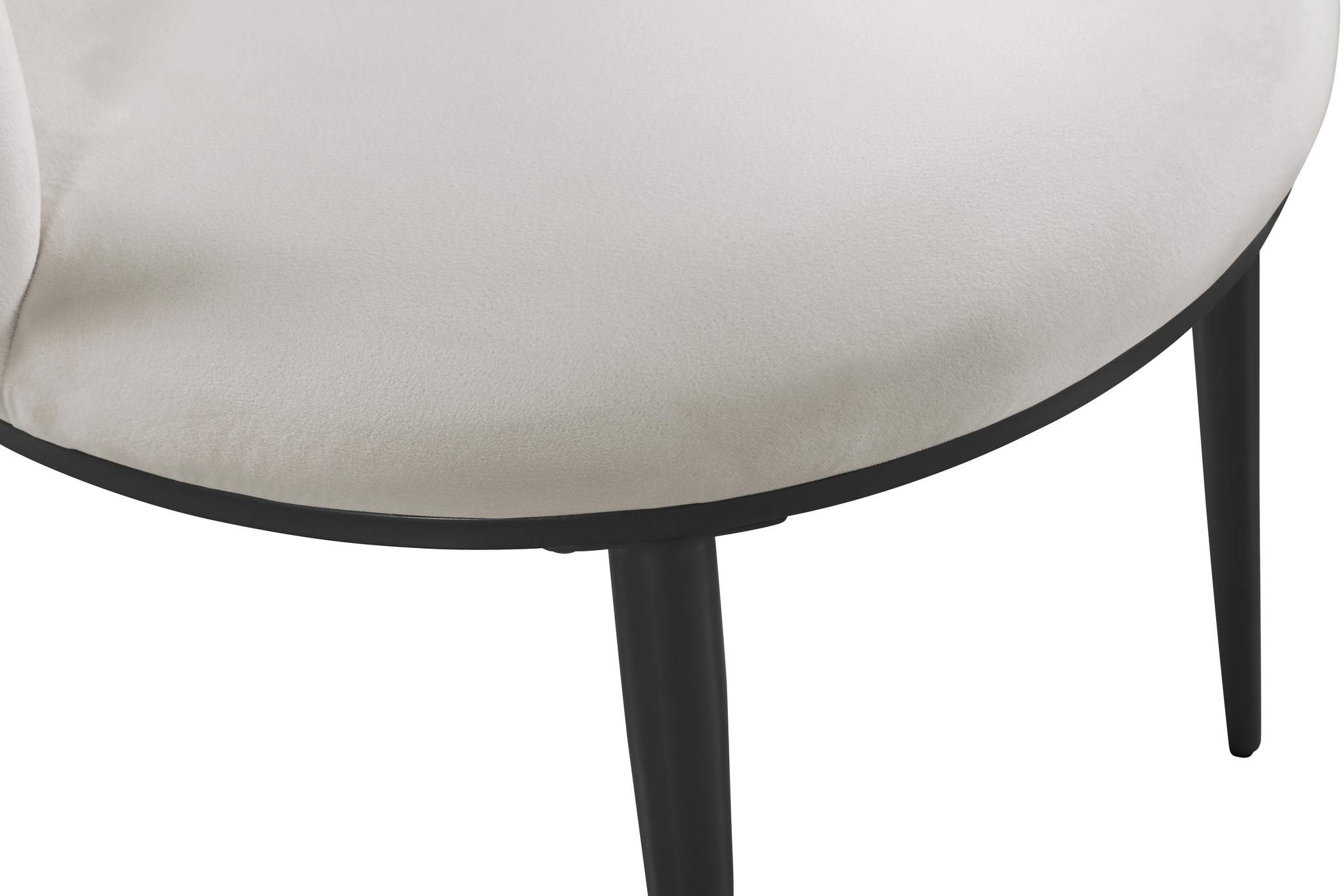 Enhance your decor with the Skylar cream velvet dining chair, due to its petite silhouette and artistic style. A soft round cushion and gently curving cushioned back give this chair an ageless quality that belies its contemporary design. A matte black base is supported by four tapering legs, and it weighs only 11 pounds overall. Easily paired with any of several available tables, this chair is equally well-suited to use in a conversation grouping.