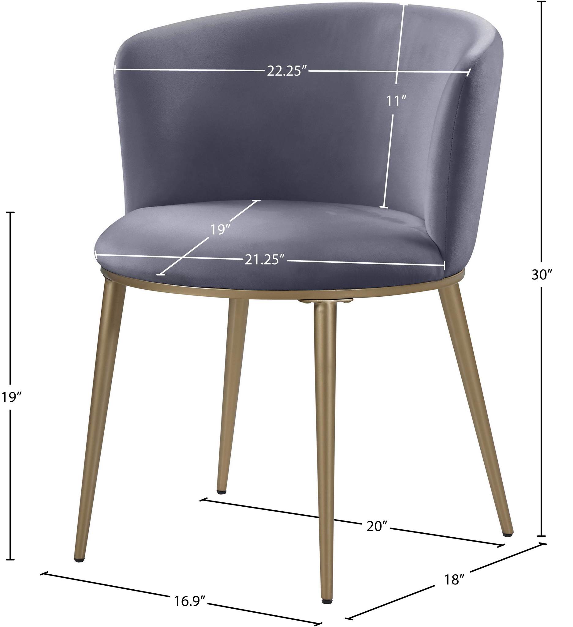 Enhance your decor with the Skylar grey velvet dining chair, due to its petite silhouette and artistic style. A soft round cushion and gently curving cushioned back give this chair an ageless quality that belies its contemporary design. A brushed gold base is supported by four tapering gold legs, and it weighs only 11 pounds overall. Easily paired with any of several available tables, this chair is equally well-suited to use in a conversation grouping.