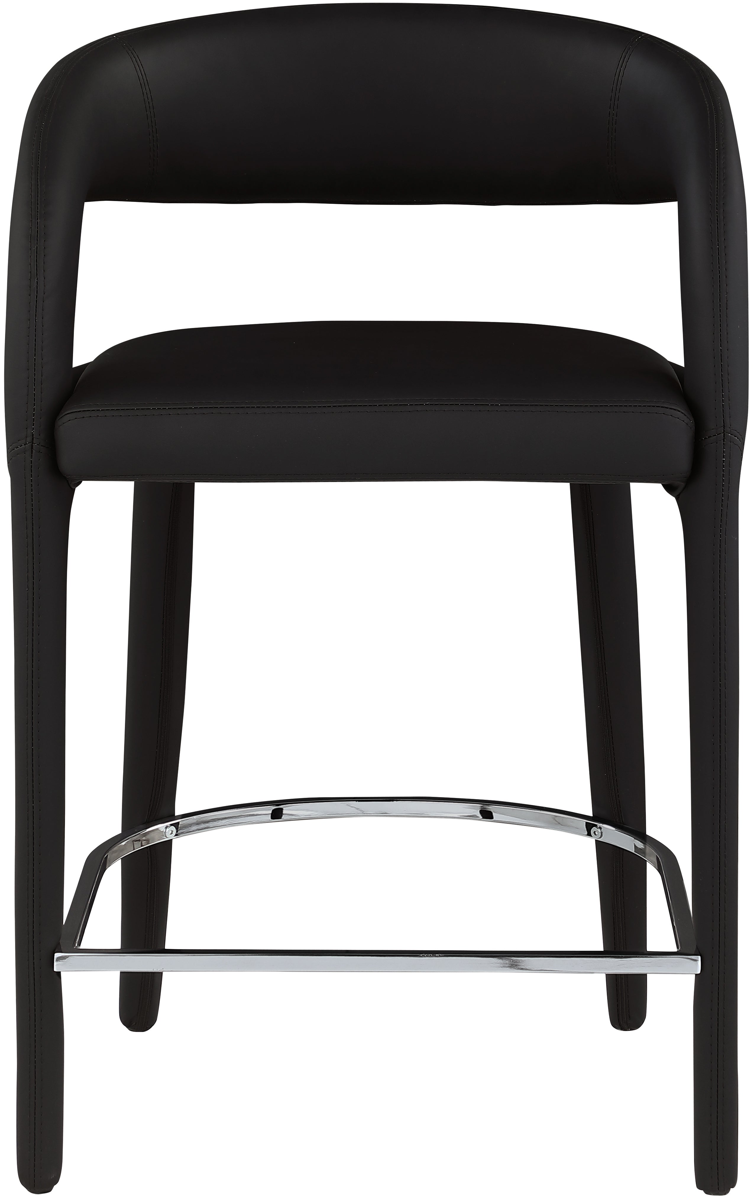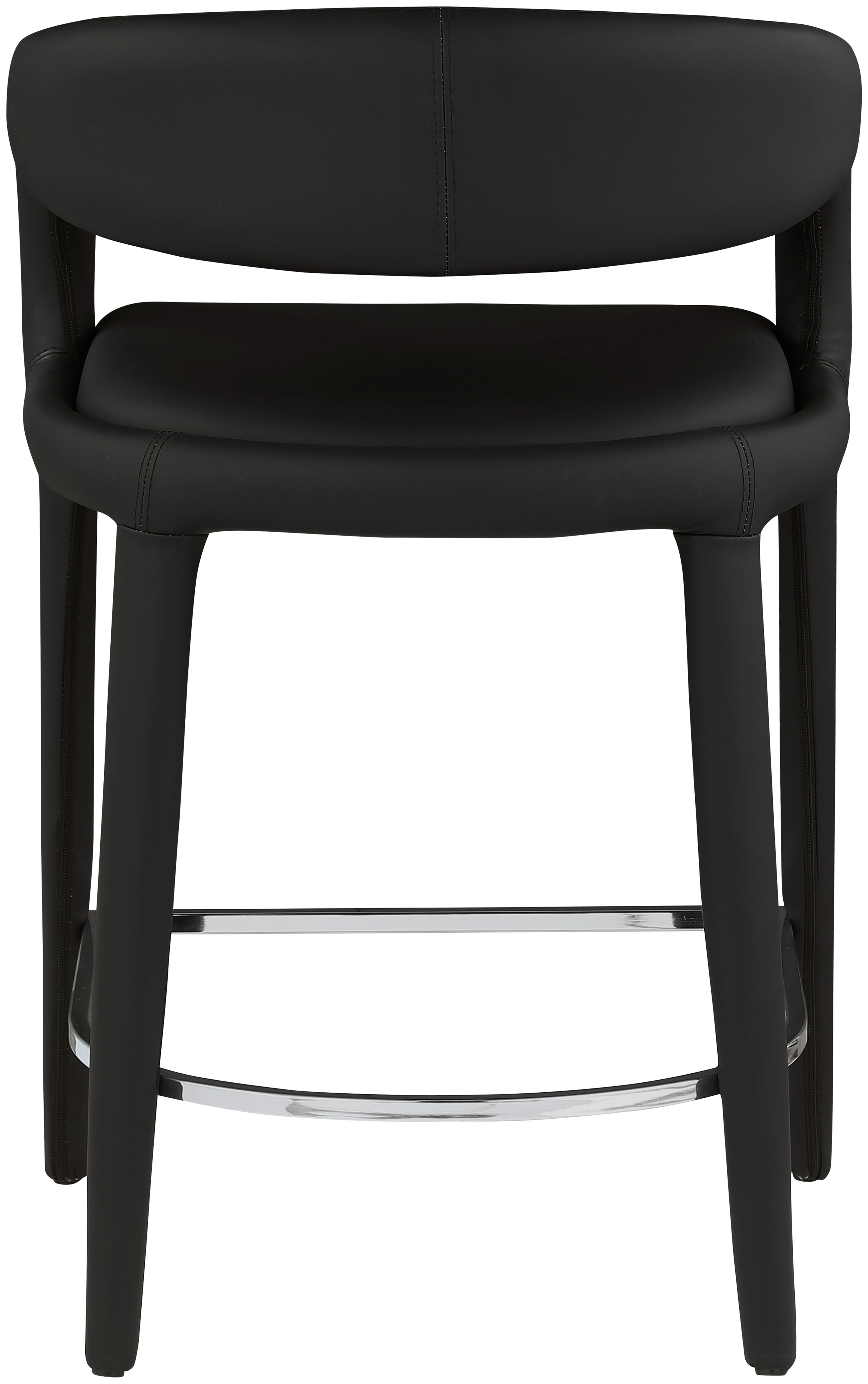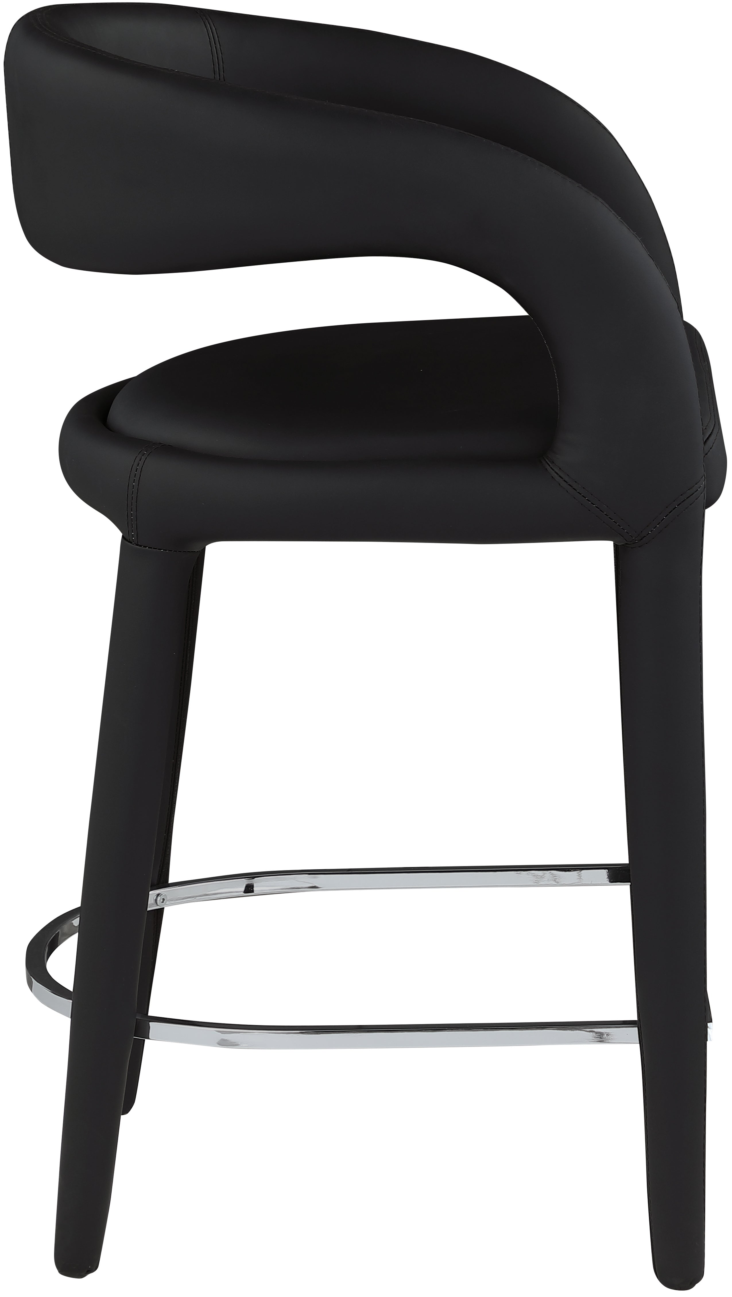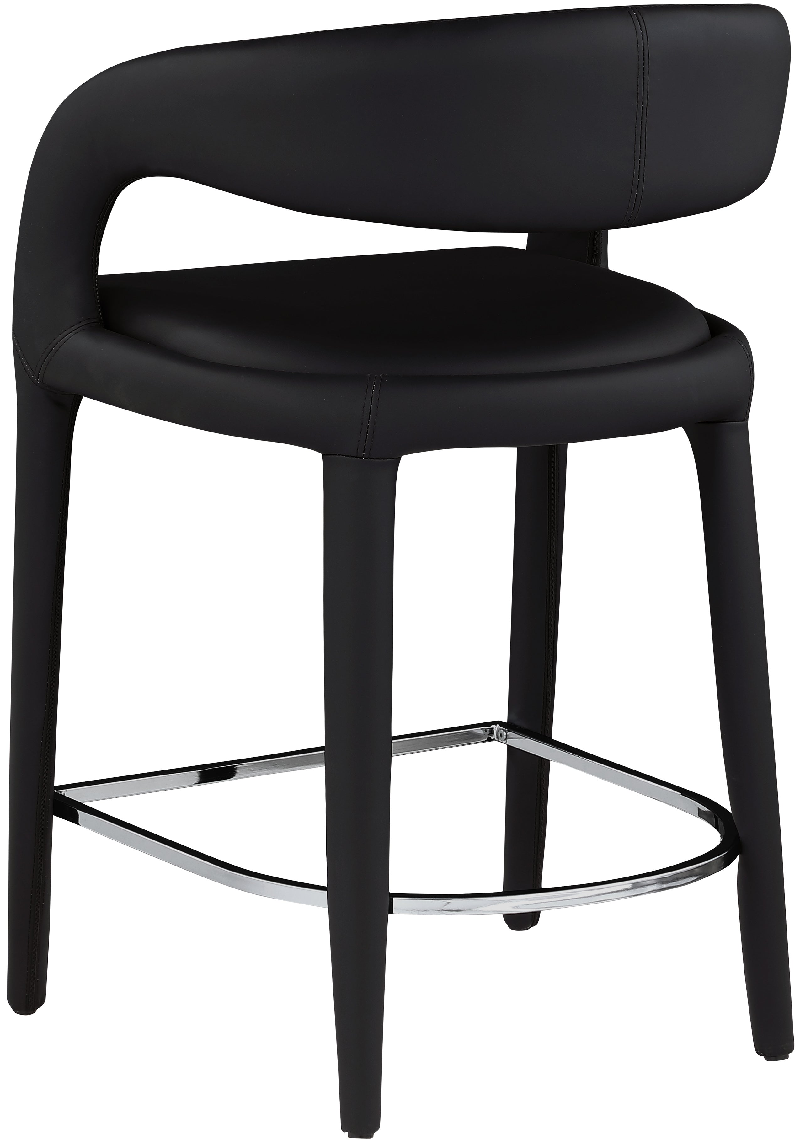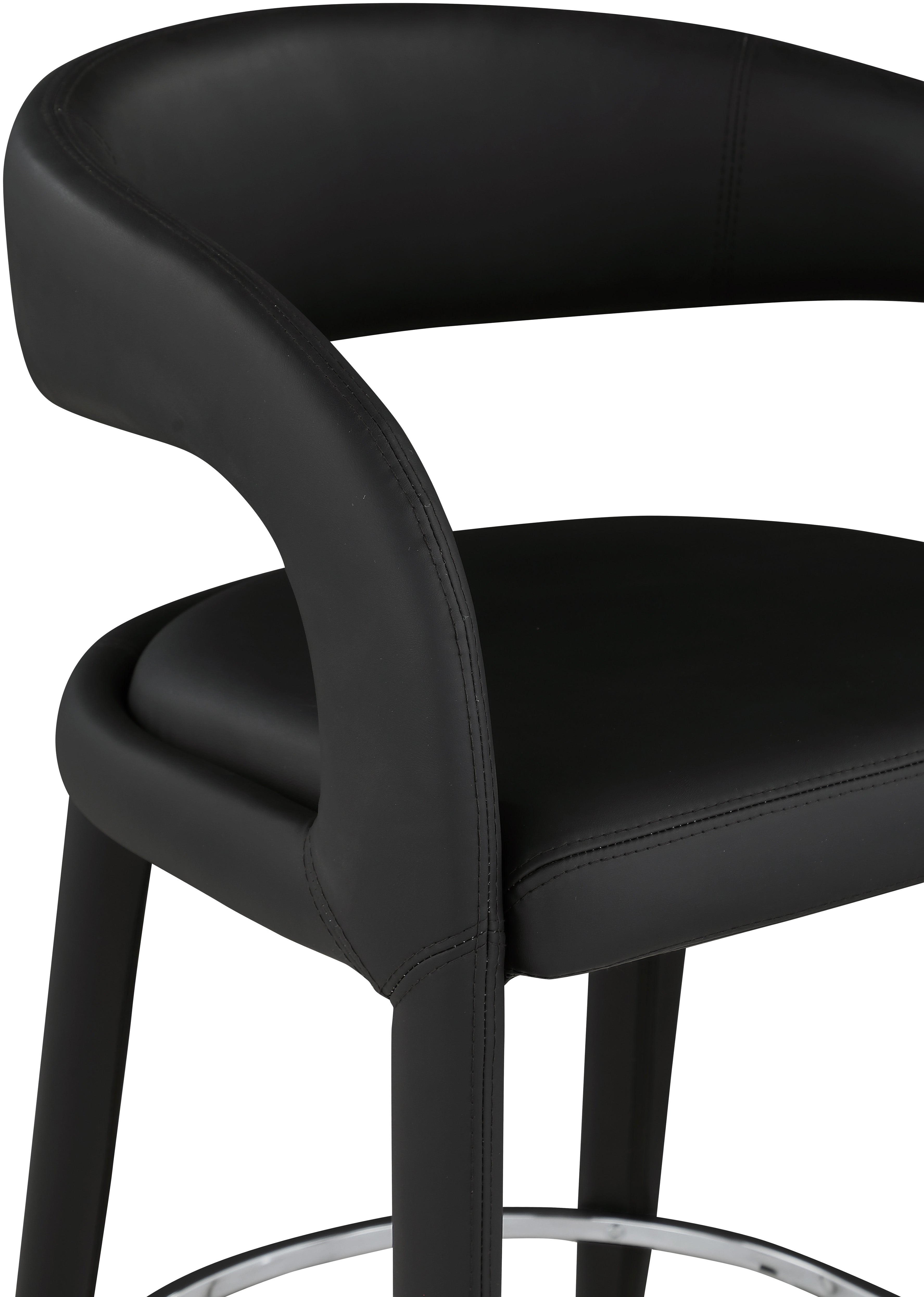 Modernize your home with this Sylvester black vegan leather stool. Featuring soft and durable black vegan leather upholstery, this stool offers you a comfortable and long-lasting place to sit while you dine. It's fully upholstered, giving it a solid look that is ideal for any contemporary home. Its rounded back provides upper back support, while its semi-open design makes a fashionable decorative statement that is sure to catch the eyes of anyone who joins you for dinner.