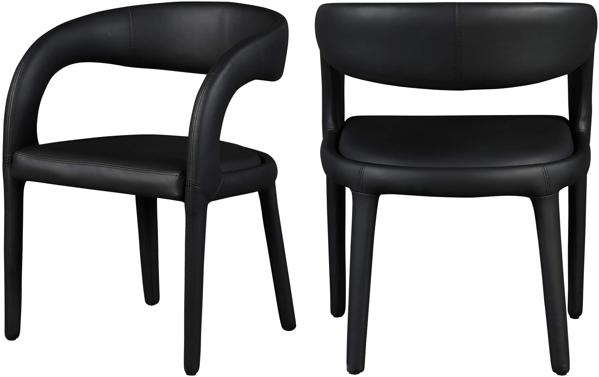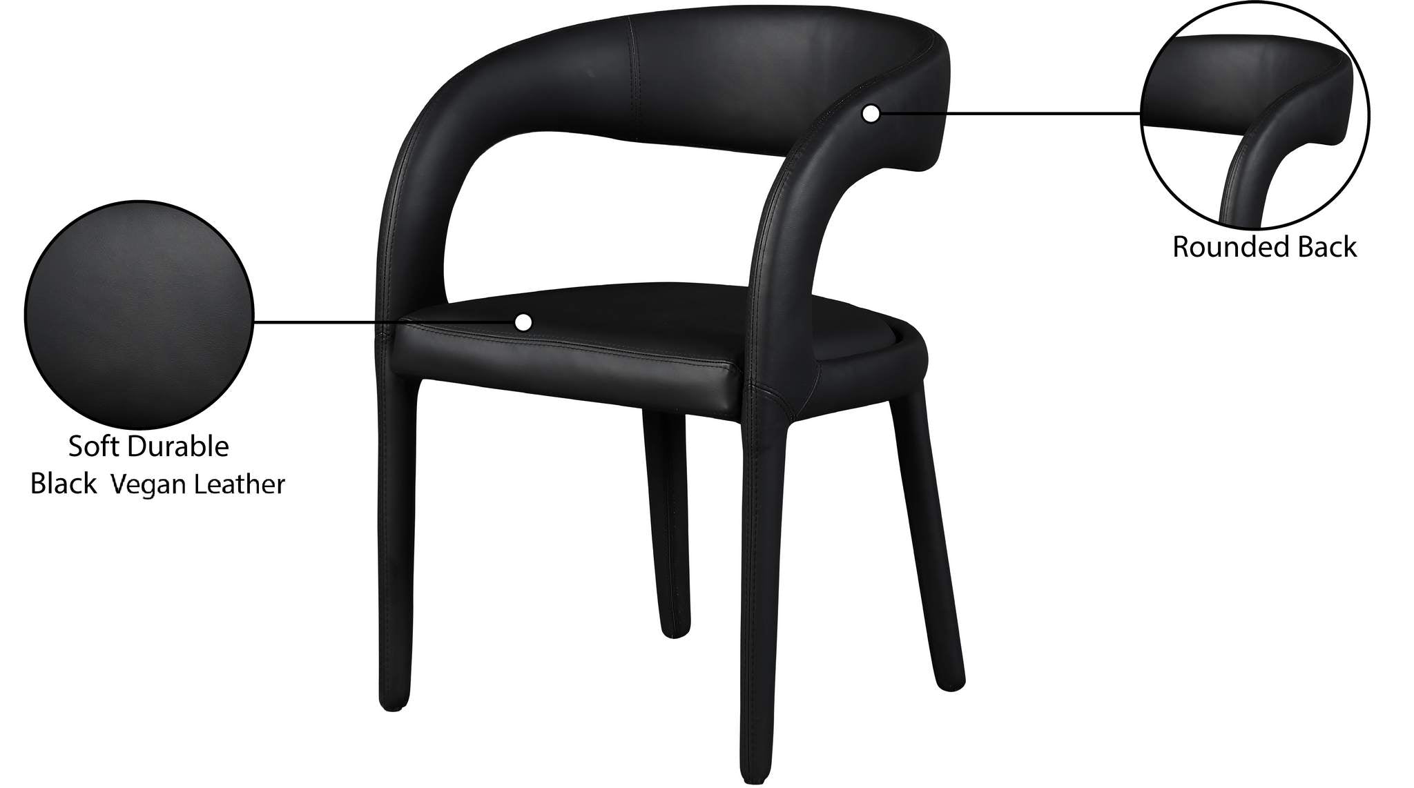 Modernize your home with this Sylvester black vegan leather dining chair. Featuring soft and durable black vegan leather upholstery, this chair offers you a comfortable and long-lasting place to sit while you dine. It's fully upholstered, giving it a solid look that is ideal for any contemporary home. Its rounded back provides upper back support, while its semi-open design makes a fashionable decorative statement that is sure to catch the eyes of anyone who joins you for dinner.