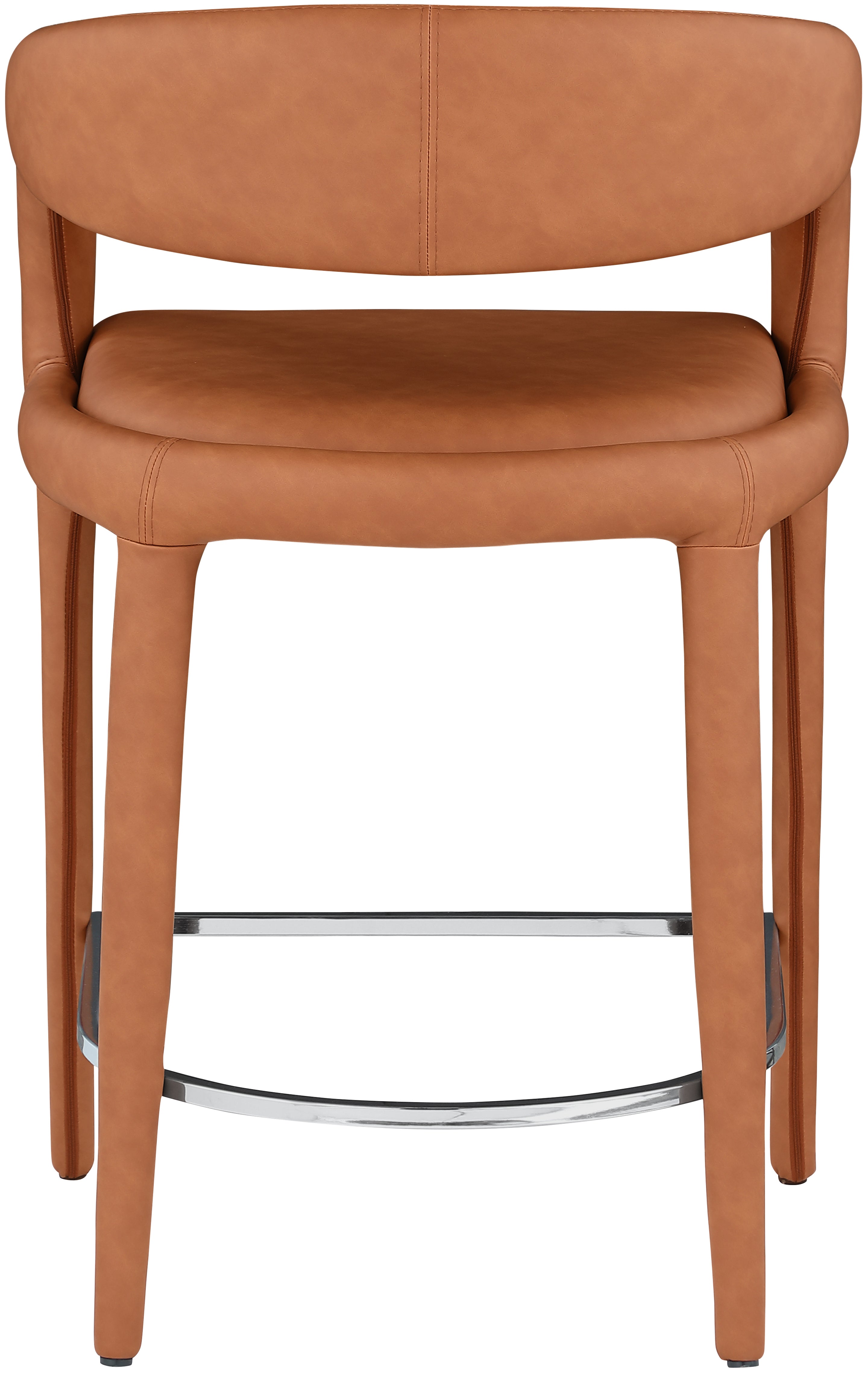 Modernize your home with this Sylvester cognac vegan leather stool. Featuring soft and durable cognac vegan leather upholstery, this stool offers you a comfortable and long-lasting place to sit while you dine. It's fully upholstered, giving it a solid look that is ideal for any contemporary home. Its rounded back provides upper back support, while its semi-open design makes a fashionable decorative statement that is sure to catch the eyes of anyone who joins you for dinner.