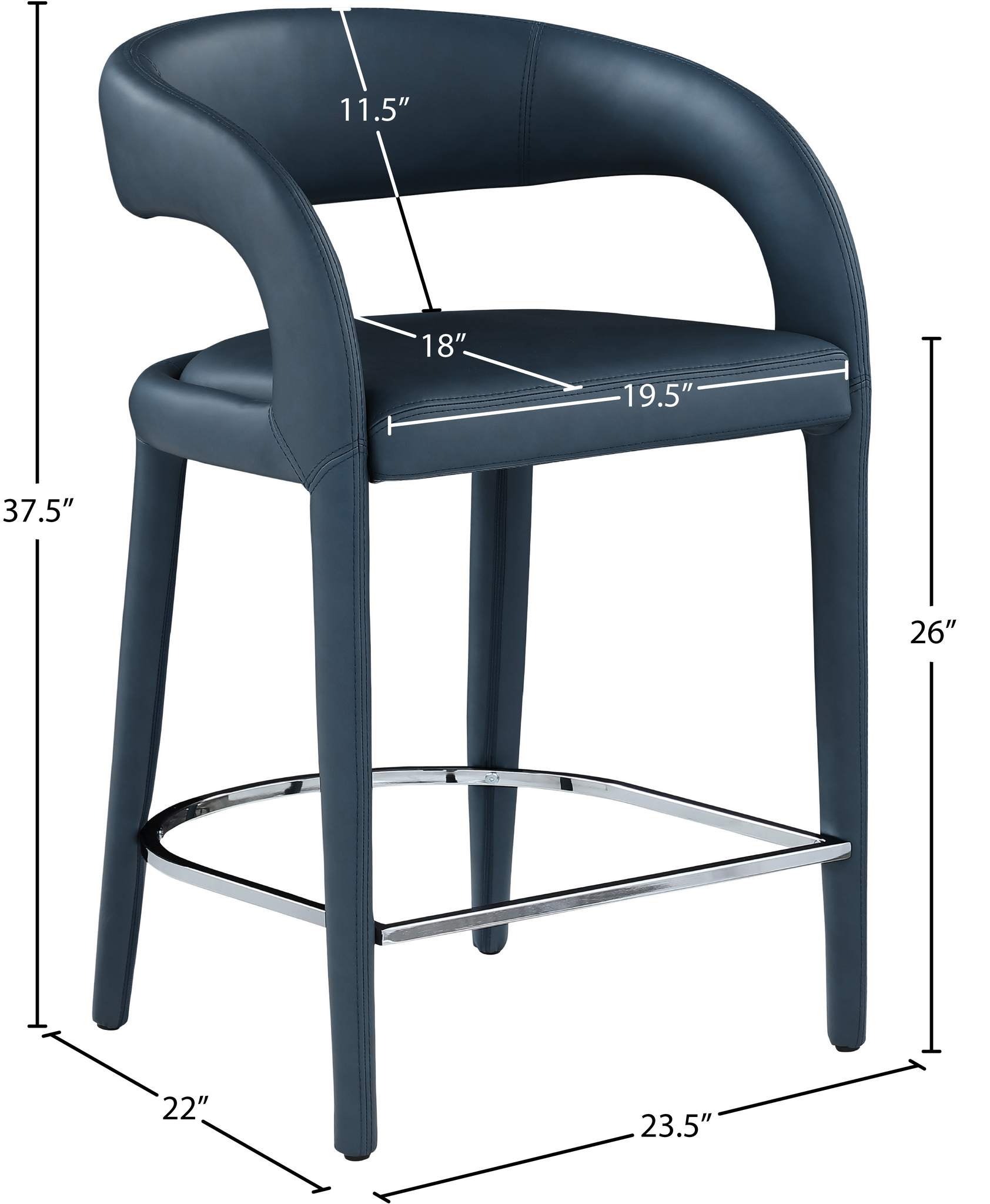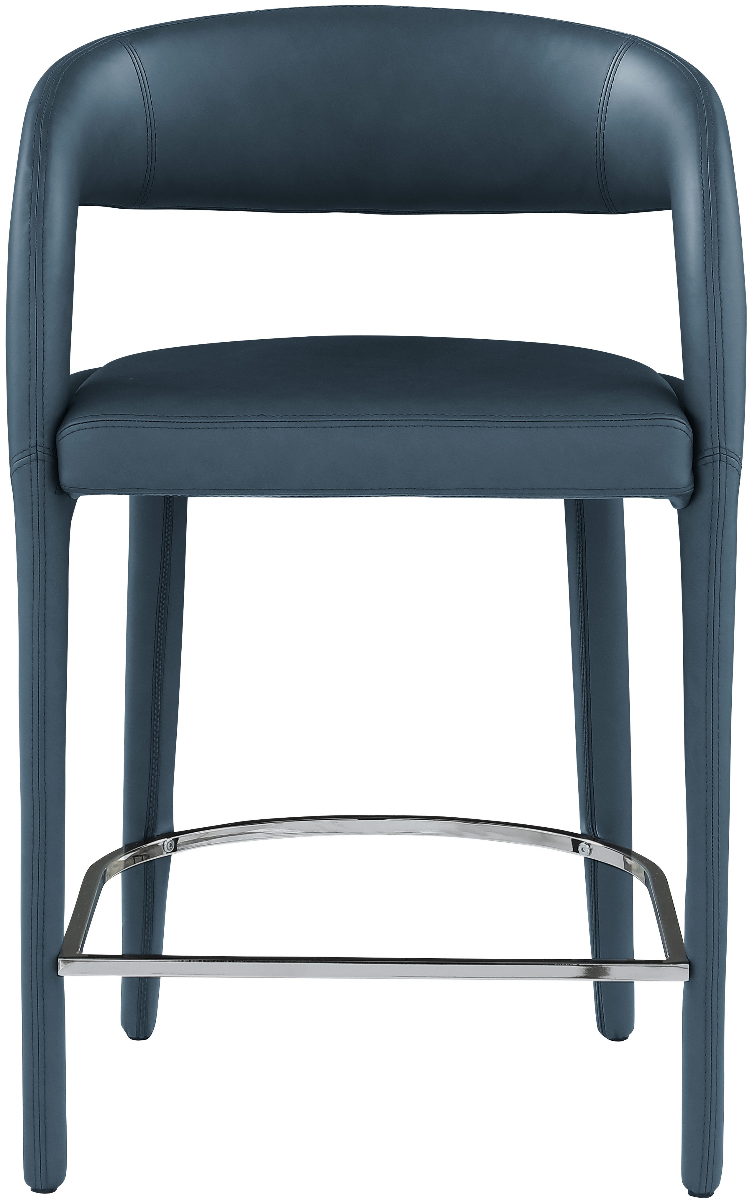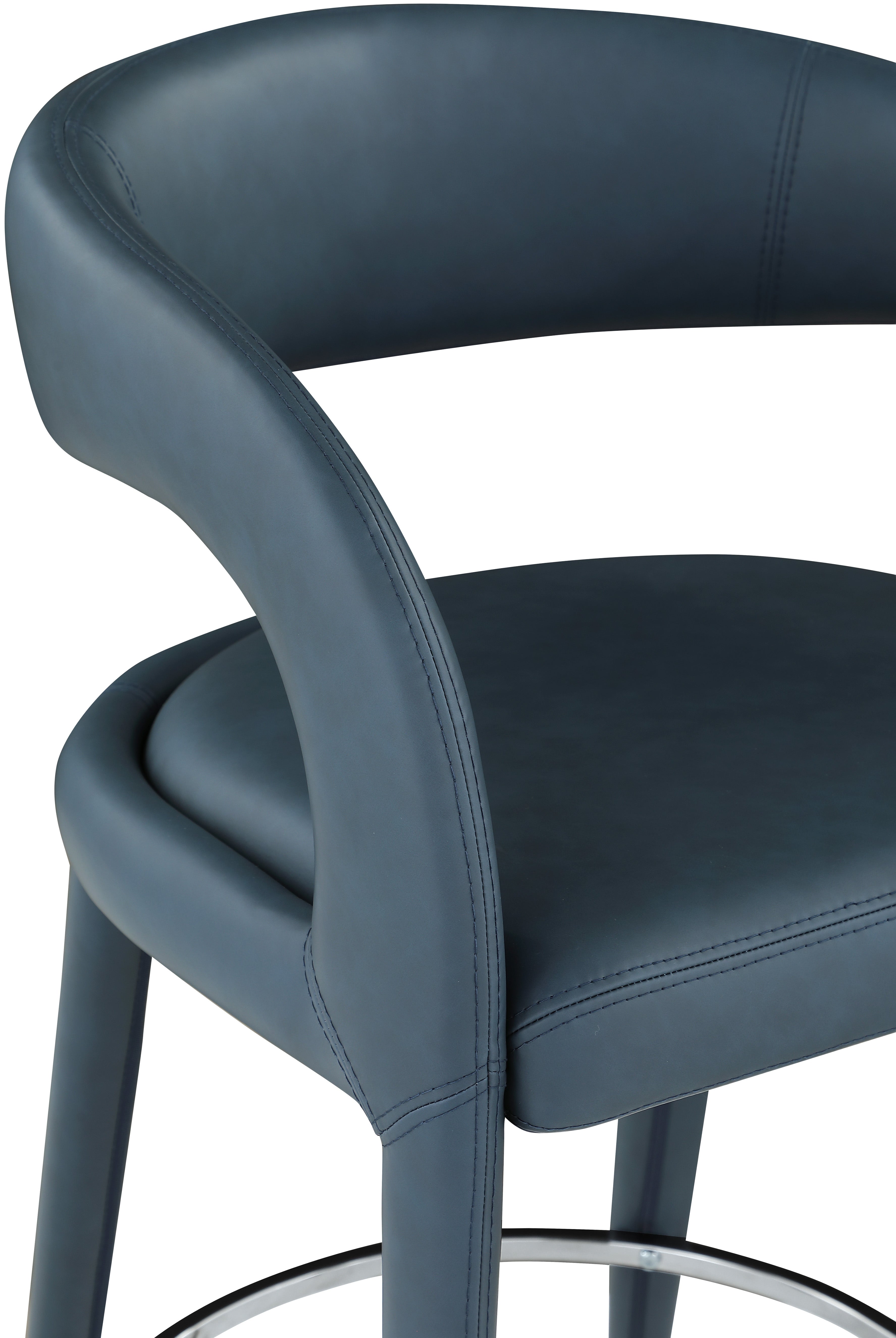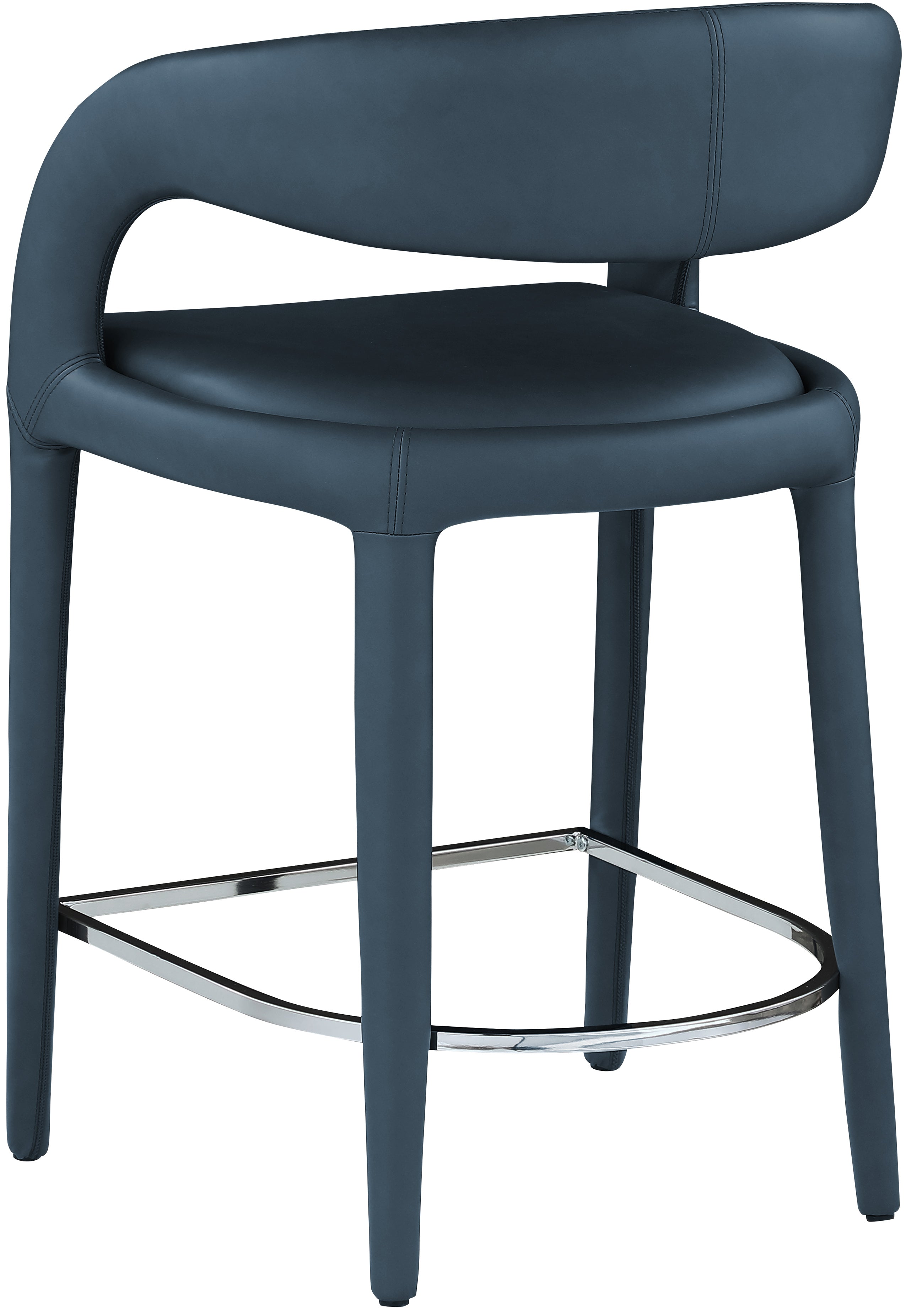 Modernize your home with this Sylvester navy vegan leather stool. Featuring soft and durable navy vegan leather upholstery, this stool offers you a comfortable and long-lasting place to sit while you dine. It's fully upholstered, giving it a solid look that is ideal for any contemporary home. Its rounded back provides upper back support, while its semi-open design makes a fashionable decorative statement that is sure to catch the eyes of anyone who joins you for dinner.