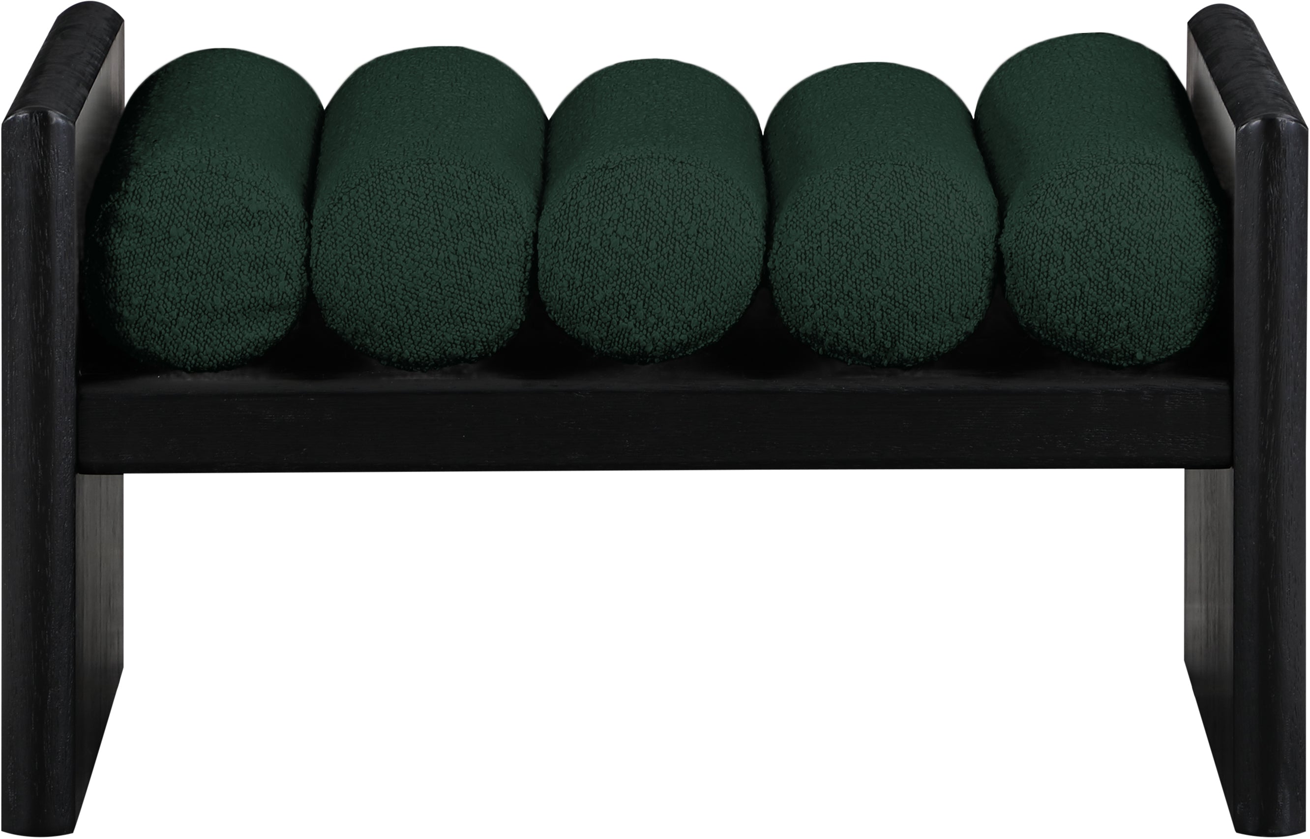 Add originality to your home with this unique bench from Meridian Furniture's Waverly collection. Crafted using solid rubber wood with a black finish, this bench makes a bold statement in any living space. Its H-shaped design holds five rich green boucle fabric cushion rolls on top, providing a comfortable place to sit for you or your guests. It's big enough to seat more than one person, providing you with extra seating space, and its contemporary design is perfect for any modern home.