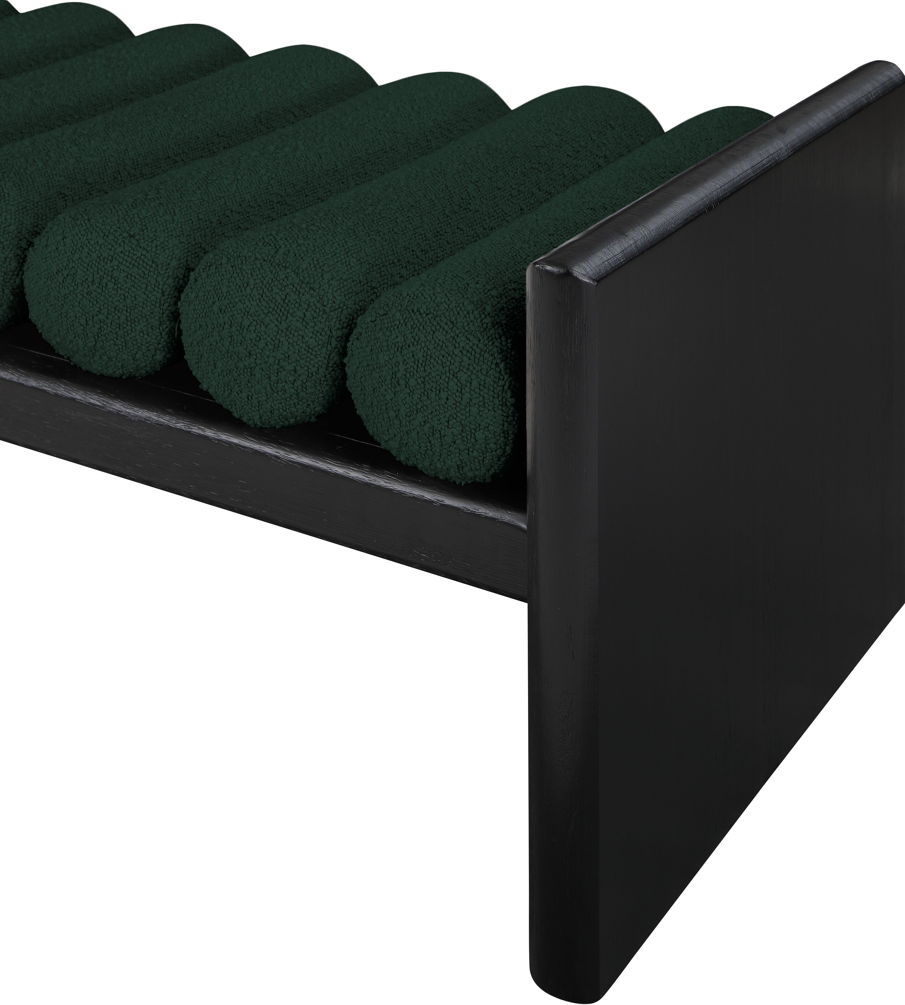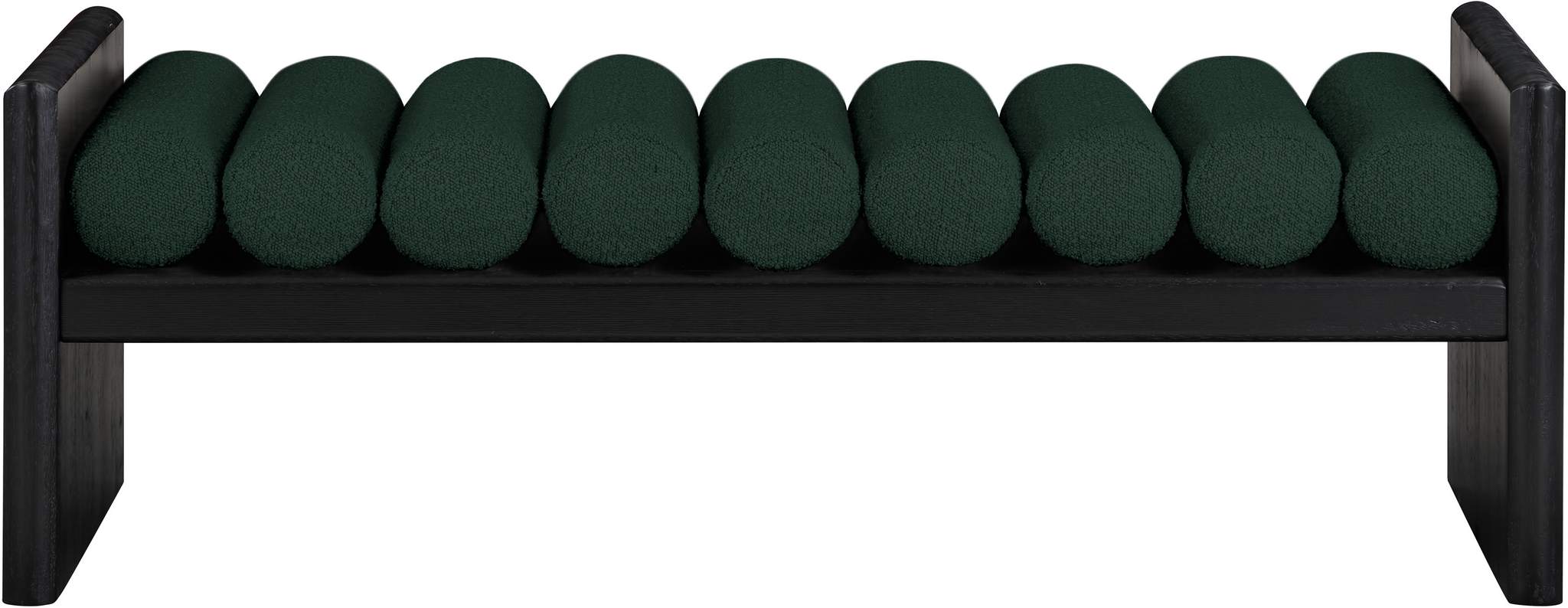 Add originality to your home with this unique bench from Meridian Furniture's Waverly collection. Crafted using solid rubber wood with a black finish, this bench makes a bold statement in any living space. Its H-shaped design holds nine rich green boucle fabric cushion rolls on top, providing a comfortable place to sit for you or your guests. It's big enough to seat more than one person, providing you with extra seating space, and its contemporary design is perfect for any modern home.