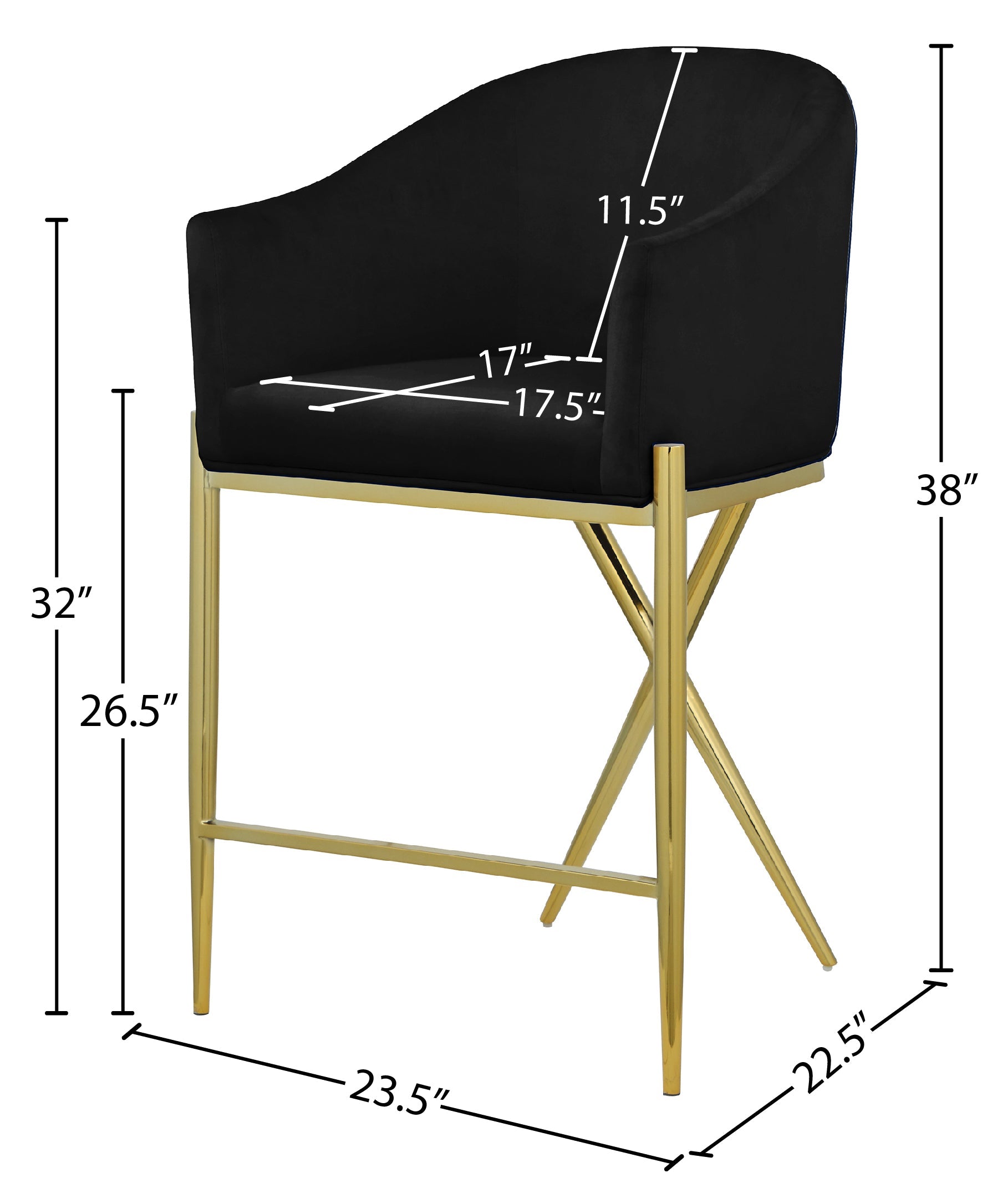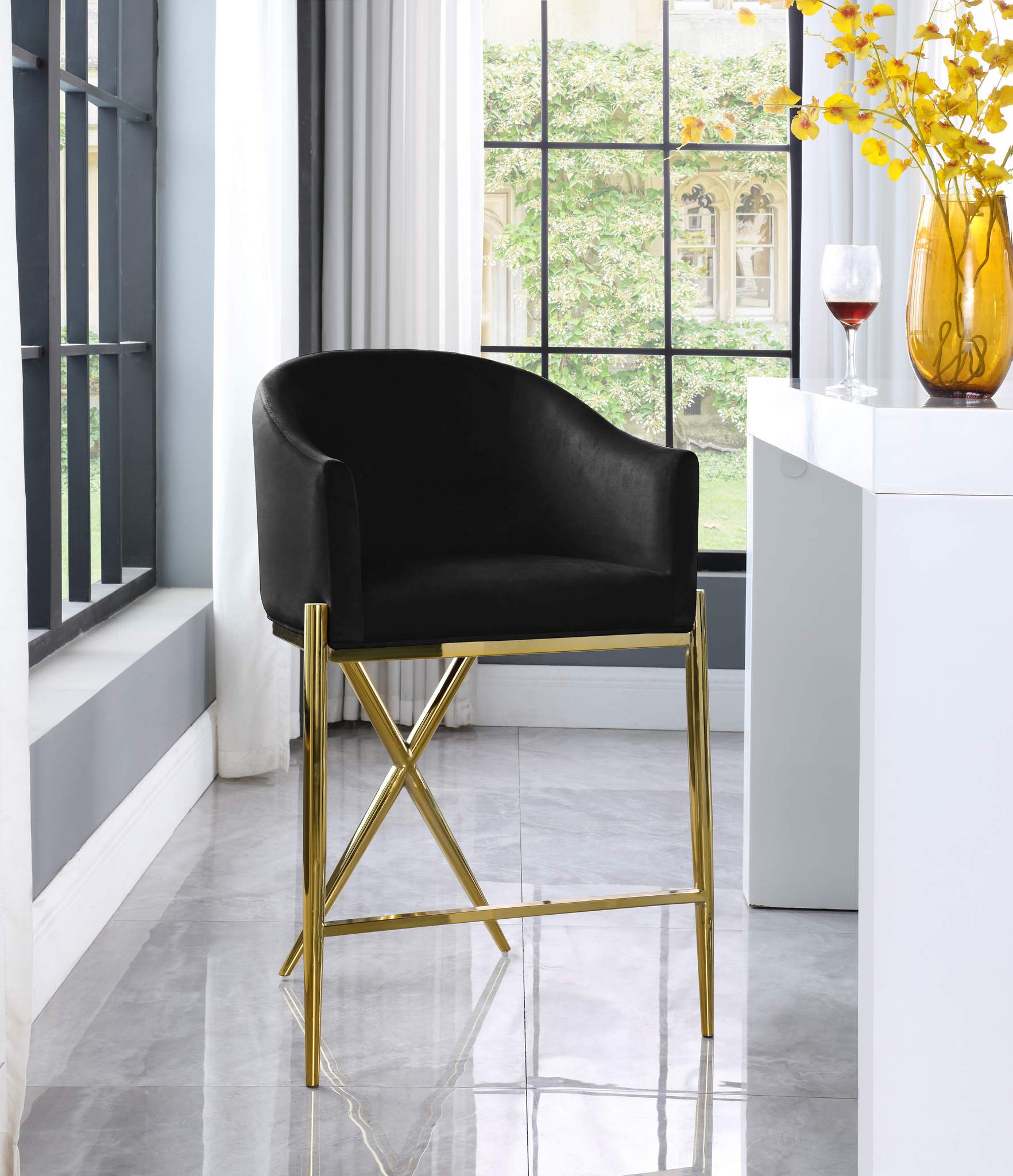 Mosey up to the home bar and find comfortable seating awaits when you have this Xavier counter stool to turn to. This stool features a rich black velvet upholstered barrel-style seat and back cushion and rests on gold metal legs with a metal frame for durability. This counter-height stool is just the thing to bring your modern counter or home bar setup into contemporary style.