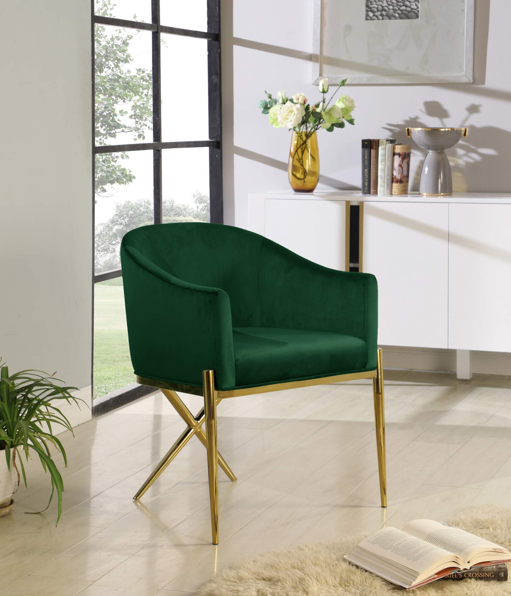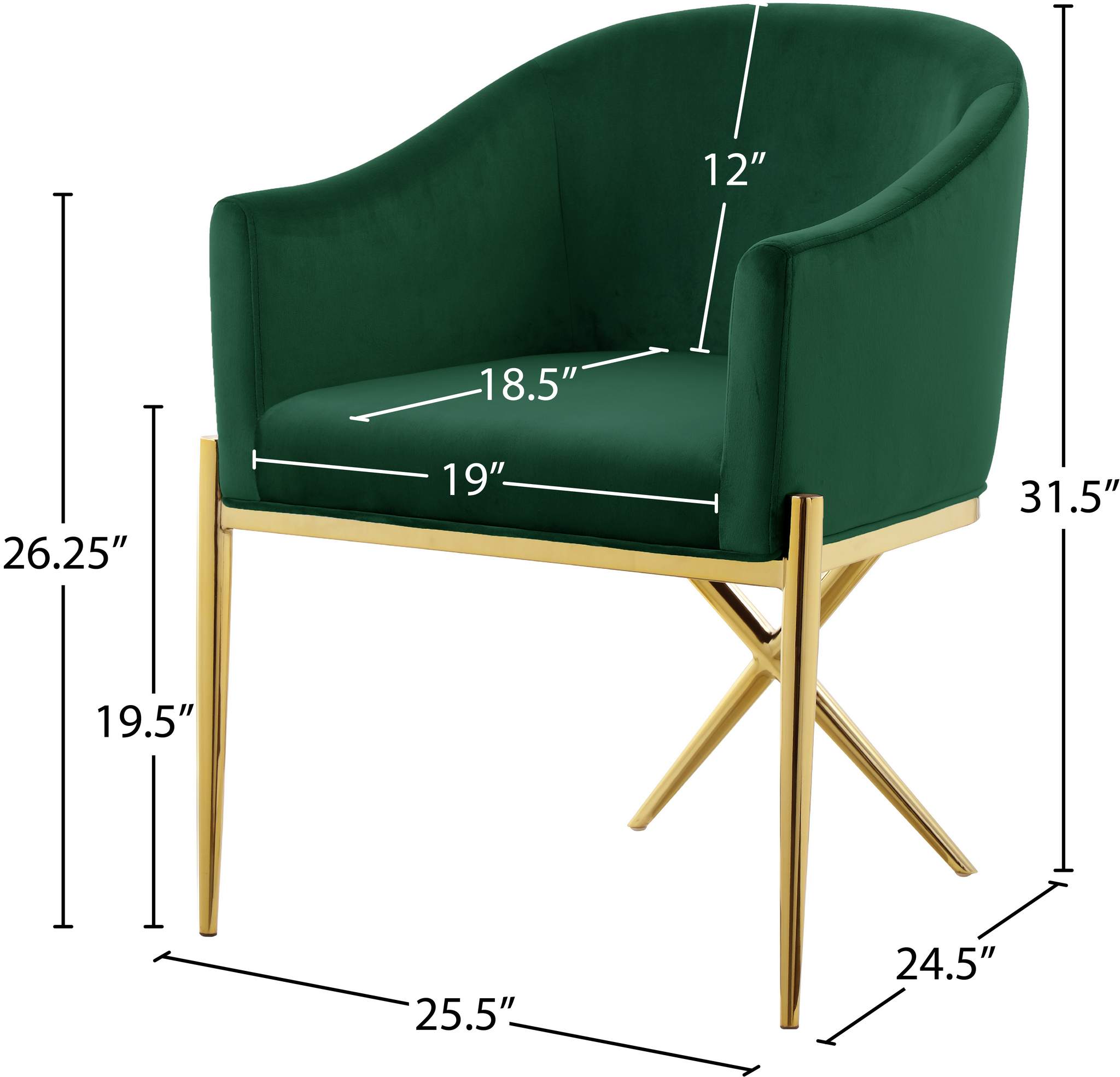 Spread elegance and modernity to your dining room with this Xavier green velvet dining chair from Meridian Furniture. This beautiful chair features a simple barrel seat with a plush cushion and back, ensuring that every meal is a comfortable one. The gold steel legs provide durable support while you sit, and an "X" leg in the back lends the chair an uber-modern vibe. Gold finishing on the base is sleek and chic, giving this chair a contemporary edge that's well at home in any modern dining room. Sleek green velvet upholstery is durable and tough yet soft against your body, elevating meal times to a luxurious experience.