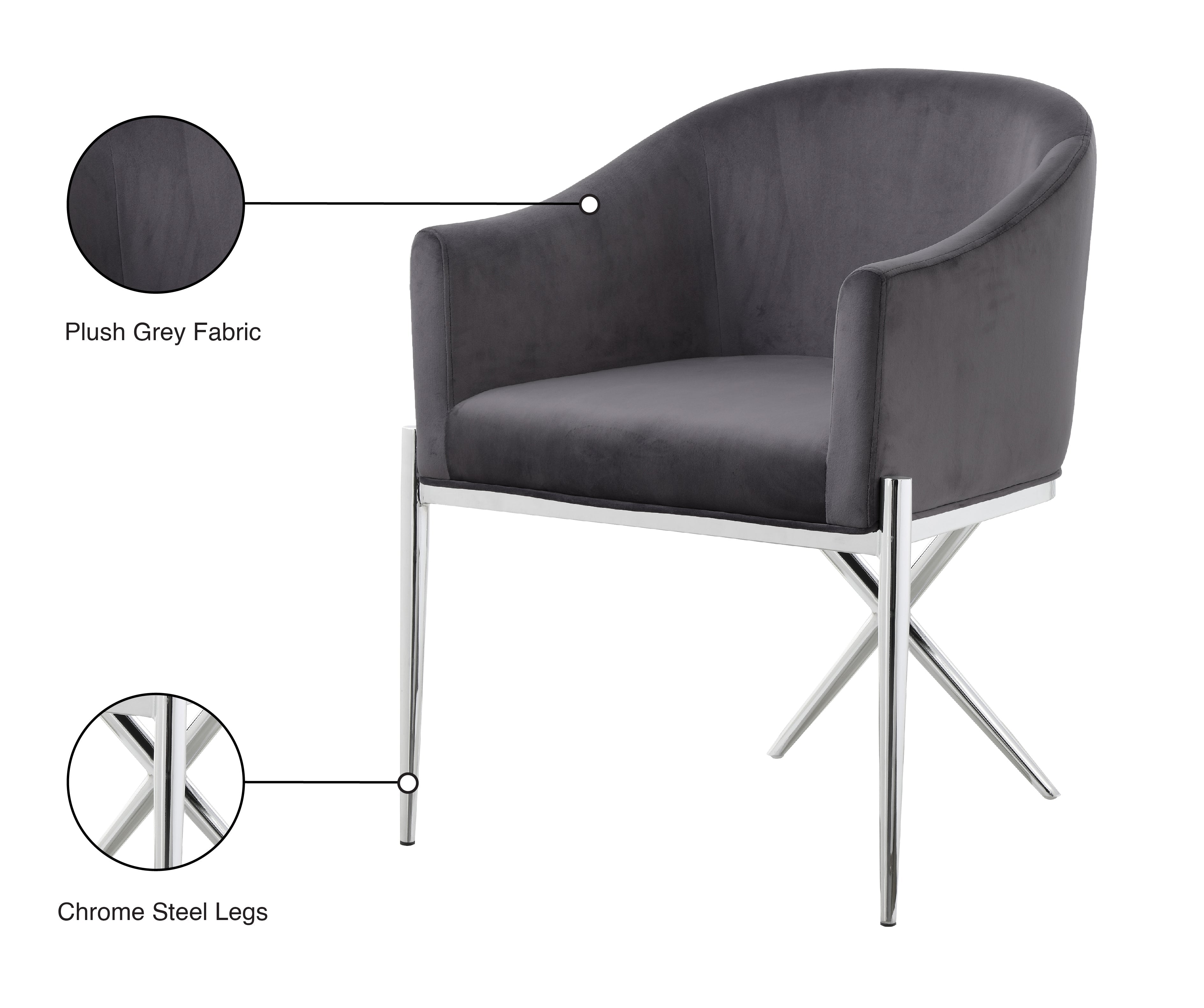 Spread elegance and modernity to your dining room with this Xavier grey velvet dining chair from Meridian Furniture. This beautiful chair features a simple barrel seat with a plush cushion and back, ensuring that every meal is a comfortable one. The chrome steel legs provide durable support while you sit, and an "X" leg in the back lends the chair an uber-modern vibe. Chrome finishing on the base is sleek and chic, giving this chair a contemporary edge that's well at home in any modern dining room. Sleek grey velvet upholstery is durable and tough yet soft against your body, elevating meal times to a luxurious experience.