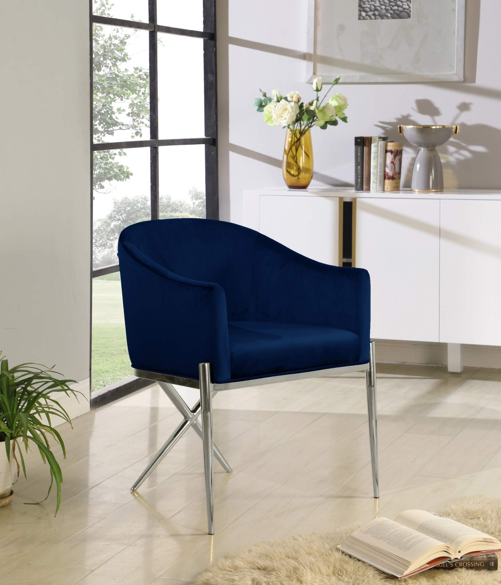 Spread elegance and modernity to your dining room with this Xavier navy velvet dining chair from Meridian Furniture. This beautiful chair features a simple barrel seat with a plush cushion and back, ensuring that every meal is a comfortable one. The chrome steel legs provide durable support while you sit, and an "X" leg in the back lends the chair an uber-modern vibe. Chrome finishing on the base is sleek and chic, giving this chair a contemporary edge that's well at home in any modern dining room. Sleek navy velvet upholstery is durable and tough yet soft against your body, elevating meal times to a luxurious experience.