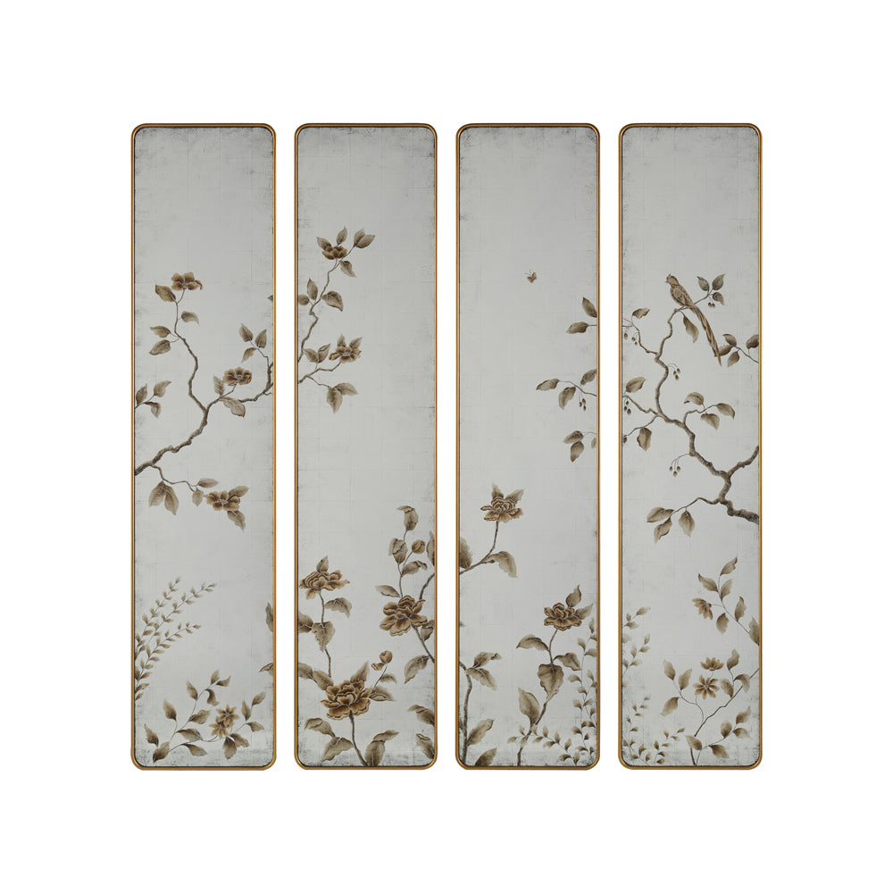 Each wall panel in this set of four features a cockbead molding in Aztec gold that frames A glomisA with a hand-painted foliage design. These panels are designed for portrait orientation only.