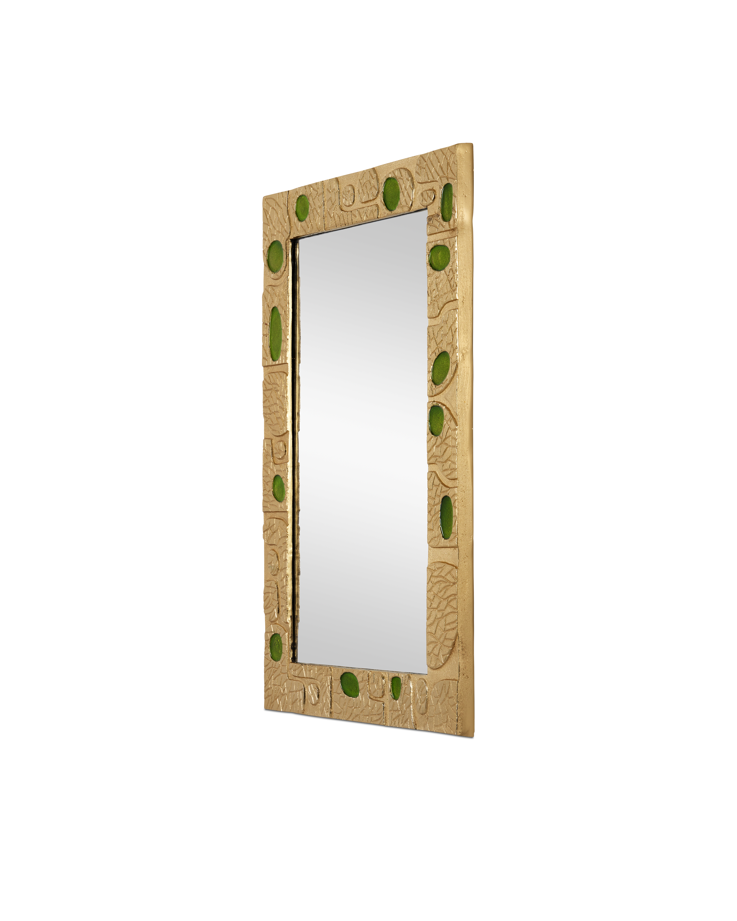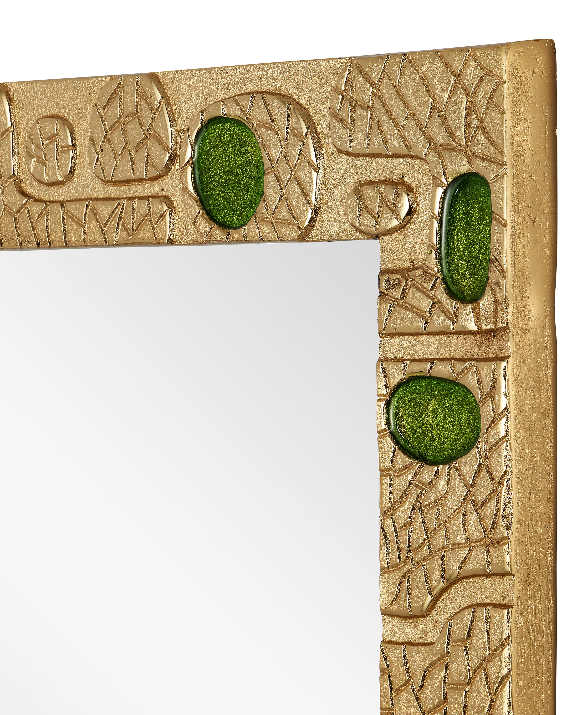 Inspired by a 1940s design, the Beau Monde Gold & Green Mirror has textural shapes made of aluminum in a gold finish ornamented with green enamel lozenges fitted in place to create a lively pattern running along its frame. Inspired by a mirror seen at a French flea market, the gold decorative mirror is fitted with beveled mirrored glass. It comes with two cleats so it can be hung horizontally or vertically.