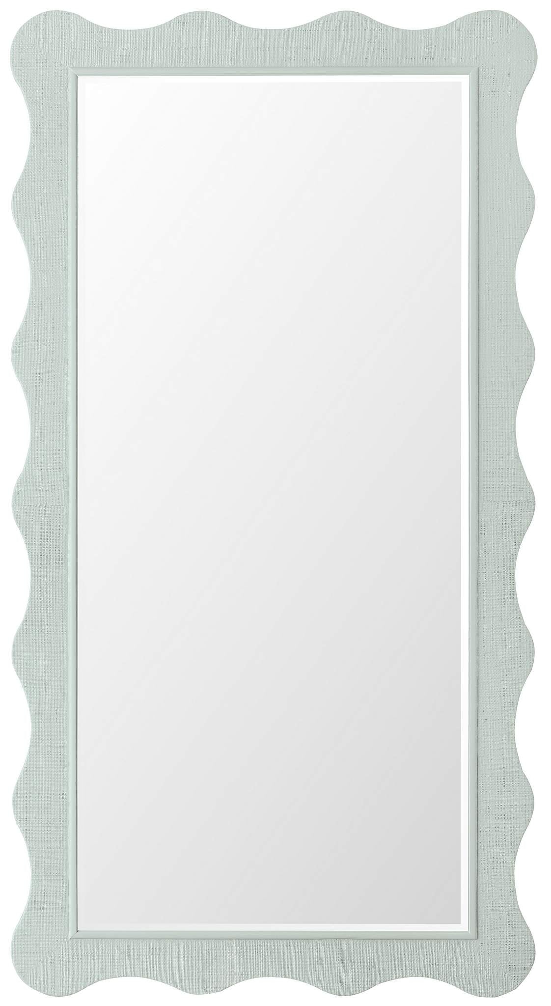 Elevate your entryway or bedroom with the Waverly Leaner Mirror, featuring a scalloped silhouette, beveled glass, and a unique blue-green painted raffia frame. A bold blend of texture and color for modern eclectic spaces.
