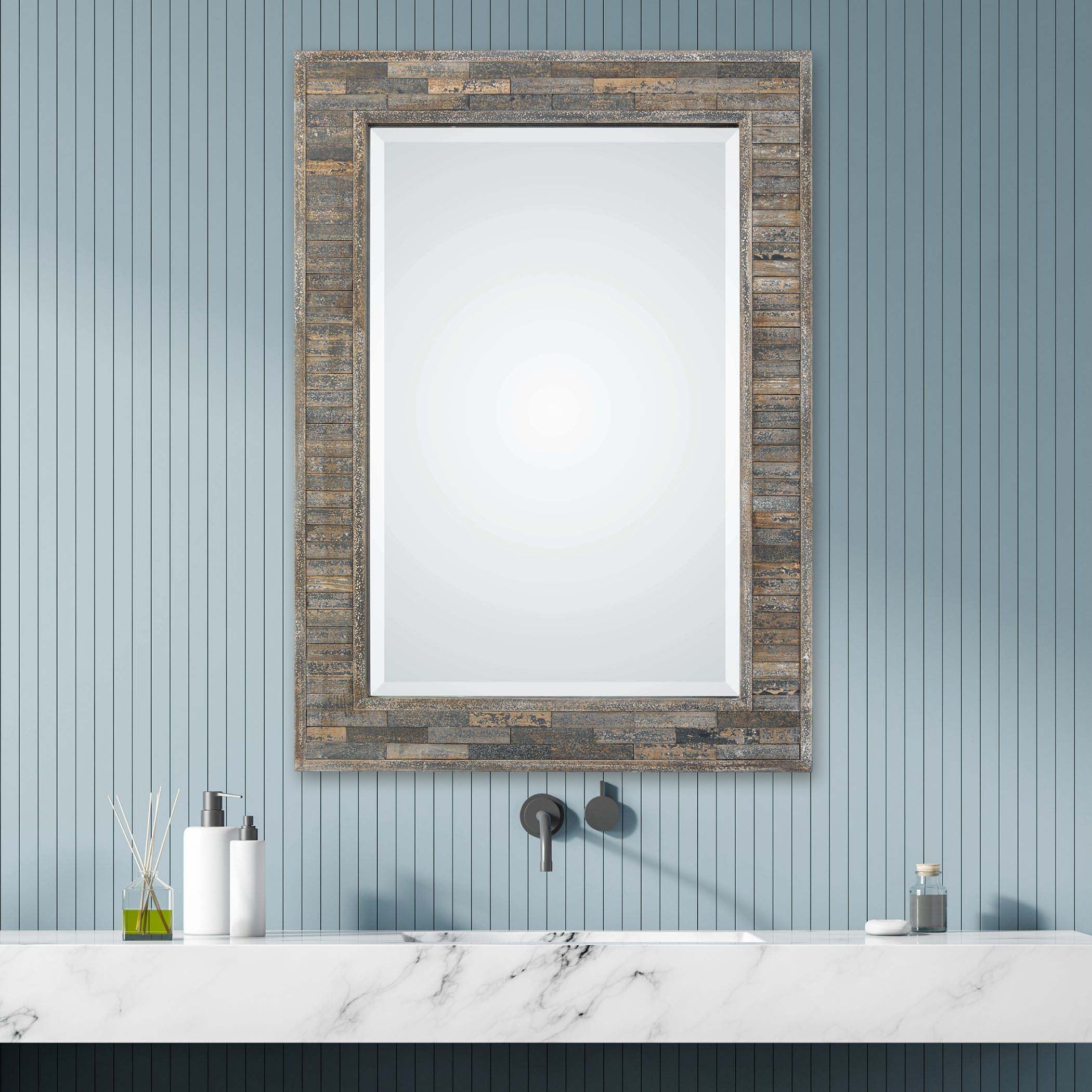 Strips of weathered pine, finished in a heavily distressed charcoal blue, with natural undertones, create an aged wood frame. The mirror has a 1 bevel. May be hung either vertically or horizontally.