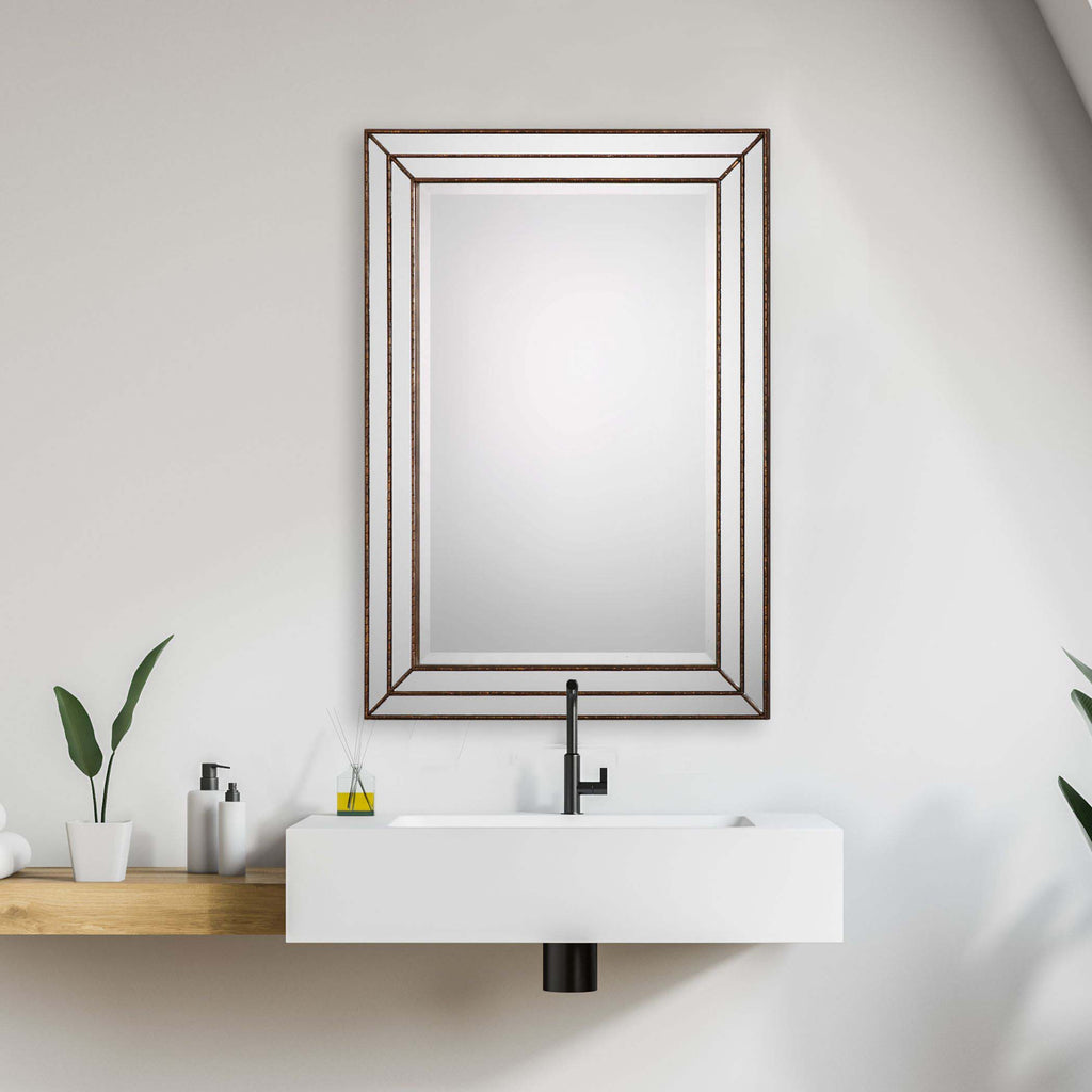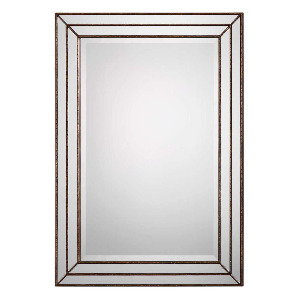 This frame features mirror inlays, separated by thin, grooved framing strips, finished in a metallic bronze. The center mirror has a 1 bevel. This frame may be hung either vertically or horizontally. Also available in silver, W00404.