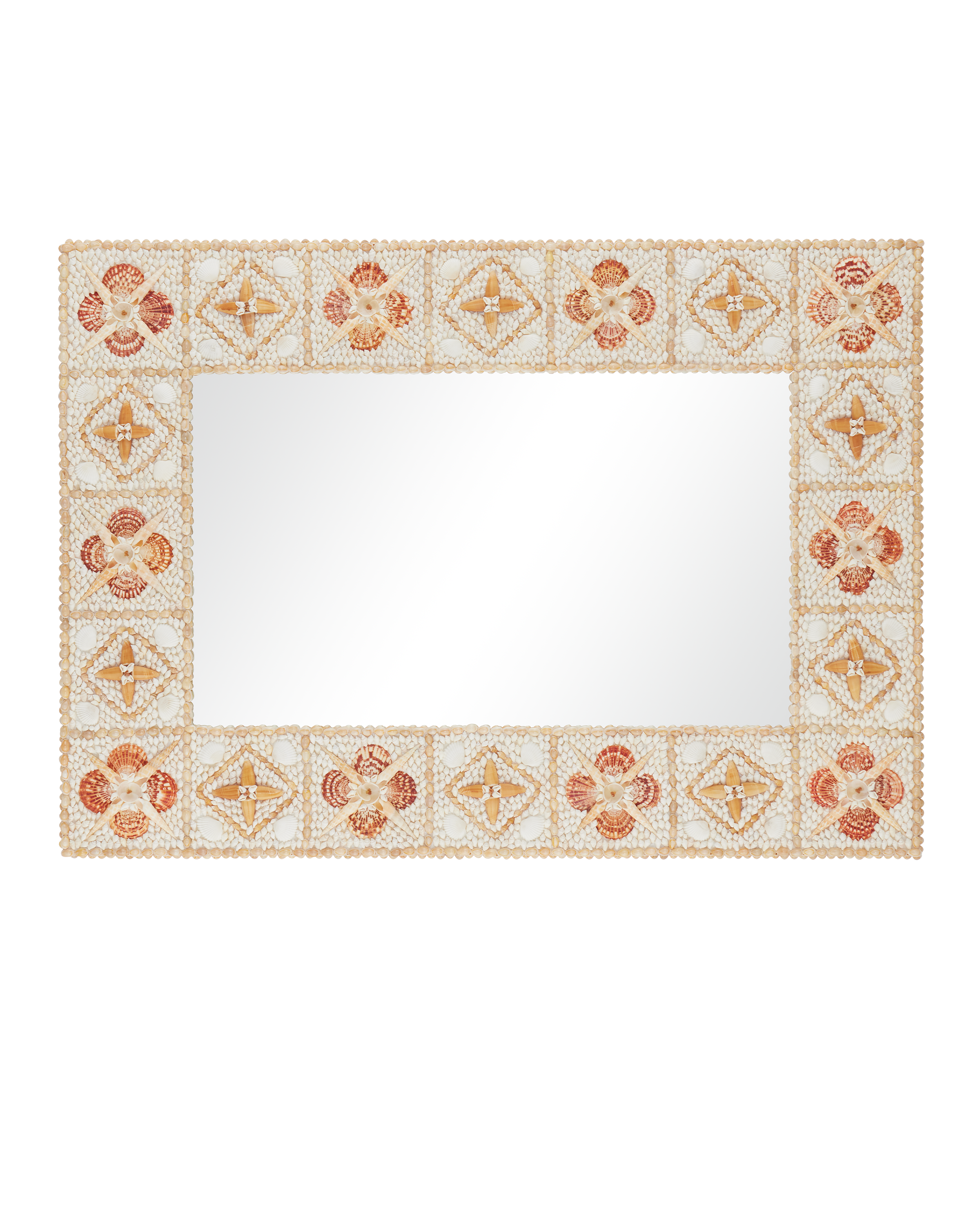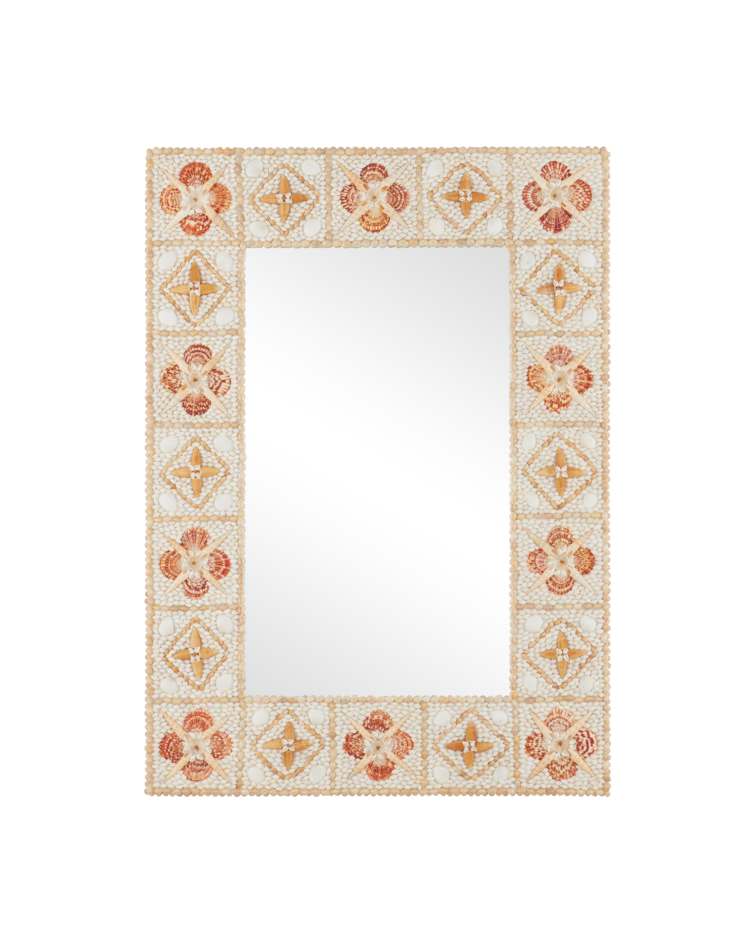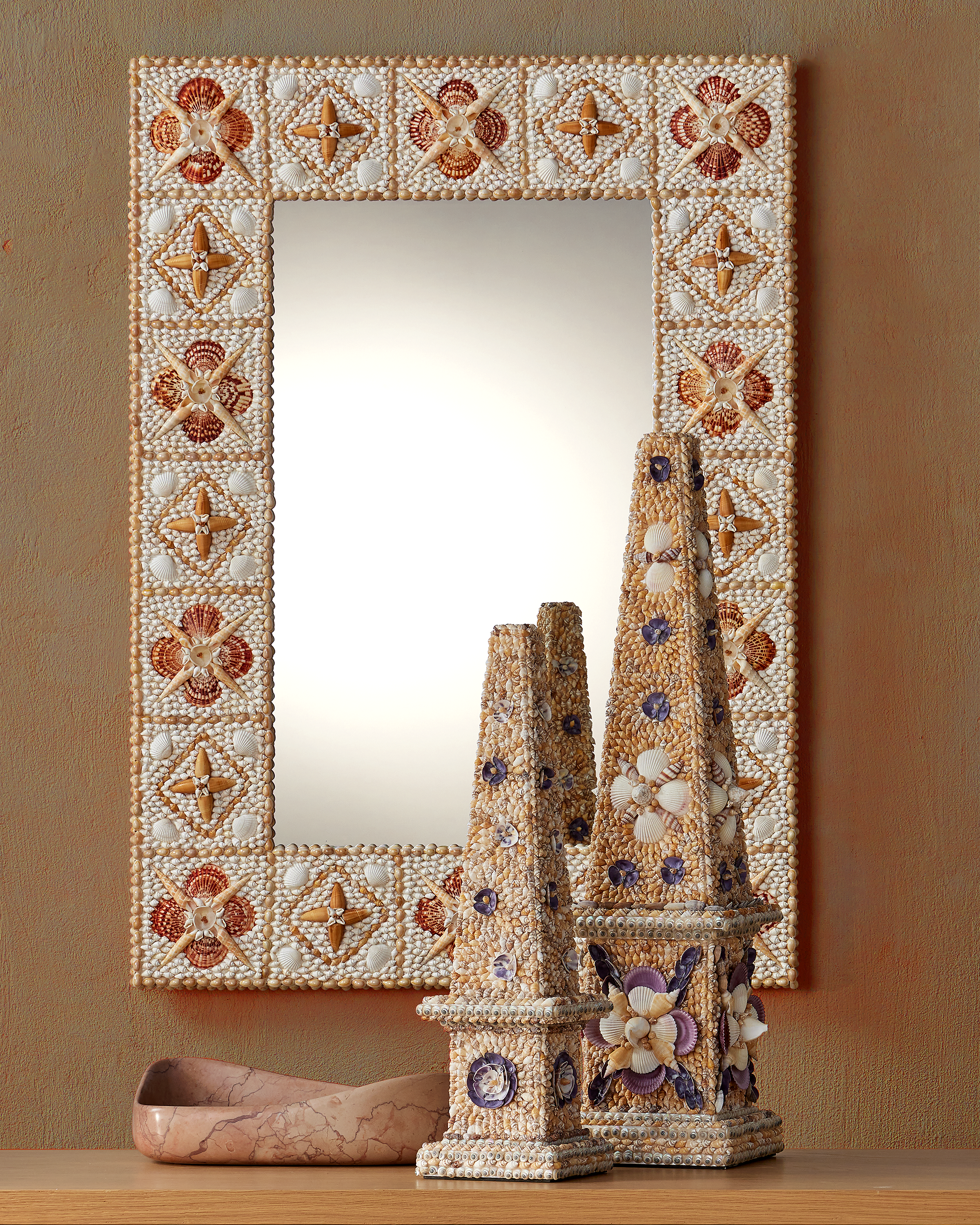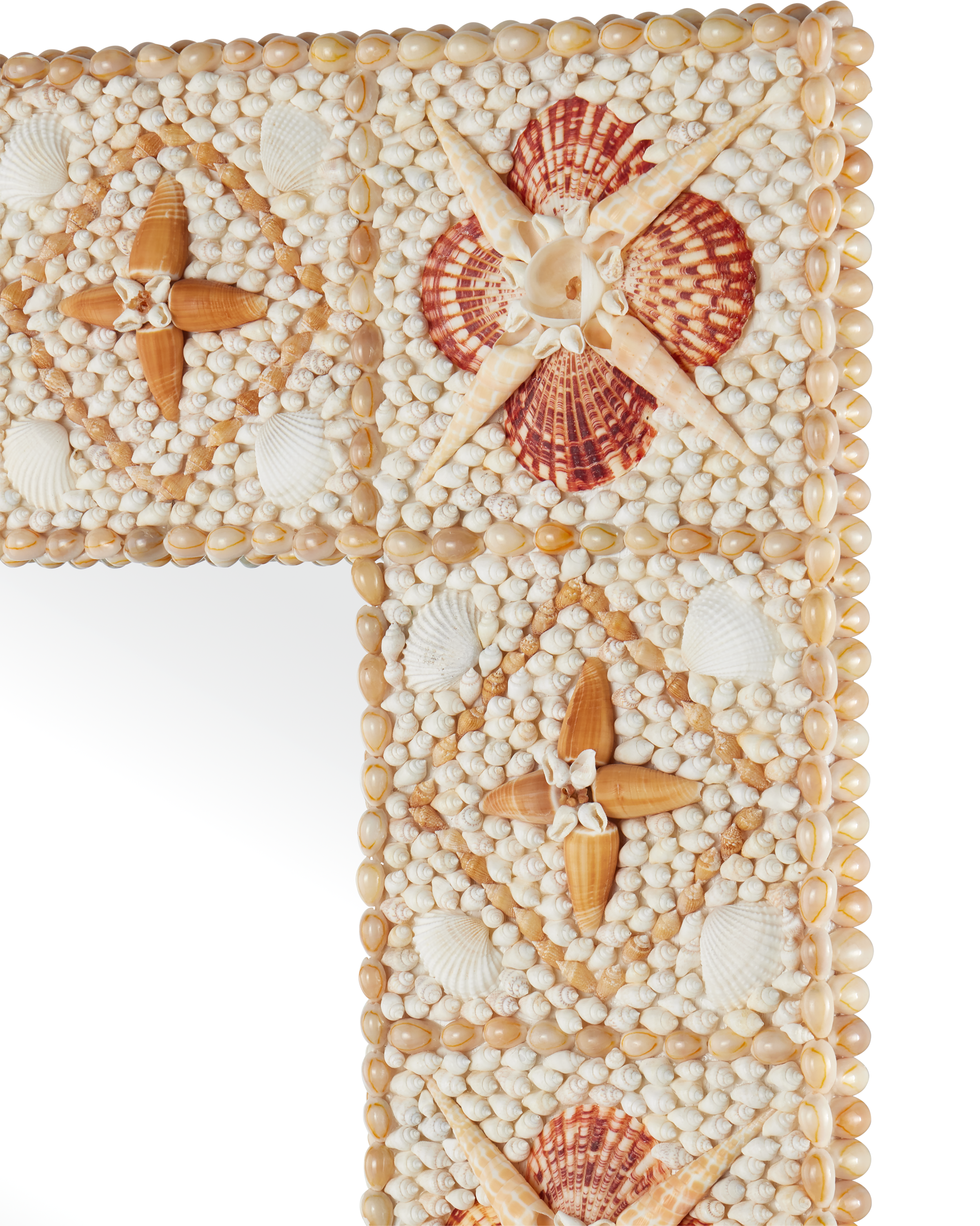 The Junonia Rectangular Mirror has a stunning shell-incrusted frame created in the tradition of coquillage, one of the world’s oldest forms of mosaics made of natural shells. Its intricate surface pattern features delicate floral motifs in shades of pale peach, white, and purple. Each decorative mirror, which will include cleats for hanging horizontally or vertically and extra shells, will vary slightly given the shells are natural.