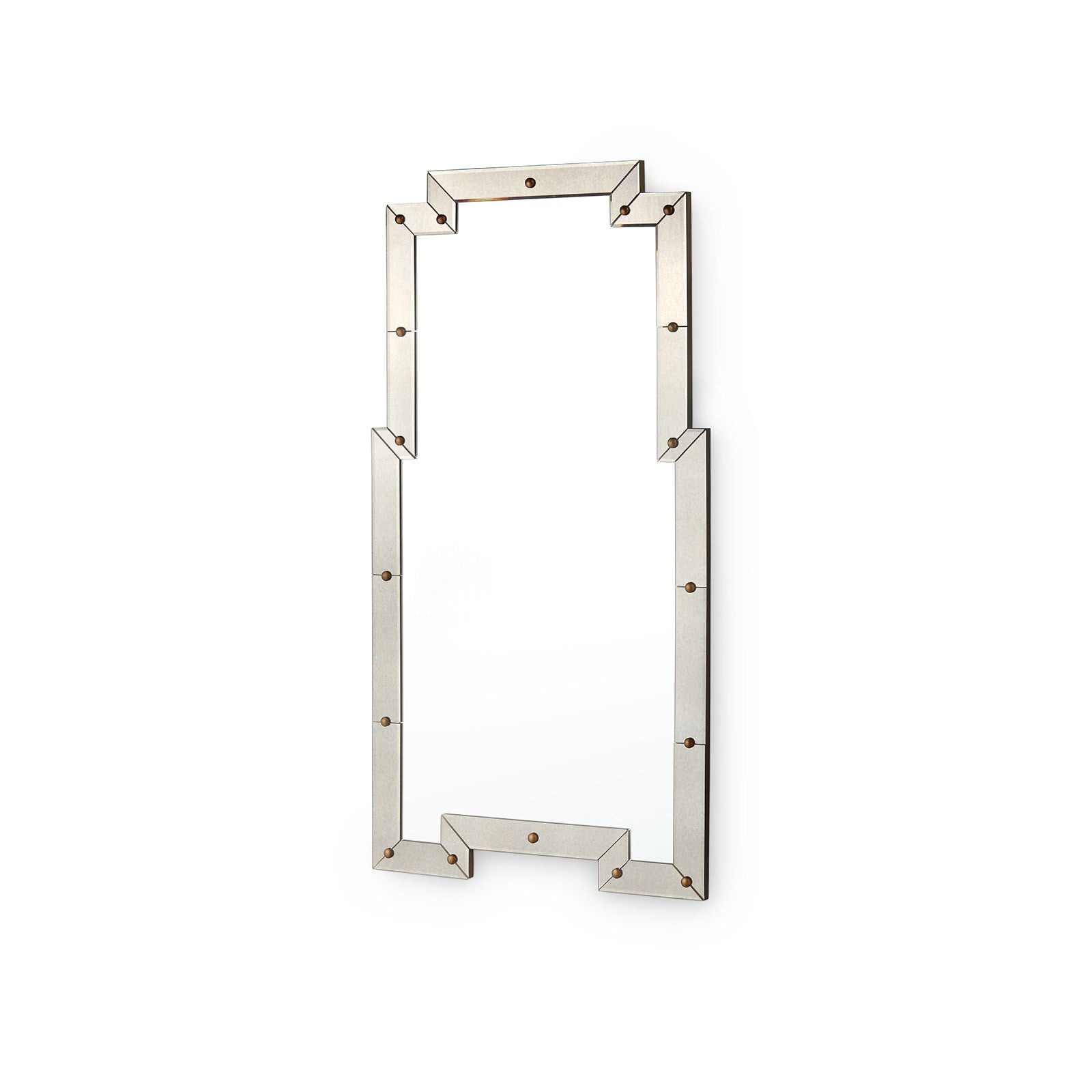 Industrial styling meets antique allure. With our Lane Mirror, Villa & House’s artisans have taken the inventive angles and materials of 1920s Art Deco design and applied a touch of the ancient world, creating a silhouette that resembles the stepped ziggurats of history. Together with the mirror-on-mirror finishing, beveled borders, and antique hardware cabochons, the Lane embodies vintage glamour with timeless appeal. Installed above a fireplace, console, or bedroom dresser, the mirror acts as a sophisticated accent piece that—quite literally—reflects good taste.23.5w x 1d x 42h