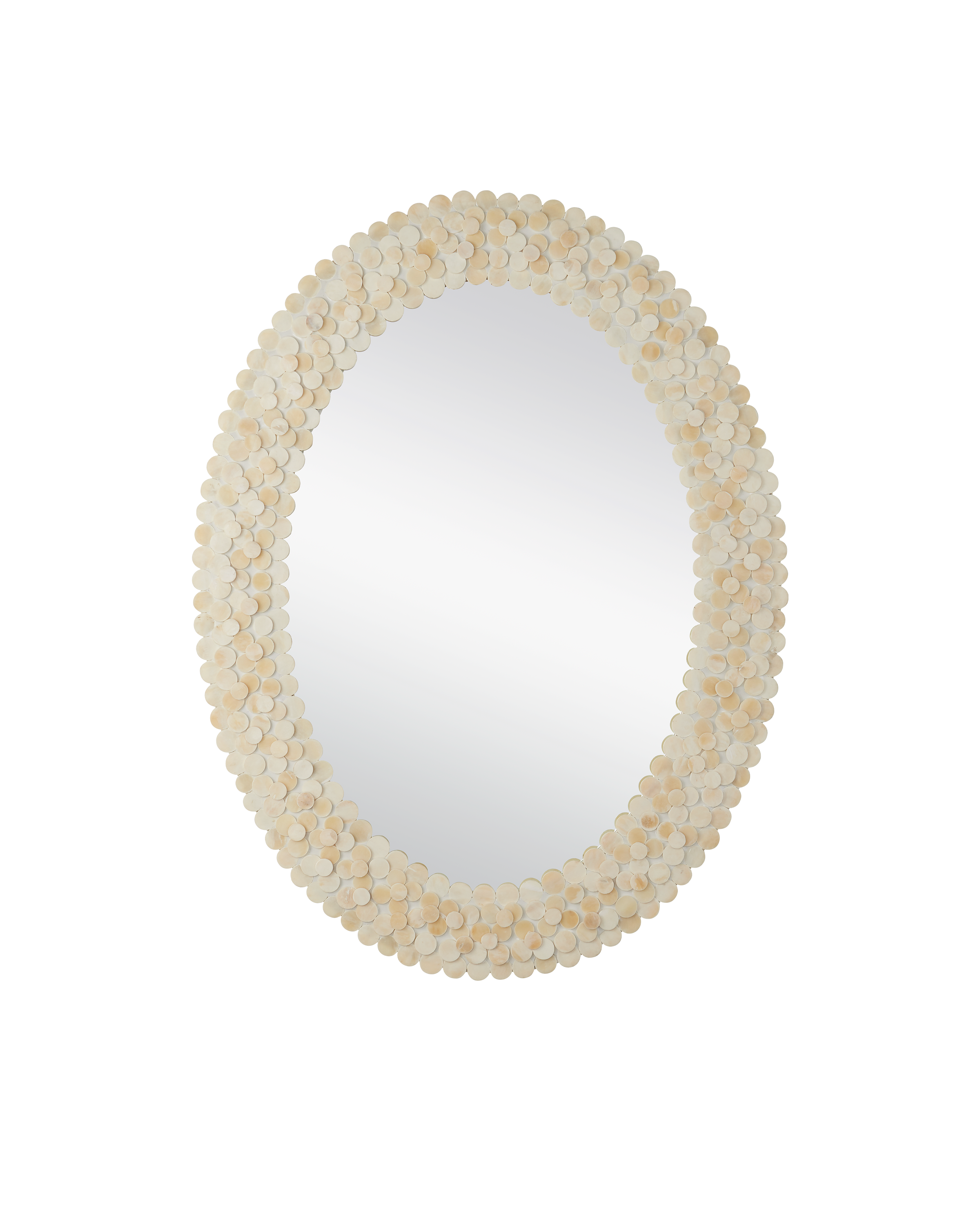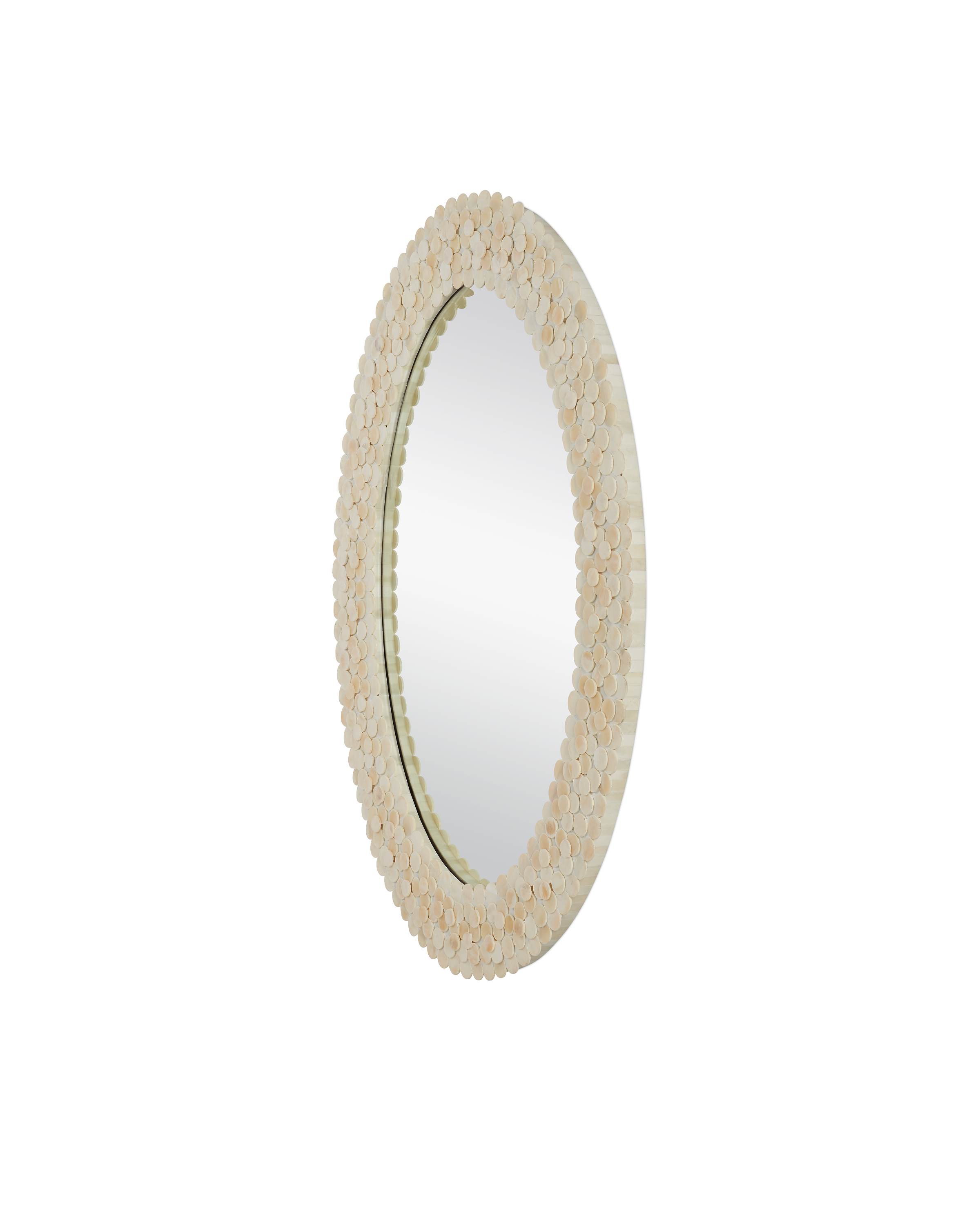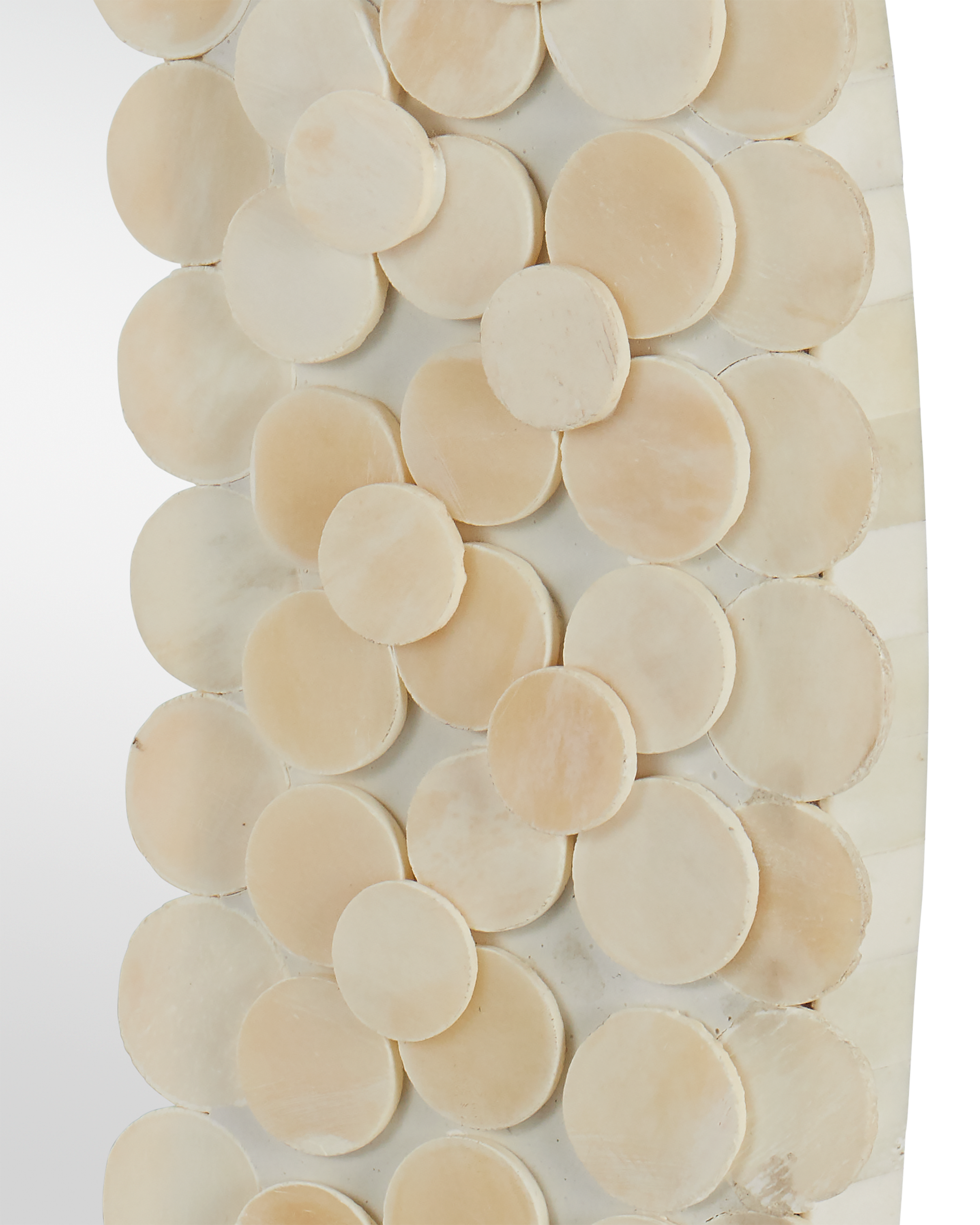 The Merriam Oval Mirror has an lovely frame fitted with over 200 hand-ground buffalo-bone discs. The color variations in the delicate bone bring this ivory decorative mirror a textural interest, while the painstaking placement of the circlets brings it a sophisticated feel. There is no bevel on the mirror.