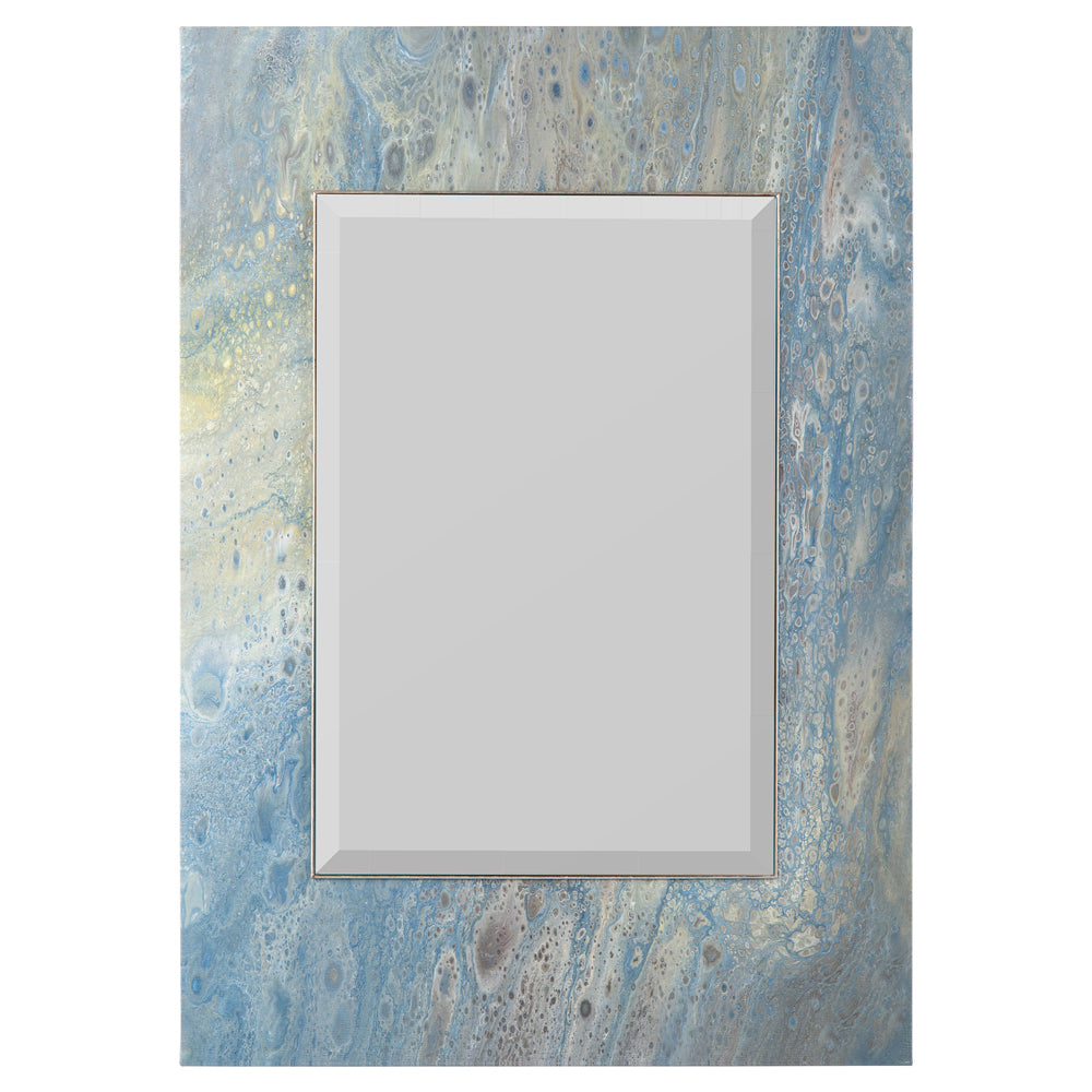 This mirror featuring Pavo by Shaye Rawson is a unique design where wall art is converted into a mirror. The canvas surrounding the modern beveled mirror is enhanced with a broken vitreous finish that gives the illusion of water.