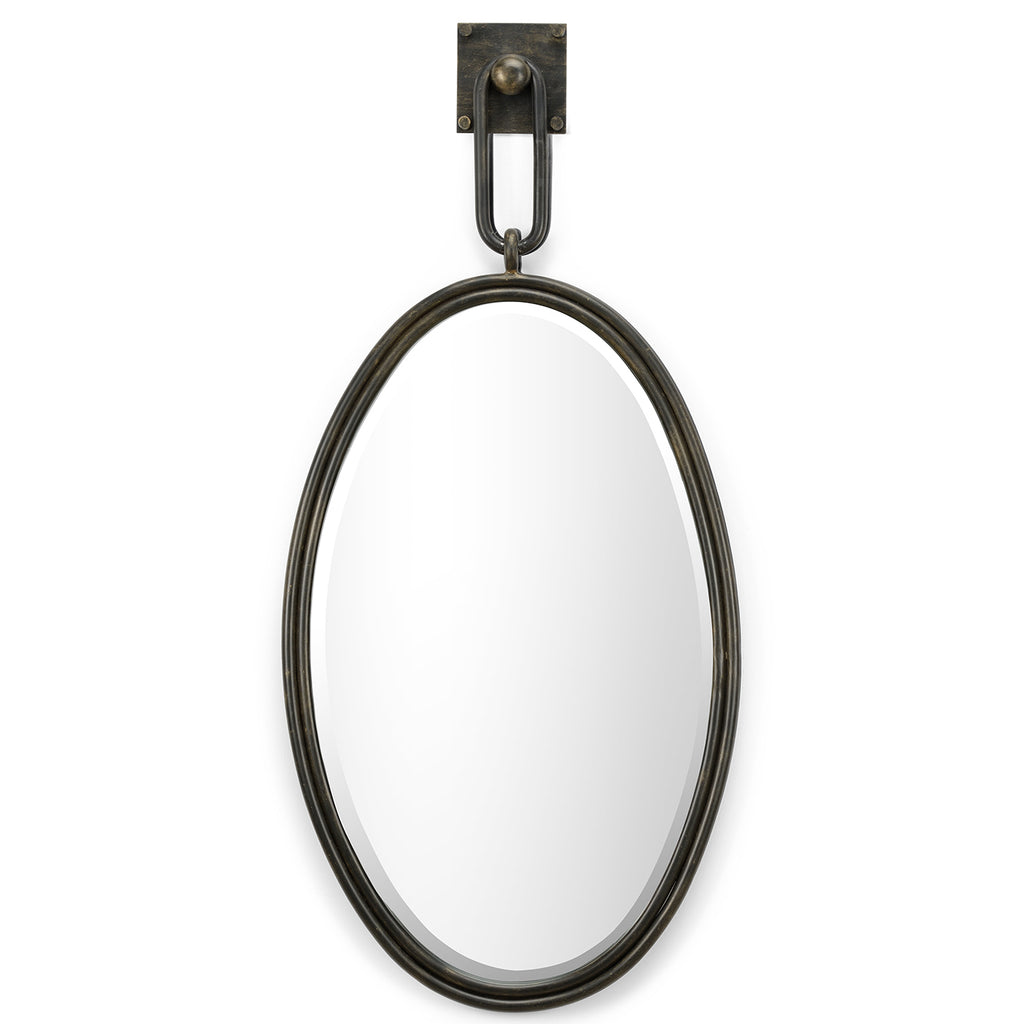 Open up your space while adding style with Tobago Mirror. This large oval mirror features an antiqued bronze finish on a iron frame. This modern contemporary design is suspended from a square wall hook for added dimension. Worthy of its own space, hang this beveled mirror on a wall in your home to reflect your decorative aesthetic. (Available in other sizes and finishes)