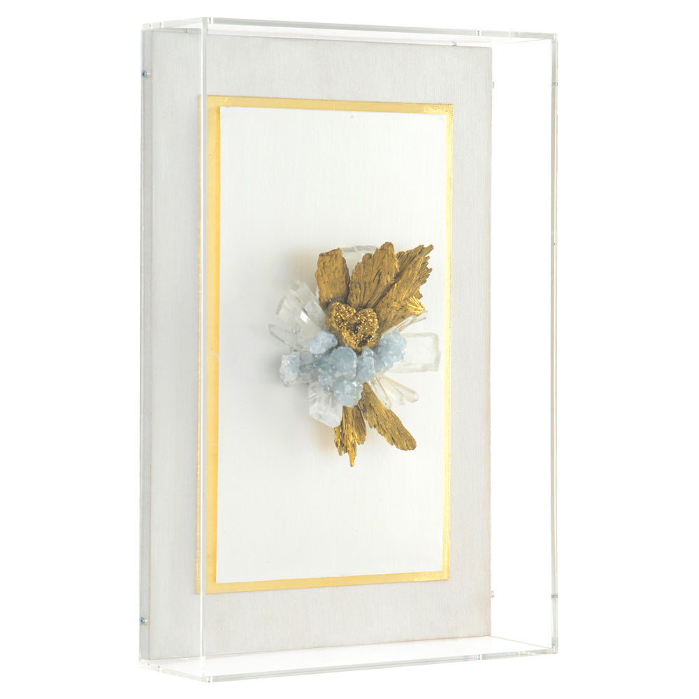 A statement crystallized piece featuring quartz and calcite is displayed on a panel of pearl white inside an acrylic box.