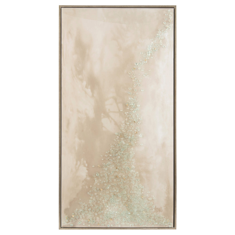 This soft pale sepia abstract by glass artist Mary Hong is a strong statement. Highlighted with her signature broken glass and high-gloss vitreous finish, this piece of art will stand out in any space. It is framed in a silver-edged gallery molding.
