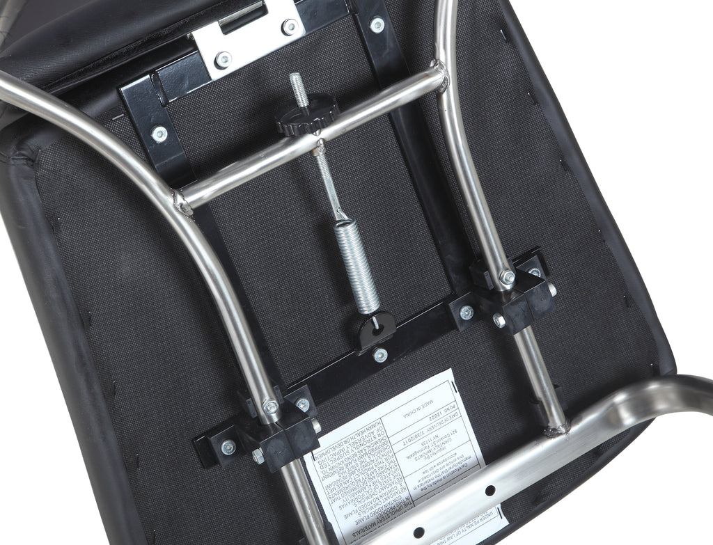 This contemporary motion back side chair features a tension adjustment knob underneath the seat for, white faux leather upholstery and a steel frame in chrome finish.