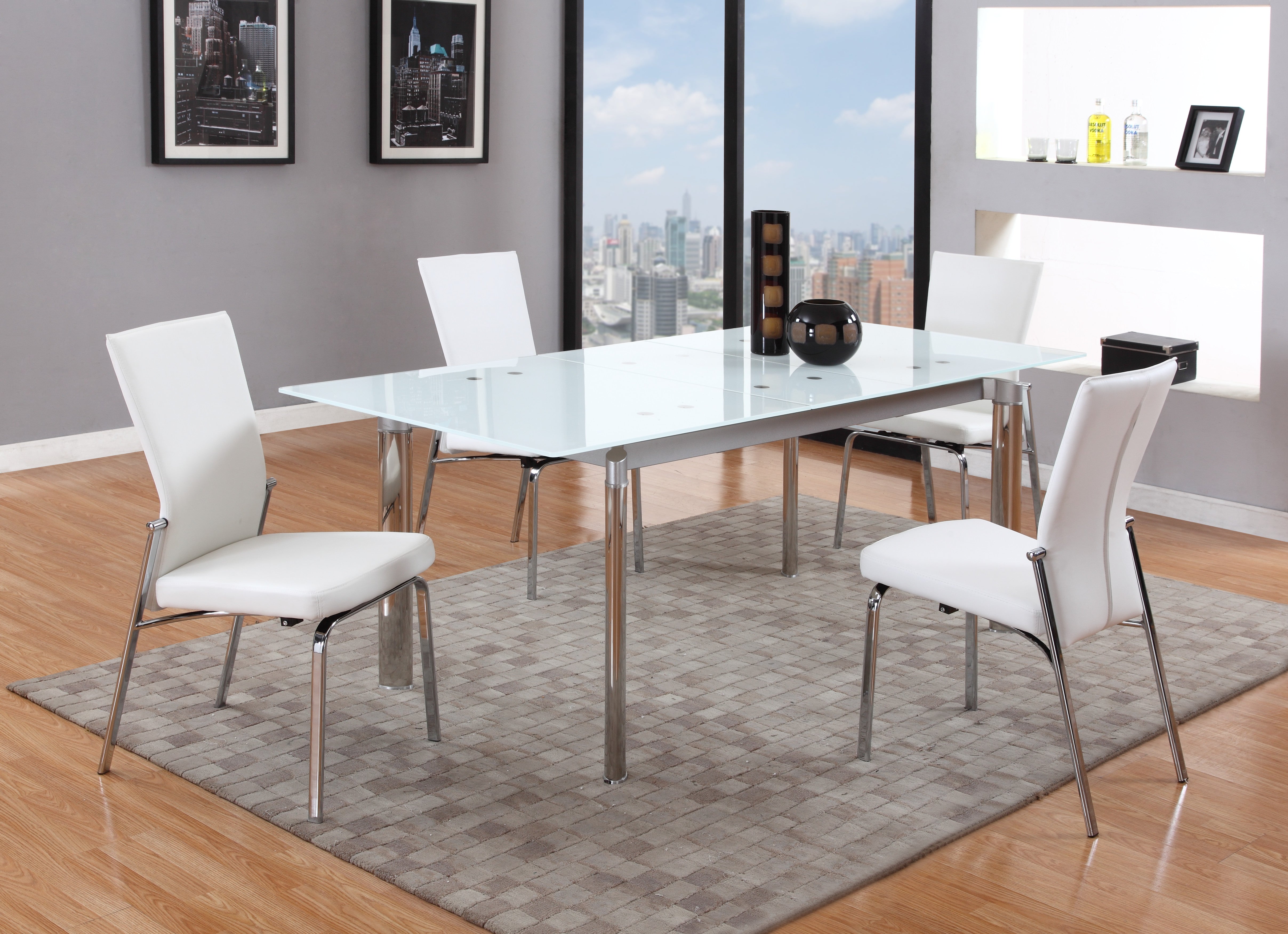This contemporary motion back side chair features a tension adjustment knob underneath the seat for, white faux leather upholstery and a steel frame in chrome finish.