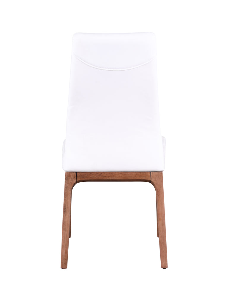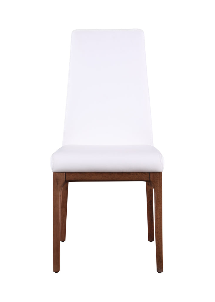 This modern contour back side chair is upholstered in white faux leather, supported by a solid wood frame with walnut finish.