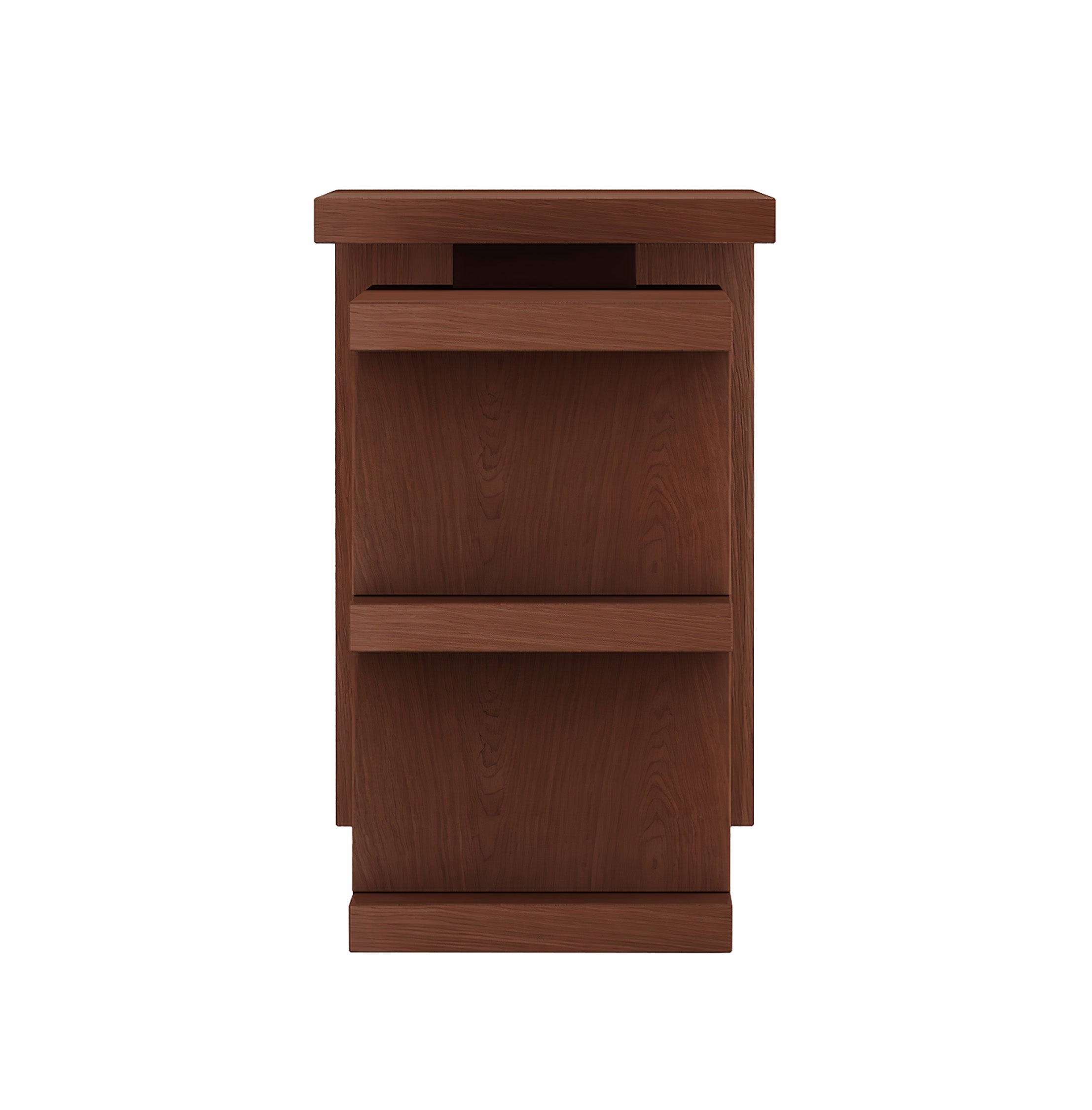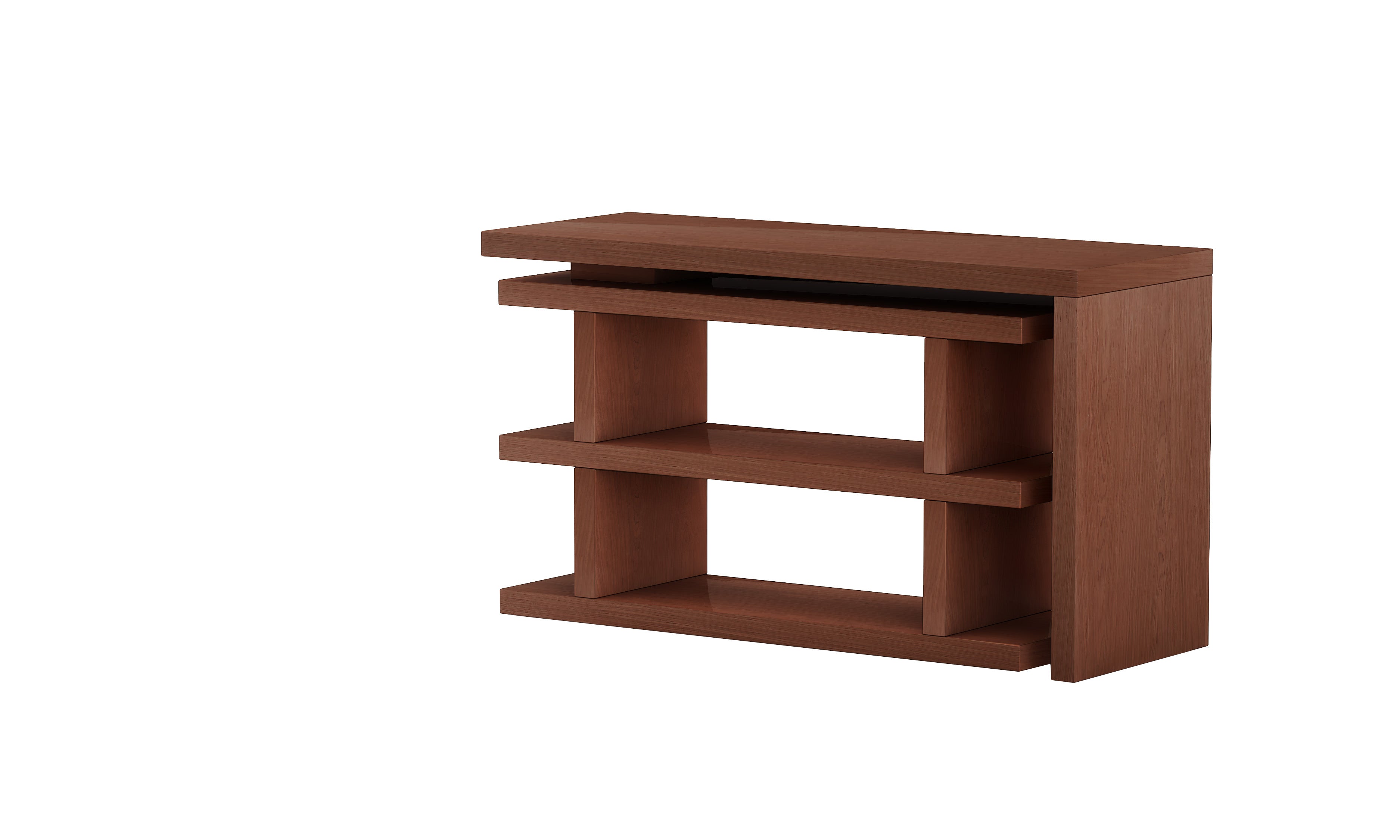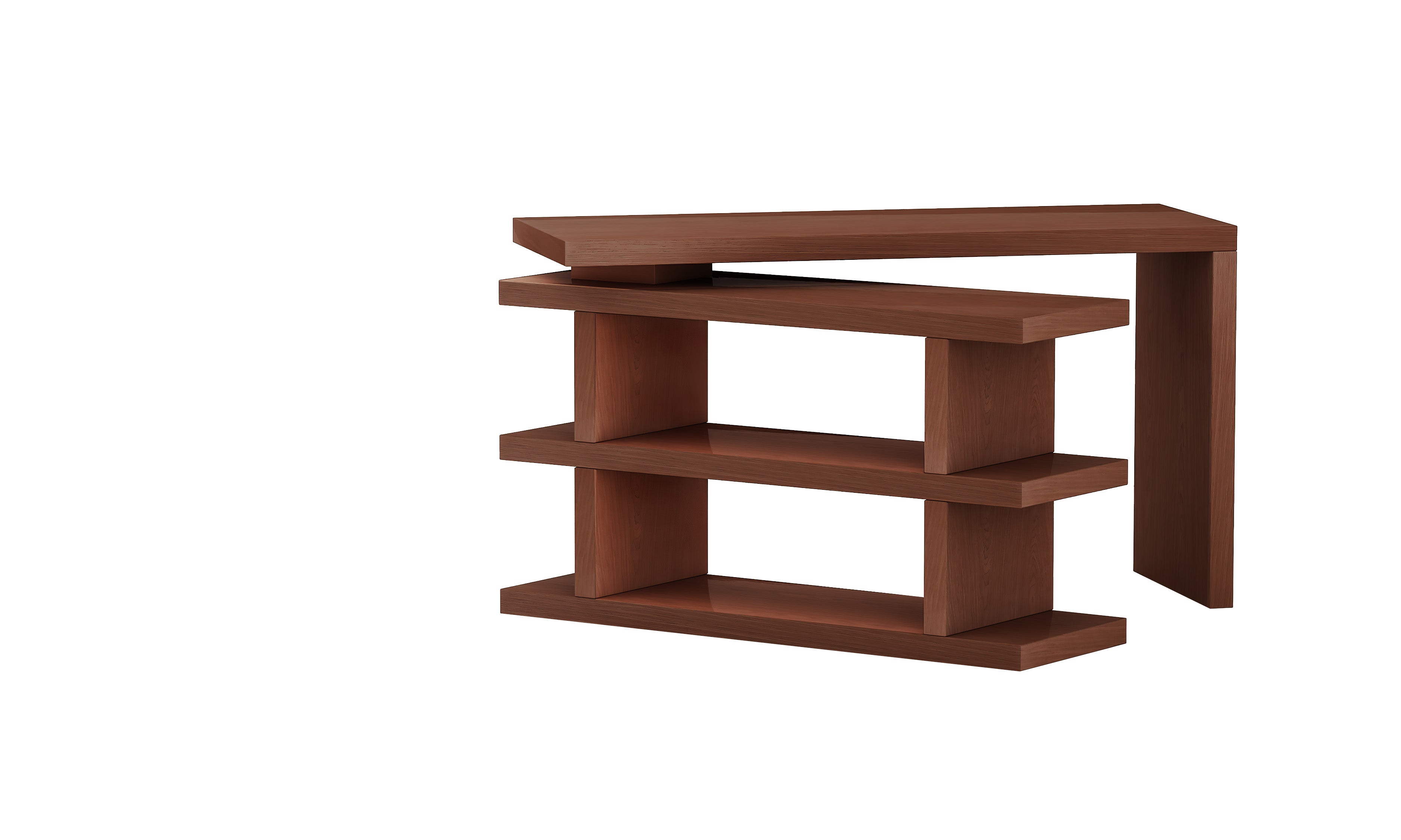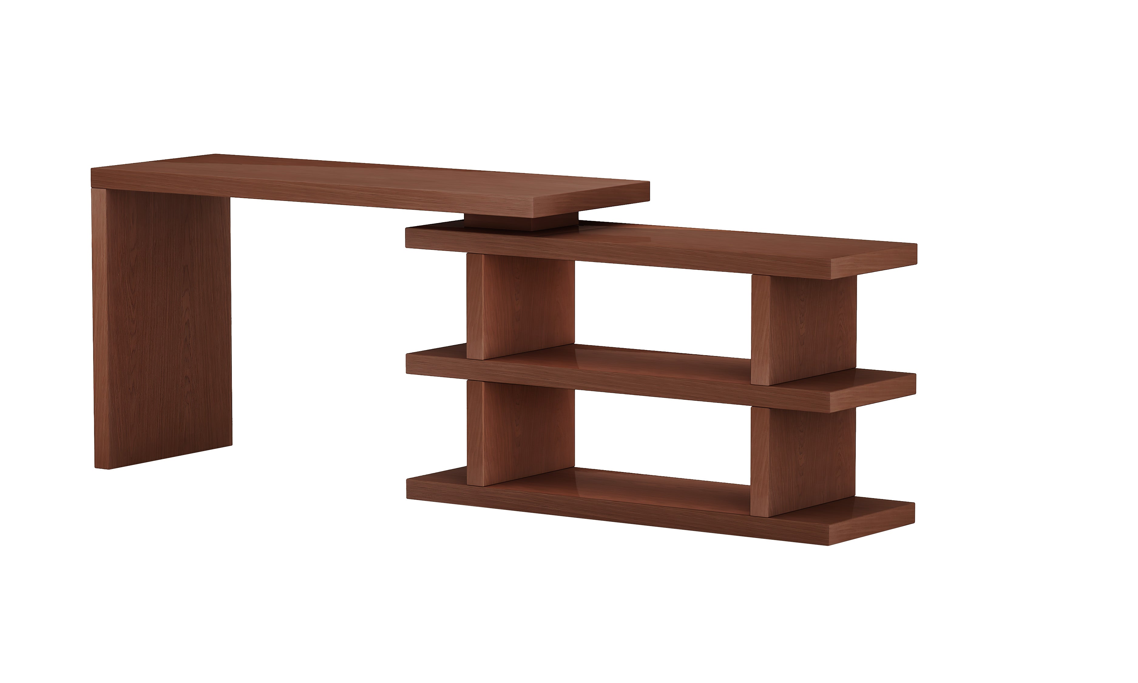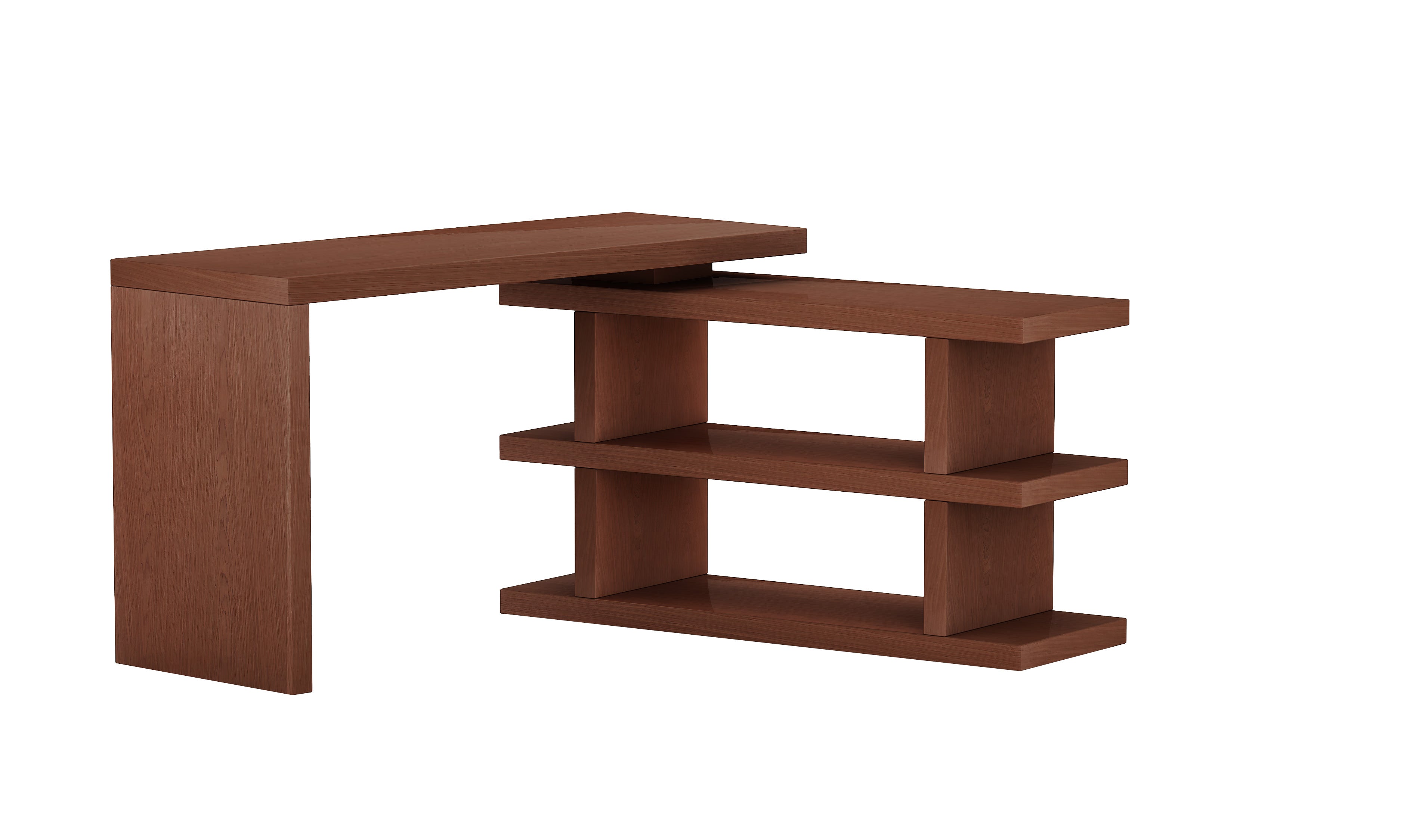 This home office desk features a turntable shelf that rotates completely to position left, right or closed, nesting the shelf area under the desk.