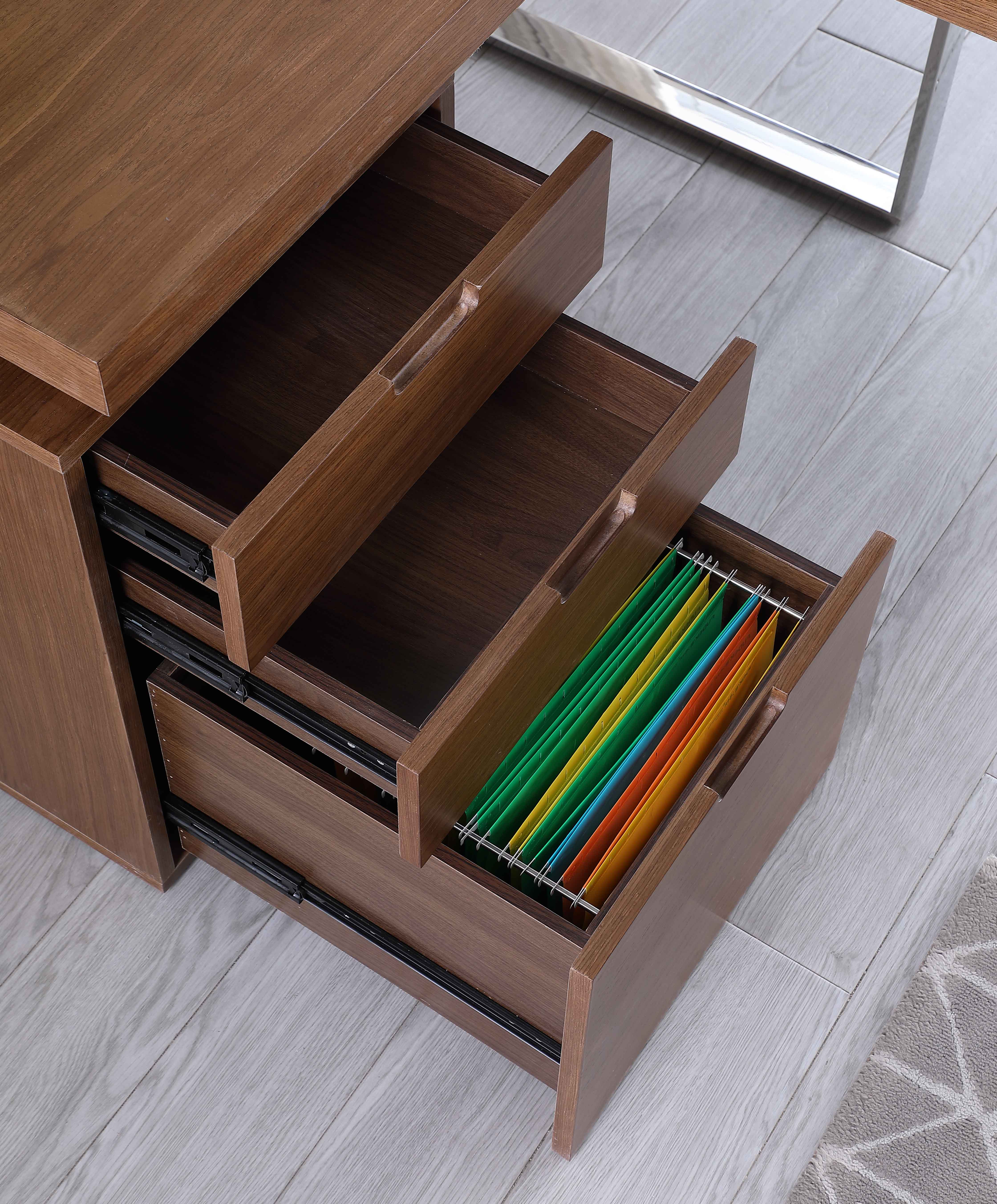 Modern elegance redefines the workspace with this functional desk. A reversible wooden desk top in a warm walnut finish features polished stainless steel legs and a matching wooden 3-drawer filing cabinet with a large bottom drawer perfect for larger storage items. Situate this desk in one of two configurations to best fit your workspace.