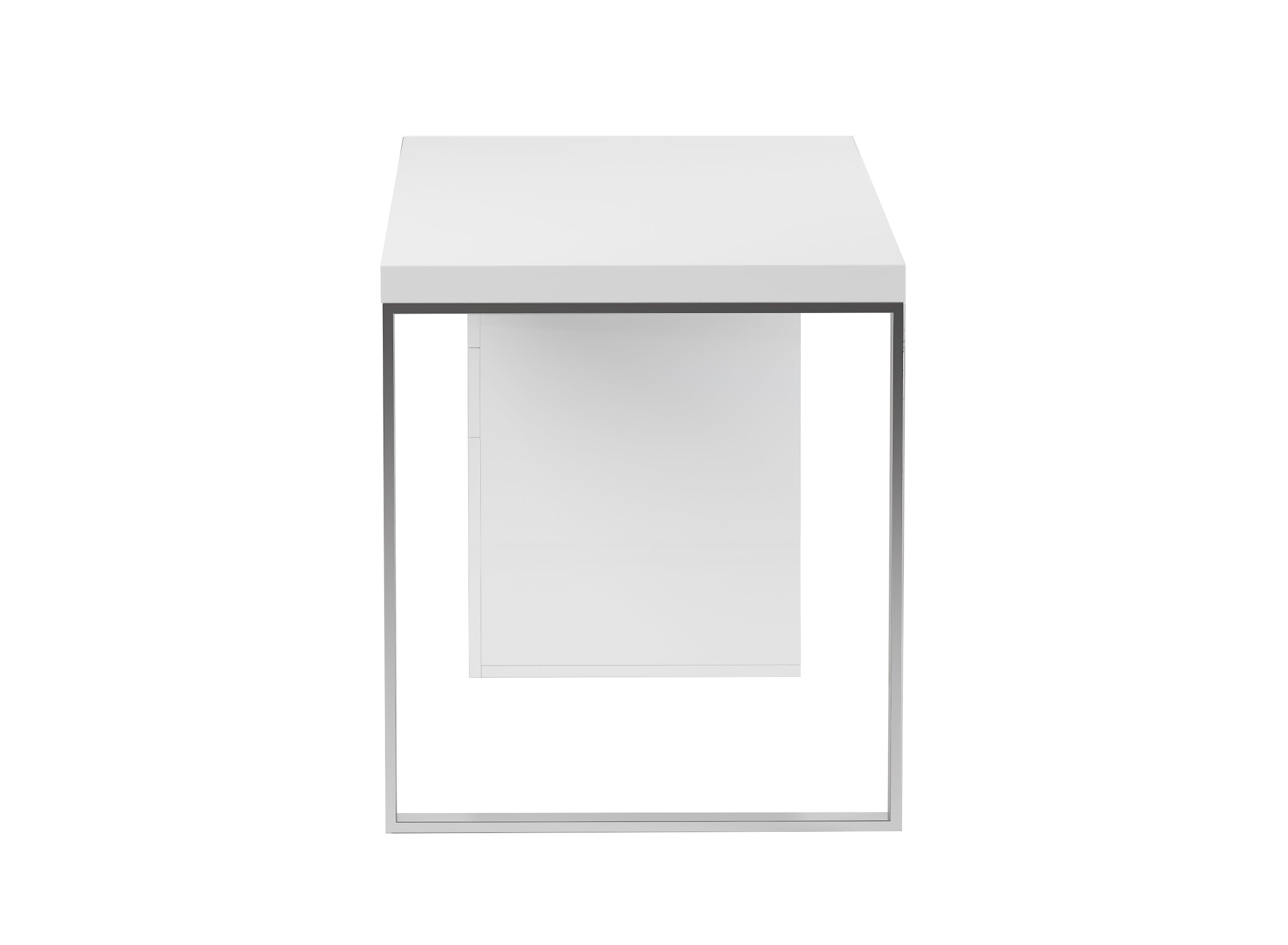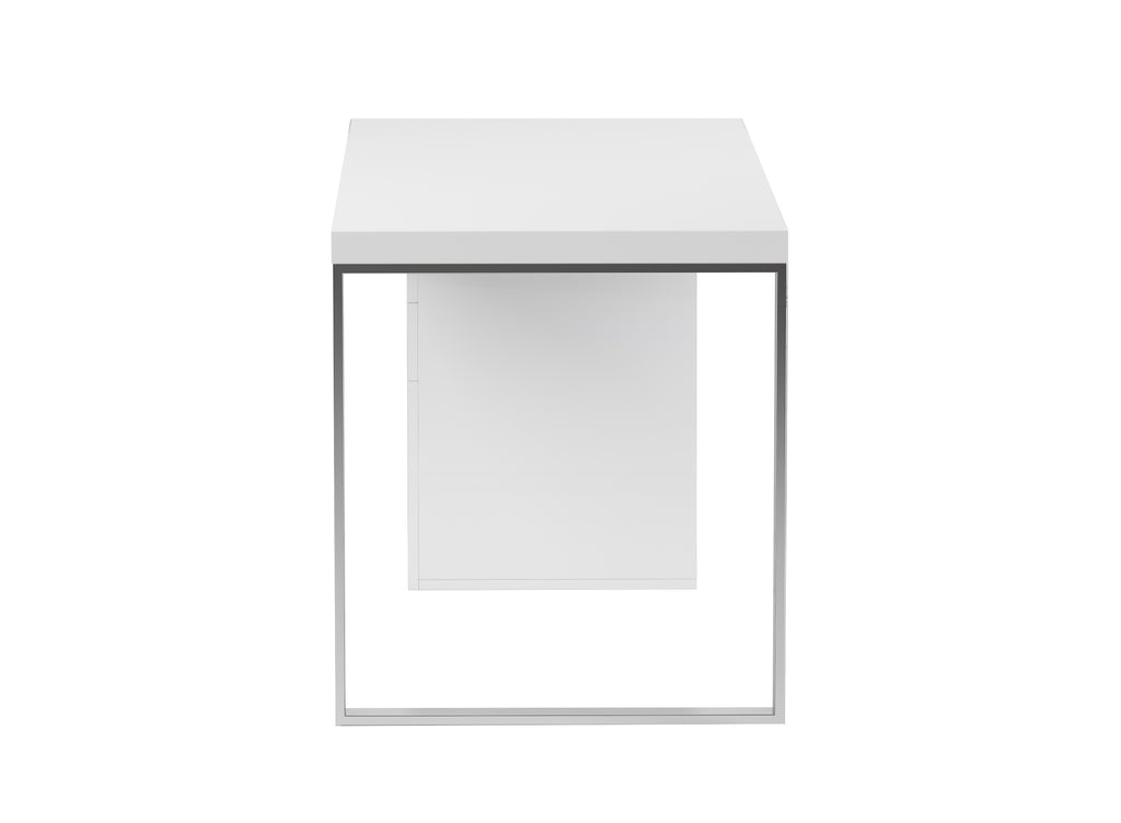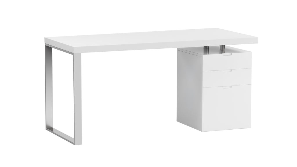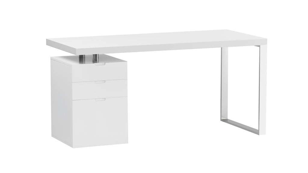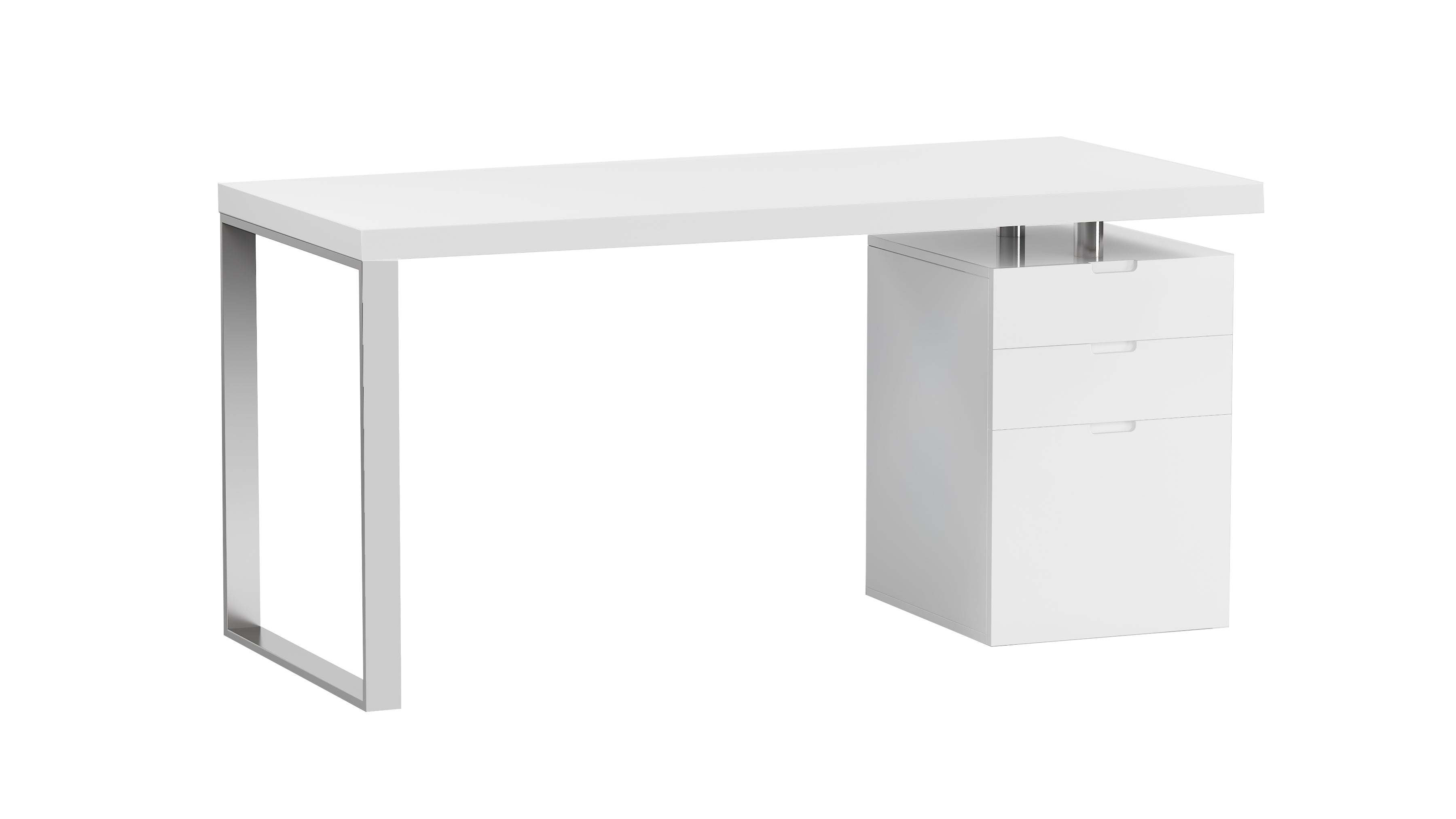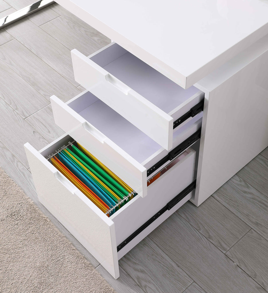 Check out the functionality and sleek styling of this rotating desk. Perfect for any workspace, this expansive wooden desk top with a glossy white finish sits atop polished stainless steel legs and features a useful matching 3-drawer filing cabinet. With a bottom drawer suited for larger storage items and a top that can rotate to fit any space, this piece is a great addition to any work from home set up.