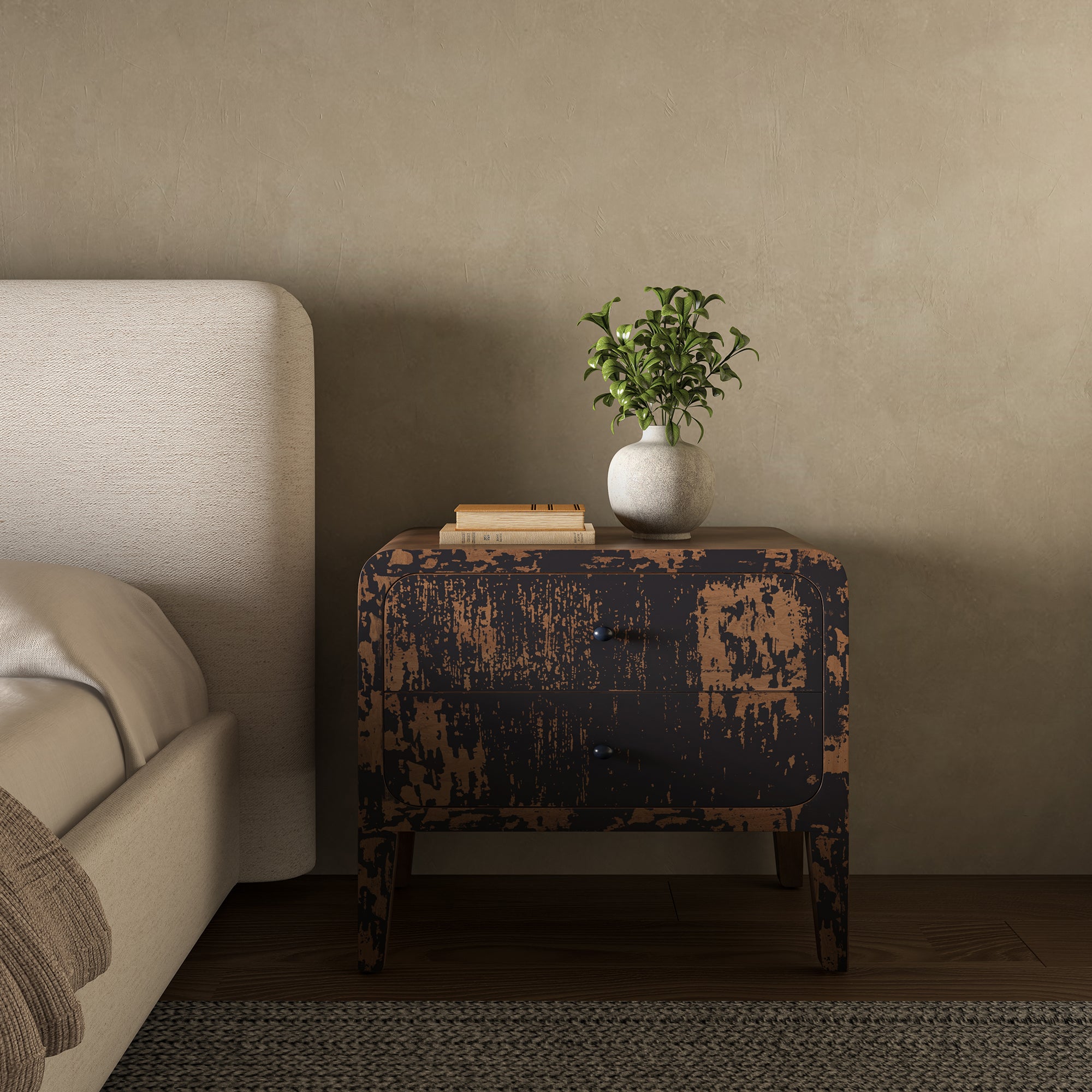 The Iris nightstand is crafted from mango wood with a carefully distressed finish and paired with minimal yet expressive hardware, paying homage to antique design while offering a fresh, contemporary edge. Its heavily distressed look captures a sense of history and character, making each piece uniquely its own. This piece combines structure and style, bringing a warm, rustic aesthetic to any bedroom.