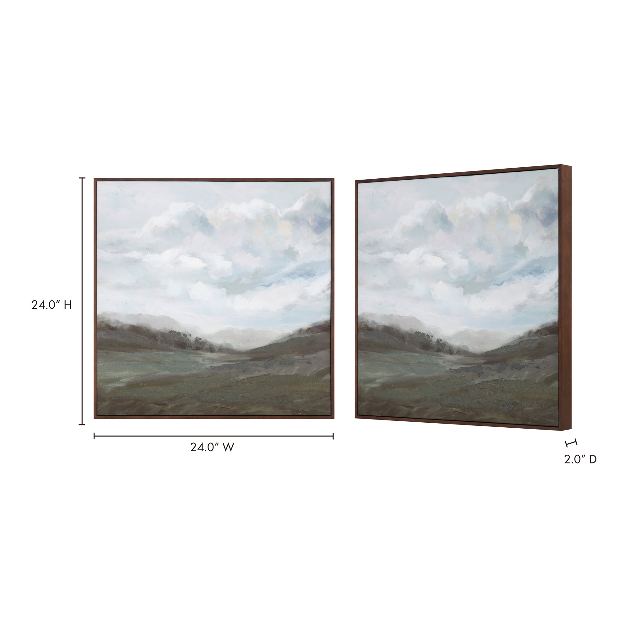 Natural World depicts a vast landscape. The painterly-like quality adds an air of romanticism to the rural scenes of nature. Soft, muted colors create a serene and comforting setting for the viewer, while the pine frame is stained in warm brown for a sentimental finish.