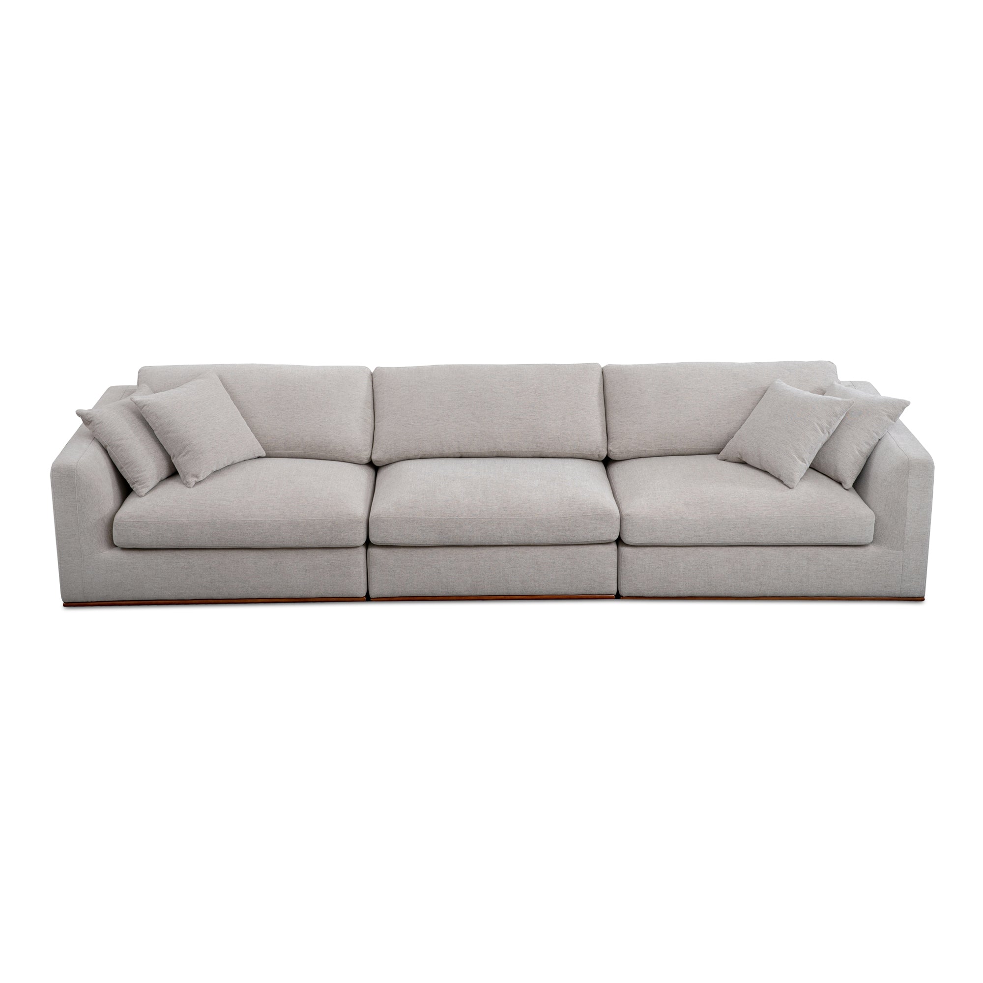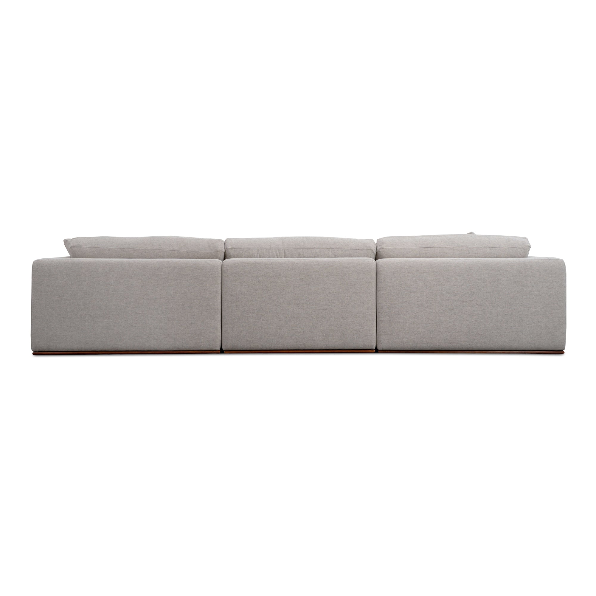 The Rue modular sectional features a generous 70% feather-fill topper within its seating, accompanied by toss cushions for an added layer of coziness. Its elegant silhouette is highlighted by a rubber wood base, creating a sleek floating appearance, all supported by subtle wooden legs. Designed with extreme comfort in mind, this modular embodies easy, neutral styling.