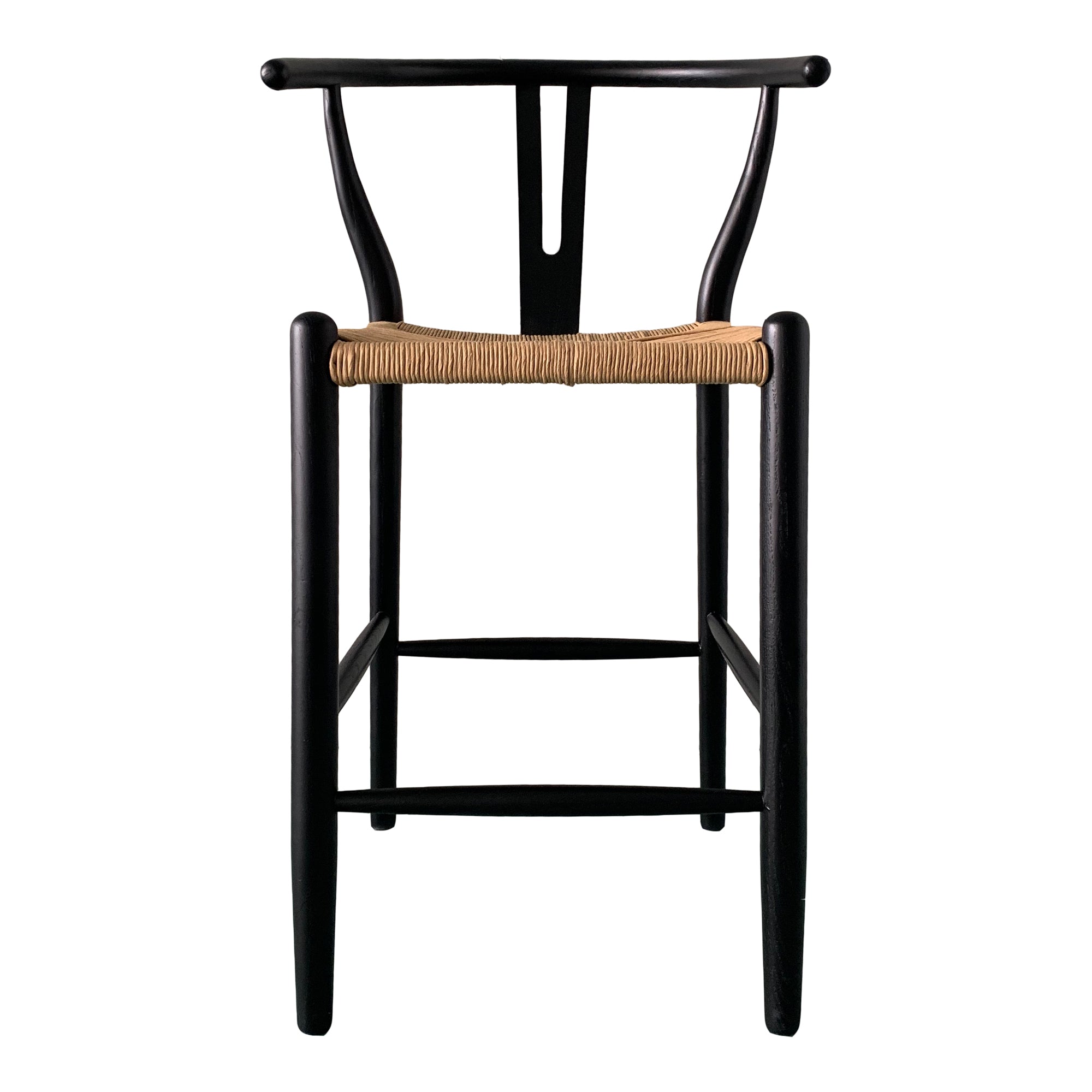 The Ventana counter stool flaunts sweet juxtaposition with its simple, sturdy construction, contemporary woven paper fiber seat, and convenient wrap around footrest. Dressed in natural elements, these designs are simple but with idiosyncrasies all of their own. Fitting for bar or counter-height, this stylish stool's frame is composed of solid elm wood with a black, semi-gloss finish, while its fiber seat is stunning in a natural color scheme. The Ventana design comes in various heights and shapes to better suit your home needs.
